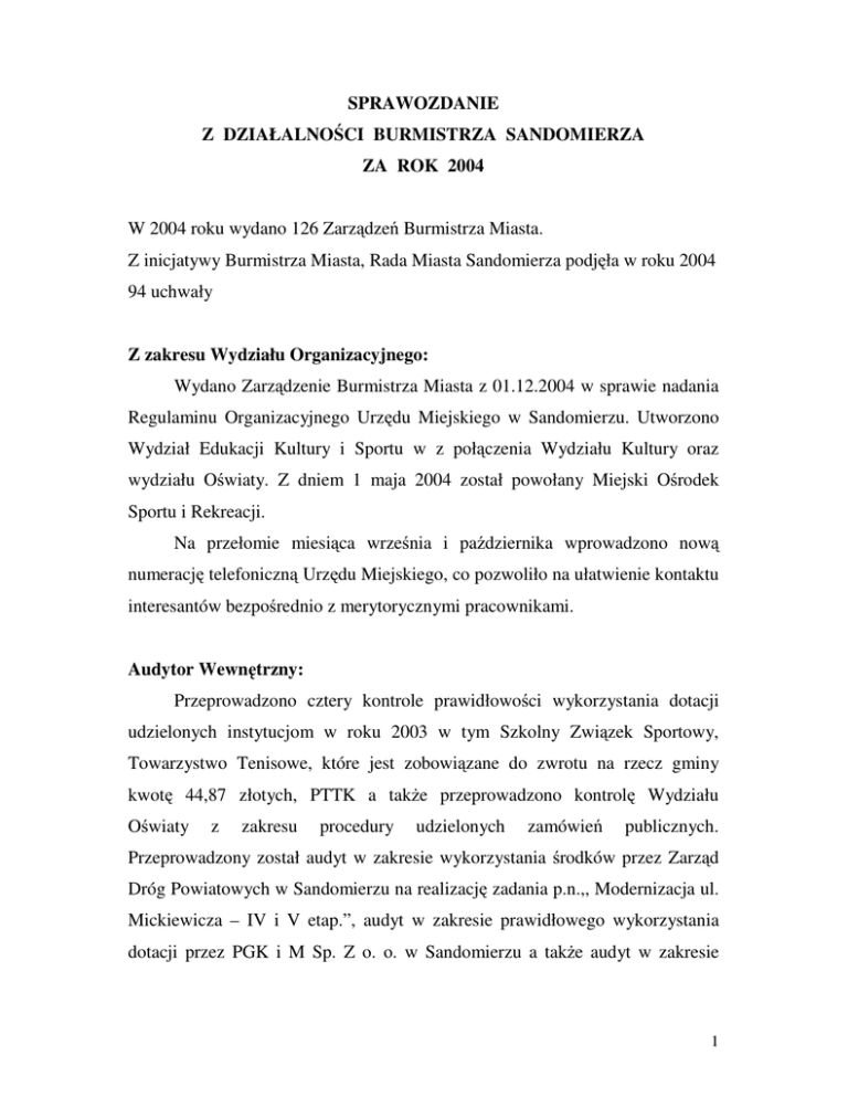 SPRAWOZDANIE Z DZIAŁALNOŚCI BURMISTRZA SANDOMIERZA