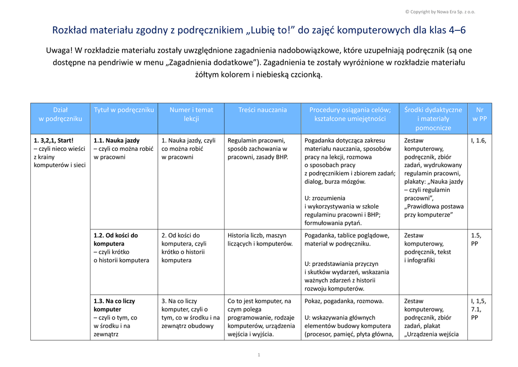 © Copyright by Nowa Era Sp. z o.o. Rozkład materiału zgodny z podręcznikiem „Lubię to!” do zajęć komputerowych dla klas 4–6 Uwaga! W rozkładzie materiału zostały uwzględnione zagadnienia nadobowiązkowe, które uzupełniają podręcznik (są one dostępne na pendriwie w menu „Zagadnienia dodatkowe”). Zagadnienia te zostały wyróżnione w rozkładzie materiału żółtym kolorem i niebieską czcionką. Dział w podręczniku Tytuł w podręczniku 1. 3,2,1, Start! – czyli nieco wieści z krainy komputerów i sieci 1.1. Nauka jazdy – czyli co można robić w pracowni Numer i temat lekcji 1. Nauka jazdy, czyli co można robić w pracowni Treści nauczania Regulamin pracowni, sposób zachowania w pracowni, zasady BHP. Procedury osiągania celów; kształcone umiejętności Środki dydaktyczne i materiały pomocnicze Nr w PP Pogadanka dotycząca zakresu materiału nauczania, sposobów pracy na lekcji, rozmowa o sposobach pracy z podręcznikiem i zbiorem zadań; dialog, burza mózgów. Zestaw komputerowy, podręcznik, zbiór zadań, wydrukowany regulamin pracowni, plakaty: „Nauka jazdy – czyli regulamin pracowni”, „Prawidłowa postawa przy komputerze” I, 1.6, Zestaw komputerowy, podręcznik, tekst i infografiki 1.5, PP Zestaw komputerowy, podręcznik, zbiór zadań, plakat „Urządzenia wejścia I, 1,5, 7.1, PP U: zrozumienia i wykorzystywania w szkole regulaminu pracowni i BHP; formułowania pytań. 1.2. Od kości do komputera – czyli krótko o historii komputera 2. Od kości do komputera, czyli krótko o historii komputera Historia liczb, maszyn liczących i komputerów. 1.3. Na co liczy komputer – czyli o tym, co w środku i na zewnątrz 3. Na co liczy komputer, czyli o tym, co w środku i na zewnątrz obudowy Co to jest komputer, na czym polega programowanie, rodzaje komputerów, urządzenia wejścia i wyjścia. Pogadanka, tablice poglądowe, materiał w podręczniku. U: przedstawiania przyczyn i skutków wydarzeń, wskazania ważnych zdarzeń z historii rozwoju komputerów. 1 Pokaz, pogadanka, rozmowa. U: wskazywania głównych elementów budowy komputera (procesor, pamięć, płyta główna, © Copyright by Nowa Era Sp. z o.o. Dział w podręczniku Tytuł w podręczniku 1.4. Systemowe operacje i szczotka – czyli o systemach, programach i plikach Numer i temat lekcji 4. Systemowe operacje i szczotka, czyli o systemach, programach i plikach Treści nauczania Procedury osiągania celów; kształcone umiejętności Środki dydaktyczne i materiały pomocnicze Nr w PP HDD, CD-ROM); rozpoznawania urządzeń wejścia i wyjścia. i wyjścia/Systemy operacyjne” Czym są systemy operacyjne, główne systemy, aplikacje komercyjne i niekomercyjne, rozróżnienie pliku od folderu, kopiowanie plików i tworzenie folderów. Pokaz, pogadanka, praca przy komputerach (tworzenie folderów i kopiowanie plików). Zestaw komputerowy, podręcznik, zbiór zadań, plakat „Urządzenia wejścia i wyjścia/Systemy operacyjne” 1.3, 3.2, 6.2 Jak zrozumieć internet, do czego służy, krótka historia powstania internetu. Pokaz, pogadanka. Zestaw komputerowy, podręcznik, zbiór zadań I, 1.6, 7.3 Zestaw komputerowy, podręcznik, słuchawki, zbiór zadań, plakat 7.2, 7.3 Zestaw komputerowy, podręcznik, słuchawki, zbiór zadań, plakat 7.2, 7.3 Zestaw 7.2, U: wskazywania różnic między komercyjnymi a nie komercyjnymi systemami i aplikacjami, tworzenia folderów i kopiowania plików. 1.5. W sieci – czyli wstęp do internetu 5. W sieci, czyli wstęp do internetu 1.6. Nie daj się wciągnąć w sieć – czyli o bezpieczeństwie w internecie 6. Nie daj się wciągnąć w sieć, czyli o bezpieczeństwie w internecie Bezpieczny internet, podejrzane strony, kontakty z nieznajomymi, serwisy społecznościowe, uzależnienie od komputera i internteu. Pogadanka, kurs e-learningowy 7. Nie daj się wciągnąć w sieć, czyli o bezpieczeństwie w internecie Bezpieczny internet, podejrzane strony, kontakty z nieznajomymi, serwisy społecznościowe, uzależnienie od komputera i internteu. Pogadanka, kurs e-learningowy 8. Nie daj się Bezpieczny internet, Pogadanka, kurs e-learningowy. 2 U: wskazywania charakterystycznych cech internetu, wskazywania ważnych zdarzeń z historii rozwoju internetu, przedstawiania przyczyn i skutków wydarzeń. U: rozpoznawania zagrożeń związanych z korzystaniem z komputera i z internetu, obrony przed tymi zagrożeniami. U: rozpoznawania zagrożeń związanych z korzystaniem z komputera i z internetu, obrony przed tymi zagrożeniami. © Copyright by Nowa Era Sp. z o.o. Dział w podręczniku Tytuł w podręczniku Numer i temat lekcji Treści nauczania wciągnąć w sieć, czyli o bezpieczeństwie w internecie podejrzane strony, kontakty z nieznajomymi, serwisy społecznościowe, uzależnienie od komputera i internteu. 1.7. Szukać każdy może – czyli o wyszukiwaniu informacji przez internet 9. Szukać każdy może, czyli o wyszukiwaniu informacji przez internet Wyszukiwanie tekstu w internecie, źródła informacji: Wikipedia, słowniki, encyklopedia online, usługa googletranslate (tłumaczenie tekstów online). Pogadanka, pokaz, turniej. 1.8. Między rozrywką a prawem – czyli wyszukiwanie zaawansowane i aspekty prawne pobierania plików z internetu 10. Między rozrywką a prawem, czyli wyszukiwanie zaawansowane i aspekty prawne pobierania plików z internetu Aspekty prawne korzystania z tekstów i zdjęć zamieszczonych w internecie, wyszukiwanie tekstu, wyszukiwanie obrazów i opcje wyszukiwania. Pokaz, ćwiczenia praktyczne. 11. Między rozrywką a prawem, czyli wyszukiwanie zaawansowane i aspekty prawne pobierania plików z internetu Wyszukiwanie plików audio, wideo oraz map. Aspekty prawne pobierania plików z internetu, prawo autorskie, licencja creative commons, wyszukiwarka CC., korzystanie z google.maps, korzystanie z PrtScr (kopiowanie fragmentów strony do programu Word). Pokaz, ćwiczenie praktyczne. 3 Procedury osiągania celów;