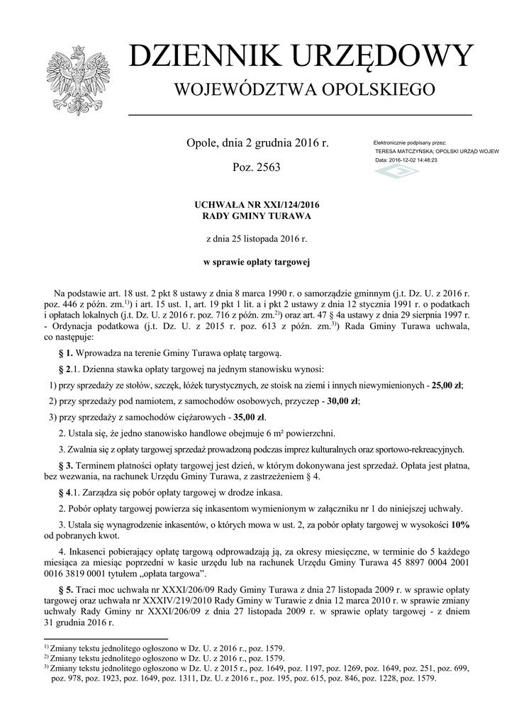 DZIENNIK URZĘDOWY WOJEWÓDZTWA OPOLSKIEGO Opole, dnia 2 grudnia 2016 r. Elektronicznie podpisany przez: TERESA MATCZYŃSKA; OPOLSKI URZĄD WOJEWÓDZKI Poz. 2563 Data: 2016-12-02 14:48:23 UCHWAŁA NR XXI/124/2016 RADY GMINY TURAWA z dnia 25 listopada 2016 r. w sprawie opłaty targowej Na podstawie art. 18 ust. 2 pkt 8 ustawy z dnia 8 marca 1990 r. o samorządzie gminnym (j.t. Dz. U. z 2016 r. poz. 446 z późn. zm.1)) i art. 15 ust. 1, art. 19 pkt 1 lit. a i pkt 2 ustawy z dnia 12 stycznia 1991 r. o podatkach i opłatach lokalnych (j.t. Dz. U. z 2016 r. poz. 716 z późn. zm.2)) oraz art. 47 § 4a ustawy z dnia 29 sierpnia 1997 r. - Ordynacja podatkowa (j.t. Dz. U. z 2015 r. poz. 613 z późn. zm.3)) Rada Gminy Turawa uchwala, co następuje: § 1. Wprowadza na terenie Gminy Turawa opłatę targową. § 2.1. Dzienna stawka opłaty targowej na jednym stanowisku wynosi: 1) przy sprzedaży ze stołów, szczęk, łóżek turystycznych, ze stoisk na ziemi i innych niewymienionych - 25,00 zł; 2) przy sprzedaży pod namiotem, z samochodów osobowych, przyczep - 30,00 zł; 3) przy sprzedaży z samochodów ciężarowych - 35,00 zł. 2. Ustala się, że jedno stanowisko handlowe obejmuje 6 m² powierzchni. 3. Zwalnia się z opłaty targowej sprzedaż prowadzoną podczas imprez kulturalnych oraz sportowo-rekreacyjnych. § 3. Terminem płatności opłaty targowej jest dzień, w którym dokonywana jest sprzedaż. Opłata jest płatna, bez wezwania, na rachunek Urzędu Gminy Turawa, z zastrzeżeniem § 4. § 4.1. Zarządza się pobór opłaty targowej w drodze inkasa. 2. Pobór opłaty targowej powierza się inkasentom wymienionym w załączniku nr 1 do niniejszej uchwały. 3. Ustala się wynagrodzenie inkasentów, o których mowa w ust. 2, za pobór opłaty targowej w wysokości 10% od pobranych kwot. 4. Inkasenci pobierający opłatę targową odprowadzają ją, za okresy miesięczne, w terminie do 5 każdego miesiąca za miesiąc poprzedni w kasie urzędu lub na rachunek Urzędu Gminy Turawa 45 8897 0004 2001 0016 3819 0001 tytułem „opłata targowa”. § 5. Traci moc uchwała nr XXXI/206/09 Rady Gminy Turawa z dnia 27 listopada 2009 r. w sprawie opłaty targowej oraz uchwała nr XXXIV/219/2010 Rady Gminy w Turawie z dnia 12 marca 2010 r. w sprawie zmiany uchwały Rady Gminy nr XXXI/206/09 z dnia 27 listopada 2009 r. w sprawie opłaty targowej - z dniem 31 grudnia 2016 r. Zmiany tekstu jednolitego ogłoszono w Dz. U. z 2016 r., poz. 1579. Zmiany tekstu jednolitego ogłoszono w Dz. U. z 2016 r., poz. 1579. 3) Zmiany tekstu jednolitego ogłoszono w Dz. U. z 2015 r., poz. 1649, poz. 1197, poz. 1269, poz. 1649, poz. 251, poz. 699, poz. 978, poz. 1923, poz. 1649, poz. 1311, Dz. U. z 2016 r., poz. 195, poz. 615, poz. 846, poz. 1228, poz. 1579. 1) 2) Dziennik Urzędowy Województwa Opolskiego –2– Poz. 2563 § 6. Wykonanie uchwały powierza się Wójtowi Gminy Turawa. § 7. Uchwała podlega ogłoszeniu w Dzienniku Urzędowym Województwa Opolskiego i wchodzi w życie po upływie 14 dni od dnia ogłoszenia, z mocą obowiązującą od 1 stycznia 2017 r. Przewodniczący Rady Gminy Turawa Artur Gallus Dziennik Urzędowy Województwa Opolskiego –3– Poz. 2563 Załącznik do uchwały nr XXI/124/2016 Rady Gminy Turawa z dnia 25 listopada 2016 r. WYKAZ INKASENTÓW OPŁATY TARGOWEJ 1) Na terenie miejscowości Bierdzany – Pani Rita Gabryś; 2) Na terenie miejscowości Kadłub Turawski – Pan Ernest Grzesik; 3) Na terenie miejscowości Kotórz Mały – Pani Krystyna Wieczorek; 4) Na terenie miejscowości Kotórz Wielki – Pani Monika Twardawska; 5) Na terenie miejscowości Ligota Turawska – Pani Danuta Matysek; 6) Na terenie miejscowości Osowiec – Pan Bernard Loch; 7) Na terenie miejscowości Rzędów – Pani Beata Mazur; 8) Na terenie miejscowości Turawa – Pani Teresa Żulewska oraz Pan Waldemar Kupka; 9) Na terenie miejscowości Węgry – Pani Róża Wieczorek; 10) Na terenie miejscowości Zakrzów Turawski – Pan Jerzy Zubeil; 11) Na terenie miejscowości Zawada – Pan Dominik Pikos oraz Pan Mariusz Gumowski.