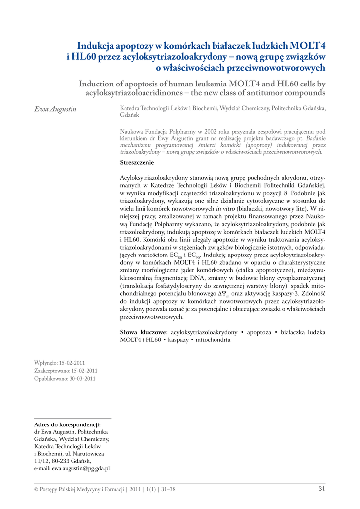 Indukcja apoptozy w komórkach białaczek ludzkich MOLT4 i HL60 przez acyloksytriazoloakrydony – nową grupę związków o właściwościach przeciwnowotworowych Induction of apoptosis of human leukemia MOLT4 and HL60 cells by acyloksytriazoloacridinones – the new class of antitumor compounds Ewa Augustin Katedra Technologii Leków i Biochemii, Wydział Chemiczny, Politechnika Gdańska, Gdańsk Naukowa Fundacja Polpharmy w 2002 roku przyznała zespołowi pracującemu pod kierunkiem dr Ewy Augustin grant na realizację projektu badawczego pt. Badanie mechanizmu programowanej śmierci komórki (apoptozy) indukowanej przez triazoloakrydony – nową grupę związków o właściwościach przeciwnowotworowych. Streszczenie Acyloksytriazoloakrydony stanowią nową grupę pochodnych akrydonu, otrzymanych w Katedrze Technologii Leków i Biochemii Politechniki Gdańskiej, w wyniku modyfikacji cząsteczki triazoloakrydonu w pozycji 8. Podobnie jak triazoloakrydony, wykazują one silne działanie cytotoksyczne w stosunku do wielu linii komórek nowotworowych in vitro (białaczki, nowotwory lite). W niniejszej pracy, zrealizowanej w ramach projektu finansowanego przez Naukową Fundację Polpharmy wykazano, że acyloksytriazoloakrydony, podobnie jak triazoloakrydony, indukują apoptozę w komórkach białaczek ludzkich MOLT4 i HL60. Komórki obu linii ulegały apoptozie w wyniku traktowania acyloksytriazoloakrydonami w stężeniach związków biologicznie istotnych, odpowiadających wartościom EC80 i EC90. Indukcję apoptozy przez acyloksytriazoloakrydony w komórkach MOLT4 i HL60 zbadano w oparciu o charakterystyczne zmiany morfologiczne jąder komórkowych (ciałka apoptotyczne), międzynukleosomalną fragmentację DNA, zmiany w budowie błony cytoplazmatycznej (translokacja fosfatydyloseryny do zewnętrznej warstwy błony), spadek mitochondrialnego potencjału błonowego ∆Ψm oraz aktywację kaspazy-3. Zdolność do indukcji apoptozy w komórkach nowotworowych przez acyloksytriazoloakrydony pozwala uznać je za potencjalne i obiecujące związki o właściwościach przeciwnowotworowych. Słowa kluczowe: acyloksytriazoloakrydony • apoptoza • białaczka ludzka MOLT4 i HL60 • kaspazy • mitochondria Wpłynęło: 15-02-2011 Zaakceptowano: 15-02-2011 Opublikowano: 30-03-2011 Adres do korespondencji: dr Ewa Augustin, Politechnika Gdańska, Wydział Chemiczny, Katedra Technologii Leków i Biochemii, ul. Narutowicza 11/12, 80-233 Gdańsk, e-mail: [email protected] © Postępy Polskiej Medycyny i Farmacji | 2011 | 1(1) | 31–38 31 Augustin E. – Indukcja apoptozy w komórkach białaczek ludzkich MOLT4 i HL60 przez acyloksytriazoloakrydony… Summary Acyloksytriazoloacridinones are a new group of acridinone derivatives synthesized and devoloped at the Department of Pharmaceutical Technology and Biochemistry at Gdańsk University of Technology, by the modification of the triazoloacridinone at position 8. Like triazoloacridinones, they exhibit a strong cytotoxic activity against several tumor cell lines in vitro (leukemias, solid tumors). Studies carried out under the project funded by the Polpharma Scientific Foundation, demonstrated that acyloksytriazoloacridinones, like triazoloacridinones, induced apoptosis in human leukemia MOLT4 and HL60 cells. Cells of both lines underwent apoptosis following acyloksytriazoloacridinones treatment at biological relevant concentrations, corresponding to EC80 and EC90 values. Induction of apoptosis by acyloksytriazoloacridinones in MOLT4 and HL60 cells was examined on the basis of characteristic morphological changes of cells nuclei (the presence of apoptotic bodies), appearance of internucleosomal DNA fragmentation, changes in the structure of the plasma membrane (translocation of phosphatydilserine to the outer layer of membrane), decrease of the mitochondrial transmembrane potential ∆Ψm and activation of caspase-3. The ability of acyloksytriaozoloacridinones to induce apoptosis in tumor cells allows us to consider them as a potent and promising antitumor agents. Key words: acyloksytriazoloacridinones • apoptosis • human leukemia MOLT4 and HL60 • caspases • mitochondria Wstęp Powstawanie nowotworów przez długi czas rozpatrywane było jako efekt niekontrolowanej proliferacji komórek, które uległy transformacji nowotworowej. Konsekwencją takiego podejścia było poszukiwanie związków i leków jedynie pod kątem ich właściwości antyproliferacyjnych. Obecnie zagadnienie powstawania i wzrostu nowotworów jest postrzegane jako zaburzenie równowagi pomiędzy tempem proliferacji, a śmiercią komórek, które uległy transformacji nowotworowej [1,2]. Progresja nowotworu i wzrost stopnia złośliwości zależą również od zmian w podatności komórek do ulegania spontanicznej śmierci – apoptozie. Stąd też poszukuje się związków i leków, które przywróciłyby komórkom nowotworowym zdolność do samoeliminacji, którą zatraciły w wyniku wyłamania się spod kontroli mechanizmów decydujących o ich podziałach i lokalizacji. W Katedrze Technologii Leków i Biochemii Politechniki Gdańskiej, w zespole kierowanym przez prof. Jerzego Konopę, od wielu lat prowadzi się badania nad poszukiwaniem związków o właściwościach przeciwnowotworowych wśród pochodnych akrydyny. Badania te doprowadziły m.in. do otrzymania pierwszego i jak dotąd jedynego, oryginalnego polskiego leku przeciwnowotworowego o nazwie Ledakrin (Nitracrine) [3]. Kolejną grupą związków przeciwnowotworowych otrzymanych w Katedrze Technologii Leków i Biochemii były imidazoakrydony, spośród których najbardziej aktywna biologicznie 32 pochodna, związek o symbolu C-1311, dotarł do II fazy badań klinicznych na pacjentkach z przerzutowym rakiem piersi [4,5]. Triazoloakrydony stanowią następną grupę pochodnych akrydyny zsyntetyzowanych na Politechnice Gdańskiej [6]. Związki te są analogami strukturalnymi wspomnianych wyżej imidazoakrydonów. Tria