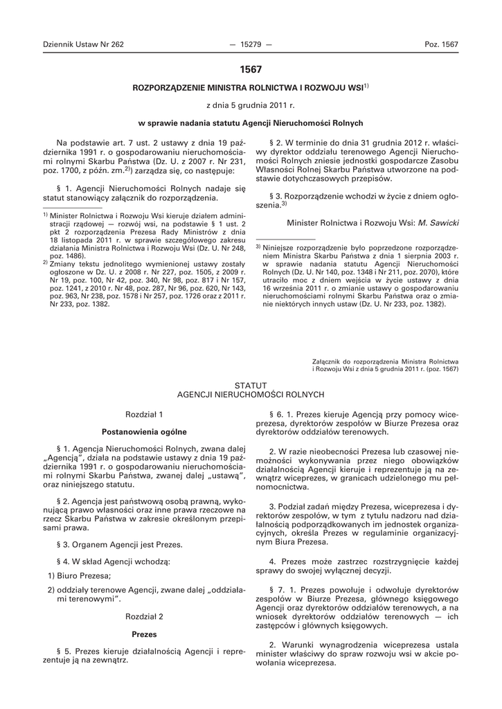 Dziennik Ustaw Nr 262 — 15279 — Poz. 1567 1567 ROZPORZĄDZENIE MINISTRA ROLNICTWA I ROZWOJU WSI1) z dnia 5 grudnia 2011 r. w sprawie nadania statutu Agencji Nieruchomości Rolnych Na podstawie art. 7 ust. 2 ustawy z dnia 19 października 1991 r. o gospodarowaniu nieruchomościami rolnymi Skarbu Państwa (Dz. U. z 2007 r. Nr 231, poz. 1700, z późn. zm.2)) zarządza się, co następuje: § 1. Agencji Nieruchomości Rolnych nadaje się statut stanowiący załącznik do rozporządzenia. § 2. W terminie do dnia 31 grudnia 2012 r. właściwy dyrektor oddziału terenowego Agencji Nieruchomości Rolnych zniesie jednostki gospodarcze Zasobu Własności Rolnej Skarbu Państwa utworzone na podstawie dotychczasowych przepisów. § 3. Rozporządzenie wchodzi w życie z dniem ogłoszenia.3) 1) Minister Rolnictwa i Rozwoju Wsi kieruje działem administracji rządowej — rozwój wsi, na podstawie § 1 ust. 2 pkt 2 rozporządzenia Prezesa Rady Ministrów z dnia 18 listopada 2011 r. w sprawie szczegółowego zakresu działania Ministra Rolnictwa i Rozwoju Wsi (Dz. U. Nr 248, poz. 1486). 2) Zmiany tekstu jednolitego wymienionej ustawy zostały ogłoszone w Dz. U. z 2008 r. Nr 227, poz. 1505, z 2009 r. Nr 19, poz. 100, Nr 42, poz. 340, Nr 98, poz. 817 i Nr 157, poz. 1241, z 2010 r. Nr 48, poz. 287, Nr 96, poz. 620, Nr 143, poz. 963, Nr 238, poz. 1578 i Nr 257, poz. 1726 oraz z 2011 r. Nr 233, poz. 1382. Minister Rolnictwa i Rozwoju Wsi: M. Sawicki 3) Niniejsze rozporządzenie było poprzedzone rozporządzeniem Ministra Skarbu Państwa z dnia 1 sierpnia 2003 r. w sprawie nadania statutu Agencji Nieruchomości Rolnych (Dz. U. Nr 140, poz. 1348 i Nr 211, poz. 2070), które utraciło moc z dniem wejścia w życie ustawy z dnia 16 września 2011 r. o zmianie ustawy o gospodarowaniu nieruchomościami rolnymi Skarbu Państwa oraz o zmianie niektórych innych ustaw (Dz. U. Nr 233, poz. 1382). Załącznik do rozporządzenia Ministra Rolnictwa i Rozwoju Wsi z dnia 5 grudnia 2011 r. (poz. 1567) STATUT AGENCJI NIERUCHOMOŚCI ROLNYCH Postanowienia ogólne § 6. 1. Prezes kieruje Agencją przy pomocy wiceprezesa, dyrektorów zespołów w Biurze Prezesa oraz dyrektorów oddziałów terenowych. § 1. Agencja Nieruchomości Rolnych, zwana dalej „Agencją”, działa na podstawie ustawy z dnia 19 października 1991 r. o gospodarowaniu nieruchomościami rolnymi Skarbu Państwa, zwanej dalej „ustawą”, oraz niniejszego statutu. 2. W razie nieobecności Prezesa lub czasowej niemożności wykonywania przez niego obowiązków działalnością Agencji kieruje i reprezentuje ją na zewnątrz wiceprezes, w granicach udzielonego mu pełnomocnictwa. Rozdział 1 § 2. Agencja jest państwową osobą prawną, wykonującą prawo własności oraz inne prawa rzeczowe na rzecz Skarbu Państwa w zakresie określonym przepisami prawa. § 3. Organem Agencji jest Prezes. § 4. W skład Agencji wchodzą: 1) Biuro Prezesa; 2) oddziały terenowe Agencji, zwane dalej „oddziałami terenowymi”. Rozdział 2 3. Podział zadań między Prezesa, wiceprezesa i dyrektorów zespołów, w tym z tytułu nadzoru nad działalnością podporządkowanych im jednostek organizacyjnych, określa Prezes w regulaminie organizacyjnym Biura Prezesa. 4. Prezes może zastrzec rozstrzygnięcie każdej sprawy do swojej wyłącznej decyzji. § 7. 1. Prezes powołuje i odwołuje dyrektorów zespołów w Biurze Prezesa, głównego księgowego Agencji oraz dyrektorów oddziałów terenowych, a na wniosek dyrektorów oddziałów terenowych — ich zastępców i głównych księgowych. Prezes § 5. Prezes kieruje działalnością Agencji i reprezentuje ją na zewnątrz. 2. Warunki wynagrodzenia wiceprezesa ustala minister właściwy do spraw rozwoju wsi w akcie powołania wiceprezesa. Dziennik Ustaw Nr 262 — 15280 — 3. Prezes określa warunki pracy i wynagrodzenia osób, o których mowa w ust. 1, a także zawiera umowy o pracę oraz wykonuje inne czynności z zakresu prawa pracy w stosunku do pozostałych pracowników Agencji. 4. Do zawierania umów o pracę oraz dokonywania innych czynności z zakresu prawa pracy Prezes może upoważnić, w formie pisemnej, innych pracowników Agencji. Rozdział 3 Biuro Prezesa § 8. 1. W skład Biura Prezesa wchodzą zespoły i samodzielne stanowiska pracy. Pracami zespołów kierują dyrektorzy i ich zastępcy. 2. Liczbę zespołów i samodzielnych stanowisk pracy, ich organizację wewnętrzną oraz zadania określa regulamin, o którym mowa w § 6 ust. 3. 3. Prezes może powoływać stałe i doraźne zespoły opiniodawczo-doradcze lub problemowe, określając ich nazwę, skład osobowy, zakres zadań oraz tryb pracy. § 9. Do zadań Biura Prezesa należy w szczególności: Poz. 1567 2) przygotowywanie projektu planu finansowego Agencji i planu finansowego Zasobu oraz kontrola realizacji tych planów; 3) organizowanie i nadzorowanie ewidencji mienia Zasobu; 4) wykonywanie praw z akcji i udziałów w spółkach, o których mowa w art. 5 ust. 6 ustawy; 5) organizowanie i zapewnienie funkcjonowania w Agencji systemów informatycznych; 6) opracowywanie analiz, raportów i informacji dotyczących działalności Agencji; 7) przygotowywanie projektów o których mowa w rozdziale 5; pełnomocnictw, 8) przeprowadzanie kontroli wewnętrznej zgodnie z przepisami rozdziału 6; 9) przeprowadzanie audytu wewnętrznego zgodnie z przepisami o finansach publicznych; 10) sprawowanie nadzoru nad pracą oddziałów terenowych. Rozdział 4 Oddziały terenowe Agencji 1) opracowywanie projektów wytycznych i procedur dotyczących: § 10. 1. Oddziały terenowe obejmują swoim zasięgiem terytorialnym następujące województwa: a) przejmowania mienia do Zasobu Własności Rolnej Skarbu Państwa, zwanego dalej „Zasobem”, 1) dolnośląskie — oddział terenowy z siedzibą we Wrocławiu, b) gospodarowania mieniem Zasobu w formach przewidzianych w ustawie, c) sprawowania nadzoru właścicielskiego nad mieniem Zasobu, d) prowadzenia rachunkowoś