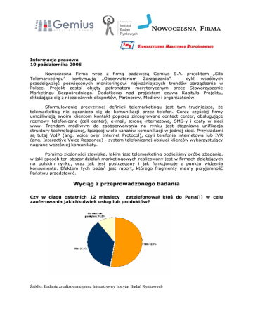 Informacja prasowa 10 października 2005 Nowoczesna Firma wraz z firmą badawczą Gemius S.A. projektem „Siła Telemarketingu” kontynuują „Obserwatorium Zarządzania” – cykl wspólnych przedsięwzięć poświęconych monitoringowi najważniejszych trendów zarządzania w Polsce. Projekt został objęty patronatem merytorycznym przez Stowarzyszenie Marketingu Bezpośredniego. Dodatkowo nad projektem czuwa Kapituła Projektu, składająca się z niezależnych ekspertów, Partnerów, Mediów i organizatorów. Sformułowanie precyzyjnej definicji telemarketingu jest tym trudniejsze, że telemarketing nie ogranicza się do komunikacji przez telefon. Coraz częściej firmy umożliwiają swoim klientom kontakt poprzez zintegrowane contact center, obsługujące rozmowy telefoniczne (call center), e-mail, stronę internetową, SMS-y i czaty w sieci www. Trendem możliwym do zaobserwowania na rynku jest stopniowa unifikacja struktury technologicznej, łączącej wiele kanałów komunikacji w jednej sieci. Przykładami są tutaj VoIP (ang. Voice over Internet Protocol), czyli telefonia internetowa lub IVR (ang. Interactive Voice Responce) - system telefonicznej obsługi klientów wykorzystujący nagrane wcześniej komunikaty. Pomimo złożoności zjawiska, jakim jest telemarketing podjęliśmy próbę zbadania, w jaki sposób ten obszar działań marketingowych realizowany jest w firmach działających na polskim rynku, oraz jak jest postrzegany i jak funkcjonuje z punktu widzenia konsumenta. Efektem tych badań jest raport, którego fragmenty mamy przyjemność Państwu przedstawić. Wyciąg z przeprowadzonego badania Czy w ciągu ostatnich 12 miesięcy zatelefonował ktoś do Pana(i) w celu zaoferowania jakichkolwiek usług lub produktów? Źródło: Badanie zrealizowane przez Interaktywny Instytut Badań Rynkowych Czego dotyczyły przedstawiane oferty? Źródło: Badanie zrealizowane przez Interaktywny Instytut Badań Rynkowych Jeżeli 1/3 konsumentów jest zainteresowana tylko jedną z czterech przedstawianych ofert, a połowa spośród zainteresowanych ofertą z niej korzysta można oszacować, że jedna na 24 oferty kończy się sprzedażą. Czy kiedykolwiek zdarzyło się Panu(i) telefonować do telefonicznych punktów obsługi klienta ? Źródło: Badanie zrealizowane przez Interaktywny Instytut Badań Rynkowych Do jakich celów wykorzystywany jest telemarketing w firmie? Źródło: Badanie zrealizowane przez Interaktywny Instytut Badań Rynkowych Celem raportu „Telemarketing 2005 – rynek i opinie konsumentów” jest przedstawienie kluczowych aspektów wykorzystywania telemarketingu w firmach oraz sposobów postrzegania tego rodzaju działalności przez klientów. Raport prezentuje wyniki trzech niezależnych modułów – badania internautów, badania firm oraz wywiadów eksperckich. Dzięki tak kompleksowej analizie prezentowane opracowanie w sposób całościowy charakteryzuje rynek usług telemarketingowych w Polsce i społeczną percepcję tej formy walki o klienta. „Celem każdej działalności telemarketingowej jest zdobycie klientów bądź podtrzymanie z nimi pozytywnych relacji. Aby ten cel zrealizować należy jak najlepiej poznać rynkową rzeczywistość i zastosować właściwe narzędzia. Temu zadaniu ma służyć raport” – wyjaśnia Maciej Milewski z Interaktywnego Instytutu Badań Rynkowych (IIBR). Telemarketing jest niewątpliwie jednym z najbardziej skutecznych i stosunkowo tanim sposobem nawiązania relacji pomiędzy firmą a potencjalnym klientem. Jednak obok zalet posiada także i wady. O sukcesie każdej firmy decyduje zarówno świadomość możliwości jak i ograniczeń. W przypadku branży tak rozwojowej i konkurencyjnej jak telemarketing, działania biznesowe potrzebują wsparcia analityczno-badawczego. Należy pamiętać, że znajomość rynku i oczekiwań klientów przekłada się na wynik finansowy. Więcej informacji na WWW.obserwatorium.nf.pl/telemarketing Podczas konferencji gość specjalny Pan Martin Veselka Genesys Telecommunications Laboratories Regional Manager przedstawił Rynek Contact Center – Polska, Europa, Świat Dlaczego jakość obsługi jest ważna? W dzisiejszych czasach w wyniku rozwoju zaciętej konkurencji na międzynarodowych rynkach, konsumenci zyskali dostęp do niewyobrażalnego bogactwa produktów i usług, które spełniają podobne standardy jakości i są oferowane po zbliżonych cenach. Wobec tego, to właśnie jakość obsługi klienta decyduje o sukcesie lub przegranej w walce o lojalnego klienta i przewagę konkurencyjną na rynku. Konsumenci zarówno zagranicą jak i w Polsce wymagają coraz wyższego poziomu obsługi. Lepsze relacje z klientami, zapewnienie im szybkiej i skutecznej pomocy oraz możliwości wyboru kanału komunikacji odpowiadającego ich preferencjom znacząco wpływa na poziom ich satysfakcji, który ma niemal bezpośrednie przełożenie na lojalność wobec danej firmy. Aż 95% klientów twierdzi, iż dokonaliby oni zakupu w oparciu o pozytywne doświadczenie z call center danej firmy. Natomiast 55% respondentów jest gotowych zaprzestać korzystania z usług firmy, jeśli ich doświadczenie z centrum obsługi klienta byłoby negatywne. Zdaniem konsumentów najważniejszymi wyznacznikami lojalności względem firmy jest dobry produkt i wysoka jakość obsługi klienta; dobra cena i marka odgrywają mniejszą rolę. Te wyniki, pochodzące z Raportu Genesys1, pierwszego takiego badania klientów w Polsce, świadczą o tym, jak ważnym elementem procesów biznesowych jest właśnie innowacyjne zarządzanie centrum obsługi klienta. Powody lojalności klientów względem firmy Dobry produkt 3% 2% Dobra obsługa 21% Dobra cena 51% 23% Marka, której można ufać Inne 1 Próba ogólnopolska złożona z 2 027 osób w wieku powyżej 18 lat. Badanie zrealizowane na zlecenie Genesys przez niezależną firmę badawczą Dimar. Jak to jest naprawdę? Mimo rozwijającej się wiedzy managerów centr