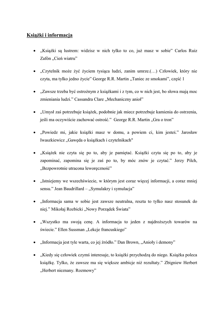 Książki i informacja „Książki są lustrem: widzisz w nich tylko to co, już masz w sobie” Carlos Ruiz Zafón „Cień wiatru” „Czytelnik może żyć życiem tysiąca ludzi, zanim umrze.(…) Człowiek, który nie czyta, ma tylko jedno życie” George R.R. Martin „Taniec ze smokami”, część 1 „Zawsze trzeba być ostrożnym z książkami i z tym, co w nich jest, bo słowa mają moc zmieniania ludzi.” Cassandra Clare „Mechaniczny anioł” „Umysł zaś potrzebuje książek, podobnie jak miecz potrzebuje kamienia do ostrzenia, jeśli ma oczywiście zachować ostrość.” George R.R. Martin „Gra o tron” „Powiedz mi, jakie książki masz w domu, a powiem ci, kim jesteś.” Jarosław Iwaszkiewicz „Gawęda o książkach i czytelnikach" „Książek nie czyta się po to, aby je pamiętać. Książki czyta się po to, aby je zapominać, zapomina się je zaś po to, by móc znów je czytać.” Jerzy Pilch, „Bezpowrotnie utracona leworęczność” „Istniejemy we wszechświecie, w którym jest coraz więcej informacji, a coraz mniej sensu.” Jean Baudrillard – „Symulakry i symulacja” „Informacja sama w sobie jest zawsze neutralna, reszta to tylko nasz stosunek do niej.” Mikołaj Rozbicki „Nowy Porządek Świata” „Wszystko ma swoją cenę. A informacja to jeden z najdroższych towarów na świecie.” Ellen Sussman „Lekcje francuskiego” „Informacja jest tyle warta, co jej źródło.” Dan Brown, „Anioły i demony” „Kiedy się człowiek czymś interesuje, to książki przychodzą do niego. Książka poleca książkę. Tylko, że zawsze ma się większe ambicje niż rezultaty.” Zbigniew Herbert „Herbert nieznany. Rozmowy” „Kiedy otwierasz książkę, wkraczasz jakby do teatru: najpierw jest kurtyna, odsuwasz ją i przedstawienie się zaczyna”. Cornelia Funke „Atramentowe serce” „Książką można czytelnikowi głowę, owszem przemeblować o tyle, o ile jakieś meble już w niej przed lekturą stały”. Stanisław Lem „Doskonała próżnia. Wielkość urojona” Najlepszymi książkami są te, które mówią nam, co już sami wiemy. George Orwell „Rok 1984” Nic nie jest stałe na tym świecie, ale książki zbliżają się do tego ideału. Jonathan Carroll “Zaślubiny patyków” Niektórych książek wystarczy skosztować, inne się połyka, a tylko nieliczne trzeba przeżuć i strawić do końca. Cornelia Funke „Atramentowe serce” „Kiedy przeczytam nową książkę, to tak jakbym znalazł nowego przyjaciela, a gdy przeczytam książkę, którą już czytałem - to tak jakbym spotkał się ze starym przyjacielem” przysłowie chińskie „Czytanie książek to najpiękniejsza zabawa, jaką sobie ludzkość wymyśliła” Wisława Szymborska „Najlepsze książki to te, o których każdy czytelnik sądzi, że takie by też napisał.” Blaise Pascal „Czytanie jest dla umysłu tym, czym gimnastyka dla ciała.” Richard Steele „Niektóre książki, jak się wydaje, zostały napisane nie po to, żeby się można czegoś z nich nauczyć, lecz abyśmy wiedzieli, że i autor coś wiedział”. Johann Wolfgang Goethe Ludzkie wybory „Czasami warto zmienić zdanie. To znaczy, że człowiek myśli” John Marsden – "Jutro 4" Przyjaciele mroku „To nasze wybory ukazują, kim naprawdę jesteśmy, o wiele bardziej, niż nasze zdolności”. Joanne Kathleen Rowling, “Harry Potter i Komnata Tajemnic” „Idź tam, gdzie prowadzi Cię serce, inaczej utracisz wszystko” Rick Riordan, “Złodzieje Pioruna” „Ludzie mają wrodzony talent do wybierania właśnie tego, co dla nich najgorsze.” Joanne Kathleen Rowling – „Harry Potter i Kamień Filozoficzny” „Lepiej bez celu iść naprzód niż bez celu stać w miejscu, a z pewnością o niebo lepiej, niż bez celu się cofać.” Andrzej Sapkowski „Wieża jaskółki” Przyjaźń/miłość/szczęście „Ludzie mają zbyt mało czasu, aby cokolwiek poznać. Kupują w sklepach rzeczy gotowe. A ponieważ nie ma magazynów z przyjaciółmi, więc ludzie nie mają przyjaciół” Antoine de Saint-Exupéry „Mały Książę” „Bywają wielkie zbrodnie na świecie, ale chyba największą jest zabić miłość.” Bolesław Prus „Lalka” „Miłość nie polega na tym, aby wzajemnie sobie się przyglądać, lecz aby patrzeć razem w tym samym kierunku” Antoine de Saint-Exupéry „Mały Książę” „Przyjaźń poznaje się po tym, że nic nie może jej zawieść, a prawdziwą miłość po tym, że nic nie może jej zniszczyć” Antoine de Saint-Exupéry „Mały Książę” „Szczęście nie polega na tym, żeby zdobyć to, czego pragniesz. Polega na tym, żeby pragnąć tego, co już masz”. Regina Brett „Bóg nigdy nie mruga” „Gdybyśmy cały czas byli szczęśliwi, przestałoby nas to cieszyć” Regina Brett „Bóg nigdy nie mruga” „Każda miłość, jeśli jest prawdziwa, powinna niszczyć poprzednią, porażać całego człowieka, tyranizować i żądać wyłączności” Zbigniew Herbert, „Barbarzyńca w ogrodzie” „Ten, który kocha, powinien dzielić los tego, kogo kocha.” Michaił Bułhakow „Mistrz i Małgorzata” „Między lubieniem i kochaniem jest zasadnicza różnica” John Marsden "Jutro 2" W pułapce nocy „Nawet dziwna miłość jest lepsza od braku miłości” Stephen King „Zielona Mila” „Jeśli coś kochasz, puść to wolno. Kiedy do Ciebie wróci, jest Twoje. Jeśli nie, nigdy Twoje nie było”. Antoine de Saint-Exupéry „Mały Książę” „Przepis na szczęście bardzo prosty: Bądź zadowolona - z siebie, ludzi, słońca, zapachu kawy z cynamonem. Z czego tylko się da. Znajdź powód”. Agnieszka Olejnik „A potem przyszła wiosna” „Czasem warto skupić się na dobrych wspomnieniach. Przypominają człowiekowi, że szczęście jednak istnieje” Yvonne Woon „Piękni i Martwi” „Umysł ludzki to pusty pokoik, który powinno się umeblować według własnego wyboru.