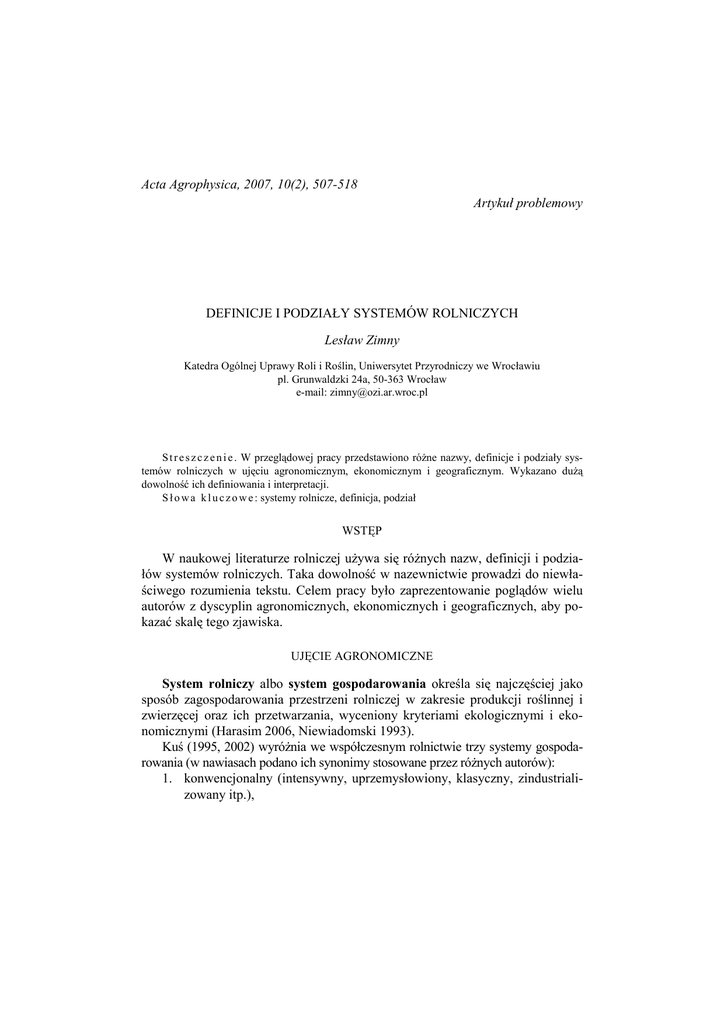 Acta Agrophysica, 2007, 10(2), 507-518 Artykuł problemowy DEFINICJE I PODZIAŁY SYSTEMÓW ROLNICZYCH Lesław Zimny Katedra Ogólnej Uprawy Roli i Roślin, Uniwersytet Przyrodniczy we Wrocławiu pl. Grunwaldzki 24a, 50-363 Wrocław e-mail: [email protected] S t r e s z c z e n i e . W przeglądowej pracy przedstawiono róŜne nazwy, definicje i podziały systemów rolniczych w ujęciu agronomicznym, ekonomicznym i geograficznym. Wykazano duŜą dowolność ich definiowania i interpretacji. S ł o w a k l u c z o w e : systemy rolnicze, definicja, podział WSTĘP W naukowej literaturze rolniczej uŜywa się róŜnych nazw, definicji i podziałów systemów rolniczych. Taka dowolność w nazewnictwie prowadzi do niewłaściwego rozumienia tekstu. Celem pracy było zaprezentowanie poglądów wielu autorów z dyscyplin agronomicznych, ekonomicznych i geograficznych, aby pokazać skalę tego zjawiska. UJĘCIE AGRONOMICZNE System rolniczy albo system gospodarowania określa się najczęściej jako sposób zagospodarowania przestrzeni rolniczej w zakresie produkcji roślinnej i zwierzęcej oraz ich przetwarzania, wyceniony kryteriami ekologicznymi i ekonomicznymi (Harasim 2006, Niewiadomski 1993). Kuś (1995, 2002) wyróŜnia we współczesnym rolnictwie trzy systemy gospodarowania (w nawiasach podano ich synonimy stosowane przez róŜnych autorów): 1. konwencjonalny (intensywny, uprzemysłowiony, klasyczny, zindustrializowany itp.), 508 L. ZIMNY 2. ekologiczny (biologiczny, organiczny, alternatywny, biologiczno-organiczny, znaturalizowany itp.), 3. integrowany (zintegrowany, harmonijny, zrównowaŜony, ekologicznoekonomiczny itp.). Podstawą wyróŜnienia powyŜszych systemów jest stopień uzaleŜnienia rolnictwa od przemysłowych środków produkcji, głównie nawozów mineralnych i pestycydów oraz jego oddziaływanie na środowisko przyrodnicze. Kuś (1995) scharakteryzował systemy rolnicze według następujących wskaźników: gospodarstwo, zmianowanie, nawoŜenie, międzyplony, dawki NPK, orka, materiał siewny, odmiany, siew, pielęgnacja, kształtowanie krajobrazu. Powszechnie przyjęte są następujące definicje systemów rolniczych: 1. rolnictwo konwencjonalne – sposób gospodarowania ukierunkowany na maksymalizacje zysku, osiąganego dzięki duŜej wydajności roślin i zwierząt. Wydajność tę uzyskuje się w wyspecjalizowanych gospodarstwach stosujących technologie produkcji oparte na duŜym zuŜyciu przemysłowych środków produkcji i bardzo małych nakładach robocizny (Kuś i Fotyma 1992). 2. rolnictwo ekologiczne – sposób gospodarowania, który aktywizując przyrodnicze mechanizmy produkcyjne poprzez stosowanie środków naturalnych nieprzetworzonych technologicznie, zapewnia trwałą Ŝyzność gleby i zdrowotność zwierząt oraz wysoką jakość biologiczną produktów rolniczych (Sołtysiak 1995). 3. rolnictwo integrowane – sposób gospodarowania, który umoŜliwia realizację celów ekonomicznych i ekologicznych poprzez świadome wykorzystanie nowoczesnych technik wytwarzania, systematyczne usprawnianie zarządzania oraz wdraŜanie róŜnych form postępu biologicznego w sposób sprzyjający realizacji tych celów (Kuś 1995). Definicja według Encyklopedii internetowej PWN (b.r.) jest bardzo ogólna: systemy rolnicze – róŜnorodne sposoby rolniczego uŜytkowania ziemi, dostosowane do rozmaitych warunków przyrodniczych. Z kolei definicja zaproponowana przez Biskupskiego (2003) jest błędna, albowiem utoŜsamia system rolniczy z płodozmianem: system rolniczy – system uprawy roślin polegający przede wszystkim na określonej kolejności upraw. Kolejność ta, nazywana płodozmianem, jest podstawą kaŜdego kierunku produkcyjnego w rolnictwie. Interesujące jest, Ŝe w Ŝadnym ksiąŜkowym opracowaniu leksykograficznym nie występuje hasło „system rolniczy”. Nawet „Słownik agro-bio-techniczny” (1992) pod redakcją prof. W. Niewiadomskiego z Katedry Systemów Rolniczych Uniwersytetu Warmińsko-Mazurskiego w Olsztynie nie odnotowuje tego terminu. Jest w nim natomiast hasło „system agrotechniczny” zaproponowane przez DEFINICJE I PODZIAŁY SYSTEMÓW ROLNICZYCH 509 Szwejkowskiego: system agrotechniczny – sposób gospodarowania na uŜytkach rolnych dostosowany do specyfiki siedliska przyrodniczego oraz warunków ekonomiczno-społecznych terenu; jego celem jest osiągnięcie najwyŜszej efektywności rolniczych środków produkcji. W przeglądowym artykule, w którym podano wiele definicji związanych z rolnictwem i jego systemami, nie wiadomo dlaczego nie podano definicji samego systemu rolniczego (Radecki i in. 2002). PowierŜa (1997) w obszernym opracowaniu podręcznikowym omawia system bioagrotechniczny jako system działaniowy słuŜący do instrumentalizacji (intensyfikacji działań zmniejszających wysiłek człowieka) procesów bioagrotechnicznych, tj. działań związanych z pozyskiwaniem surowców roślinnych i zwierzęcych oraz ich przetwarzaniem do postaci produktów. O specyfice systemu bioagrotechnicznego przesądzają elementy: techniczne, biologiczne i agrotechniczne. Nowacki (2002) agrosystem określa jako semantyczny opis autonomicznego zbioru elementów o charakterze humanistycznym, przyrodniczym i technicznym, synergetycznie współdziałających ze sobą w celu transformacji róŜnych form energii i składników otoczenia na produkty zdatne do metabolicznego przetwarzania w organizmach Ŝywych. Takie pojęcie agrosystemu jest uŜywane w wielu zróŜnicowanych stopniach jego agregacji. Stosuje się je przykładowo do określania zbiorów gospodarstw rolniczych łącznie z układami ich logistycznego zasilania w łańcuchach pozyskiwania produktów roślinnych, ich przetwarzania i dystrybucji (Gaworski 2005). Według Komisji Europejskiej (Perspective Analysis... 2005) rolnictwo konwencjonalne to agrosystem (nie mylić z agroekosystemem!) najbardziej rozpowszechniony i uŜywany w danym czasie i miejscu; w Europie kojarzony 