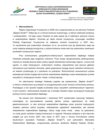 CERTYFIKACJA LOKALI GASTRONOMICZNYCH SERWUJĄCYCH DANIA REGIONALNE ZGODNIE Z TRADYCYJNĄ RECEPTURĄ W CELU STWORZENIA SZLAKU KULINARNEGO „ŚLĄSKIE SMAKI”® 26 MAJA 2012 R. Załącznik nr 2 do Umowy o współpracy ® w ramach projektu Szlak Kulinarny „Śląskie Smaki” 1. Wprowadzenie Śląska Organizacja Turystyczna w 2006 roku zorganizowała po raz pierwszy Festiwal „Śląskie Smaki”®. Odbył się on w formie konkursu kulinarnego, w którym startowali amatorzy i profesjonaliści. Od tego czasu Festiwal na stałe wpisał się w kalendarz ważnych imprez w województwie śląskim. Doceniła go także branża turystyczna, przyznając certyfikat Polskiej Organizacji Turystycznej za najlepszy produkt turystyczny w 2007 roku. To wyróżnienie jest znakomitym dowodem na to, że kuchnia oraz jej dziedzictwo staje się coraz większą atrakcją turystyczną, a sztuka kulinarna może stać się znakomitym markowym produktem turystycznym regionu. Przy zróżnicowaniu geograficzno-historycznym województwa śląskiego kolejne Festiwale pokazały jego bogactwo kulinarne. Poza swoją niezaprzeczalną atrakcyjnością, imprezy te ukazały jeszcze jeden ważny aspekt dziedzictwa kulinarnego regionu. Jurorzy byli zgodni, iż wiele tradycyjnych, znakomitych smaków województwa jest jeszcze głęboko schowanych pod dachami domostw, gdzie gospodynie strzegą swych sekretów kulinarnych, od wieków przekazując je z pokolenia na pokolenie. Różnorodność serwowanych potraw pokazała jak bardzo bogata jest kuchnia województwa śląskiego znana stereotypowo przede wszystkim z tradycyjnych klusek, rolady i modrej kapusty. Po zakończeniu każdego Festiwalu pojawia się wydawnictwo „Śląskie Smaki”®, w którym umieszczane są przepisy na przygotowywane przez drużyny konkursowe potrawy. Powstająca w ten sposób książka kucharska służy wszystkim zainteresowanym regionem, w tym turystom. Jednocześnie okazało się, iż istnieje niewiele miejsc serwujących tradycyjne potrawy kuchni województwa śląskiego. Na kanwie tych doświadczeń i obserwacji ŚOT postanowiła rozpocząć działania, zmierzające do wprowadzenia wysokiej jakości potraw regionalnych do lokali gastronomicznych, w celu promocji województwa śląskiego przez pryzmat tradycyjnych smaków zarówno wśród turystów, mieszkańców sąsiednich województw, jak również mieszkańców województwa śląskiego, którzy mają coraz mniej czasu na gotowanie, co może grozić zanikiem tradycji kulinarnych w regionie. Pierwsze działania w tym kierunku podjęto już pod koniec 2007 roku kiedy to ŚOT wraz z Gminą Ornontowice (wtedy dwukrotnym laureatem Festiwalu „Śląskie Smaki”®), pod patronatem Marszałka Województwa Śląskiego, zorganizowały pierwsze spotkanie Śląskiej Kapituły Smaku. 1 CERTYFIKACJA LOKALI GASTRONOMICZNYCH SERWUJĄCYCH DANIA REGIONALNE ZGODNIE Z TRADYCYJNĄ RECEPTURĄ W CELU STWORZENIA SZLAKU KULINARNEGO „ŚLĄSKIE SMAKI”® 26 MAJA 2012 R. Do pracy w Kapitule zaproszeni zostali eksperci kulinarni, etnografowie, dziennikarze, samorządowcy jak również znane osobistości, pochodzące z województwa śląskiego. Śląska Organizacja Turystyczna, na kanwie sukcesu Festiwalu oraz wniosków ze spotkań Śląskiej Kapituły Smaku postanowiła stworzyć unikalną, regionalną markę kulinarną. W wyniku zaplanowanych działań ma powstać dedykowana, ponadmiejska, skonwencjonalizowana marka oferująca unikalne i bardzo różnorodne osiągnięcia kulinarne regionu. W 2009 roku rozpoczęły się prace nad stworzeniem marki „Śląskie Smaki”®, których efektem było opracowanie w 2010 roku Strategii wdrożenia i komercjalizacji marki „Śląskie Smaki”®. Kolejnym, zgodnym ze Strategią etapem działań ŚOT jest certyfikacja lokali gastronomicznych regionu, której zasady mają Państwo przed sobą. Na bazie scertyfikowanych lokali utworzony zostanie Szlak Kulinarny „Śląskie Smaki”®, pozwalający na uatrakcyjnienie oferty turystycznej regionu, jednocześnie wzmacniając konkurencyjność lokali, znajdujących się na Szlaku. Stworzona marka „Śląskie Smaki”®, ma za zadanie promocję wszystkich „szlakowych” lokali gastronomicznych pod jednym szyldem. 2. Dziedzictwo kulinarne województwa śląskiego, a gastronomia regionalna jako element produktu turystycznego. Dziedzictwo kulinarne obecnego województwa śląskiego budowane było przez pokolenia. Składa się z bogatych tradycji i zwyczajów oraz smaku wielu potraw. Najczęściej kojarzona z regionem kuchnia śląska jest jedną z najbardziej bogatych i rozpoznawanych w kraju. Choć kojarzona z tradycyjnym świąteczno-niedzielnym zestawem obiadowym: rolady, kluski z sosem i „modro” kapusta, jest o wiele bogatsza i zróżnicowana. Decyduje o tym specyfika regionu oraz jego zasięg. Śląsk jawi się nam zazwyczaj jako ziemia węgla i stali, zajmująca niezbyt wielki obszar. Tymczasem ziemia śląska jest rozległa: rozsiadła się na żyznych ziemiach po obu brzegach dolnej Odry i Nysy Kłodzkiej, obejmuje władaniem całą Wyżynę Śląską i Zagłębie Górnośląskie, na południu sięgając aż po Beskid1. W obecnych granicach administracyjnych województwa śląskiego znajdują się również część Jury KrakowskoCzęstochowskiej wraz z samą Częstochową, Beskid Śląski i Żywiecki, Śląsk Cieszyński oraz Zagłębie. Ziemie te wnoszą bardzo duży wkład w dorobek kulturowy - a tym samym i kulinarny – całego województwa. 1 W. Sztabowa, „Krupnioki i moczka, czyli gawędy o kuchni śląskiej”, Wydawnictwo „Śląsk”, 1985 2 CERTYFIKACJA LOKALI GASTRONOMICZNYCH SERWUJĄCYCH DANIA REGIONALNE ZGODNIE Z TRADYCYJNĄ RECEPTURĄ W CELU STWORZENIA SZLAKU KULINARNEGO „ŚLĄSKIE SMAKI”® 26 MAJA 2012 R. Potencjał, płynący z różnorodności tradycyjnych potraw województwa śląskiego, znakomicie ilustruje przykładowy podział, przygotowany przez Marka Szołtyska, znanego w regionie pisarza i publ
