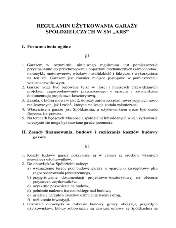 REGULAMIN UŻYTKOWANIA GARAŻY SPÓŁDZIELCZYCH W SM „ARS” I. Postanowienia ogólne §1 1. Garażem w rozumieniu niniejszego regulaminu jest pomieszczenie przystosowane do przechowywania pojazdów mechanicznych (samochodów, motocykli, motorowerów, wózków inwalidzkich) i faktycznie wykorzystane na ten cel. Garażem jest również miejsce postojowe w pomieszczeniu wielostanowiskowym. 2. Garaże mogą być budowane tylko w ilości i miejscach przewidzianych projektem zagospodarowania przestrzennego w oparciu o zatwierdzoną dokumentację projektowo-kosztorysową. 3. Zasada, o której mowa w pkt 2, dotyczy zarówno zadań inwestycyjnych nowo realizowanych, jak i zadań, których realizacja została zakończona. 4. Właścicielem garażu jest Spółdzielnia, a użytkownikiem może być osoba fizyczna lub prawna. 5. Na terenach będących własnością spółdzielni lub oddanych w jej użytkowanie wieczyste nie mogą być stawiane garaże przenośne. II. Zasady finansowania, budowy i rozliczania kosztów budowy garaży §2 1. Koszty budowy garaży pokrywane są w całości ze środków własnych przyszłych użytkowników. 2. Do obowiązków Spółdzielni należy: a) wyznaczenie terenu pod budowę garaży w oparciu o szczegółowy plan zagospodarowania przestrzennego, b) przygotowanie dokumentacji projektowo-kosztorysowej na zlecenie przyszłych użytkowników, c) uzyskanie pozwolenia na budowę, d) pełnienie nadzoru inwestorskiego nad budową, e) ustalenie narzutów kosztów uzbrojenia terenu i dróg, f) rozliczenie inwestycji. 3. Pozostałe obowiązki w zakresie budowy garaży obciążają przyszłych użytkowników, którzy zobowiązani są zawrzeć umowy ze Spółdzielnią na budowę garaży zgodnie z obowiązującymi przepisami. a) wpłacić na konto lub w kasie Spółdzielni kwotę z tytułu nadzoru inwestycyjnego oraz kosztów uzbrojenia i dróg, które poniosła Spółdzielnia, b) wnosić środki własne – zgodnie z zatwierdzona dokumentacją projektowokosztorysową i przepisami prawa budowlanego – w terminie określonym przez Zarząd Spółdzielni. §3 Do końcowego rozliczenia kosztów budowy garaży ma zastosowanie regulamin rozliczania kosztów budowy lokali mieszkalnych i garaży opracowany przed rozpoczęciem procesu inwestycyjnego zatwierdzony przez Radę Nadzorczą Spółdzielni i udostępniony dla zawierających umowę. §4 Garaże wolnostojące podlegają umorzeniu w wysokości 2,5 % rocznie, a garaże wbudowane w budynek mieszkalny 1,5 % rocznie. §5 Objęcie w używanie – jak również zwolnienie garażu – następuje na podstawie protokołu zdawczo-odbiorczego, a jego rozliczenie następuje zgodnie z obowiązującymi w tym zakresie przepisami. III. Przydział i używanie garaży §6 Użytkownicy posiadający tytuły prawne do garaży zachowują je do czasu ich zmiany w prawo odrębnej własności na ich wniosek. §7 1. Garaż wybudowany ze środków własnych członka na gruncie Spółdzielni za jej zgodą upoważnia członka do uzyskania prawa odrębnej własności lub prawa istniejącego. 2. Garaż wybudowany ze środków Spółdzielni może być wyłącznie wynajmowany na podstawie umowy najmu. Najemcami mogą być członkowie Spółdzielni, jak i osoby nie będące ich członkami. §8 1. Garaż może być używany wyłącznie na przechowywanie pojazdu mechanicznego. 2. Dokonywanie zmian i przeróbek bez zgody Zarządu Spółdzielni, a także używanie garażu niezgodnie z przeznaczeniem jest zabronione. §9 Spółdzielnia ma prawo przeglądu garaży za uprzednim powiadomieniem użytkownika. IV. Zasady ustalania opłat za używanie garaży. § 10 1. Za używanie garaży użytkownicy posiadający własnościowe prawo, prawo odrębnej własności do garażu wnoszą opłaty, na które składają się: - opłata eksploatacyjna, - fundusz remontowy, - podatek od gruntu, - podatek od nieruchomości. 2. Członkowie i nie członkowie wynajmujący garaż wnoszą opłaty, których wysokość ustala Rada Nadzorcza na podstawie analizy kosztów wynikających z ich eksploatacji. 3. Zarówno osoby posiadające własnościowe prawo do garażu, prawo odrębnej własności jak i wynajmujące garaż wnoszą opłaty za: zużytą energię elektryczną, która jest zużywana na potrzeby wentylacji i oświetlenia ciągów komunikacyjnych w garażach. 4. Obowiązek wnoszenia opłat za garaż powstaje z chwilą postawienia członkowi do dyspozycji, choćby faktycznie objęcie garażu nastąpiło po tym dniu. Obowiązek wnoszenia opłat za garaż ustaje z dniem miesiąca, w którym użytkownik opróżnił garaż. 5. W przypadku wynajmu garażu wszelkie sprawy wynikające z użytkowania garażu reguluje „Umowa najmu garażu” stanowiąca załącznik do tego regulaminu. V. Sprawy porządkowe § 11 Zarówno osoba posiadająca prawo do garażu, prawo odrębnej własności jak i wynajmująca garaż – z chwilą postawienia garażu do jej dyspozycji – zobowiązana jest: 1. Utrzymać garaż w stanie zgodnym z jego przeznaczeniem. 2. Zachować jego funkcję, tzn. nie zamieniać go w warsztat naprawczy a jedynie jako miejsce przechowywania samochodu. 3. Utrzymać czystość w garażu i na terenie do niego przyległym. 4. Uprzątać odpady i inne zaśmiecenia, zarówno z garażu jak i wokół niego. 5. Dokonywać konserwacji, remontów, napraw drzwi garażowych oraz ich malowania przynajmniej raz na 5 lat. 6. Użytkować instalację elektryczną zgodnie z jej przeznaczeniem. Użytkownikowi garażu nie wolno: 1. Przechowywać w garażu substancji i materiałów łatwopalnych, wybuchowych, cuchnących i żrących. 2. Parkować na ciągach komunikacyjnych dłużej niż jest to konieczne podczas wyjazdu, wjazdu i zamykania bramy. 3. Zastawiać ciągów komunikacyjnych rzeczami, które ograniczają swobodne poruszanie się. 4. W godzinach od 20,00 do 6,oo rano należy unikać głośnej pracy pojazdu. Użytkownika garażu obowiązują zasady zachowania norm wynikających z zamieszkiwania 