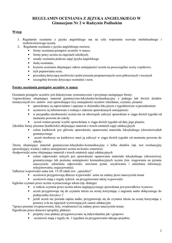REGULAMIN OCENIANIA Z JĘZYKA ANGIELSKIEGO W Gimnazjum Nr 2 w Radzyniu Podlaskim Wstęp 1. Regulamin oceniania z języka angielskiego ma na celu wspieranie rozwoju intelektualnego i osobowościowego ucznia. 2. Regulamin oceniania z języka angielskiego zawiera: formy oceniania postępów uczniów w nauce; formy pracy ucznia na zajęciach szkolnych; zasady oceniania podczas zajęć języka angielskiego skalę oceniania; kryteria oceniania obejmujące zakres umiejętności ucznia na poszczególne oceny cząstkowe; tryb poprawiania ocen; procedurę dotyczącą możliwości podwyższenia proponowanych ocen półrocznych i rocznych szczególne kwestie dotyczące oceniania i ocen. Formy oceniania postępów uczniów w nauce Ocenianie postępów uczniów jest dokonywane systematycznie i przyjmuje następujące formy: 1)sprawdziany obejmujące materiał gramatyczno-leksykalno-komunikacyjny z jednego lub dwóch działów tematycznych tzw. unitów oraz sprawdzające trzy umiejętności uczniów (słuchanie, czytanie, pisanie) sprawdziany są zapowiadane i zapisane w dzienniku lekcyjnym z tygodniowym wyprzedzeniem uczniowie są informowani o rodzaju i zakresie sprawdzanych umiejętności w przypadku nieobecności ucznia ma on obowiązek zaliczyć sprawdzian w ciągu dwóch tygodni od momentu powrotu do szkoły uczeń winien poznać wyniki sprawdzianu w ciągu dwóch tygodni od daty jego pisania; 2)krótkie formy pisemne (kartkówki) obejmujące materiał z trzech ostatnich zajęć edukacyjnych celem kartkówek jest głównie sprawdzenie opanowania materiału leksykalnego (słownictwa)lub gramatycznego uczeń nieobecny na kartkówce musi ją zaliczyć w ciągu dwóch tygodni od momentu powrotu do szkoły; 3)testy obejmujące materiał gramatyczno-leksykalno-komunikacyjny z kilku działów (np. test ewaluacyjny sprawdzający wiedzę i zakres umiejętności ucznia na koniec semestru); 4)odpowiedzi ustne obejmujące materiał z trzech ostatnich zajęć edukacyjnych celem odpowiedzi ustnych jest sprawdzenie opanowania materiału leksykalnego (słownictwa), gramatycznego lub poziomu umiejętności komunikacyjnych ucznia (tzn. reagowania na pytania nauczyciela: udzielania odpowiedzi, stawiania pytań, uzyskiwania i udzielania informacji, relacjonowania, negocjowania); 5)dłuższe wypowiedzi ustne (ok. 15-20 zdań) tzw. „speech(e)” uczniowie przygotowują dłuższe wypowiedzi ustne na zadany przez nauczyciela temat uczniowie mają z reguły tydzień na przygotowanie takiej wypowiedzi 6)głośne czytanie przez ucznia wyznaczonego tekstu (np. dialogu) w trakcie czytania przez ucznia tekstu anglojęzycznego sprawdzana jest prawidłowa wymowa uczeń przygotowuje się do czytania tekstu na ocenę korzystając z nagrania audio dołączonego do podręcznika Interface 2 jeżeli uczeń nie posiada zapisu audio, przygotowuje się do czytania tekstu na ocenę korzystając z pomocy n-la na zajęciach wyrównujących szanse edukacyjne 7)prace pisemne (wypracowania, listy, wiadomości) na zadany przez nauczyciela temat; 8)graficzne prace domowe (projekty, plakaty) projekty oraz plakaty przygotowywane są indywidualnie jak i grupowo uczniowie mają z reguły ok. 1 tygodnia na przygotowanie takiego projektu; 1 9)praca na lekcji Uczeń może otrzymać ocenę na zajęciach edukacyjnych za pracę na lekcji (indywidualną, w parach bądź grupach) w wyznaczonym przez nauczyciela czasie. Jeżeli uczeń nie wykona zadanych przez nauczyciela zadań, może uzyskać ocenę niedostateczną. Formy pracy ucznia na zajęciach szkolnych praca indywidualna praca w parach praca w grupach praca w plenum Zasady oceniania z języka angielskiego: 1. Ocenianie kształtujące (określanie celów lekcji, informowanie uczniów o kryteriach oceniania, stosowanie efektywnej informacji zwrotnej). Ocenianie kształtujące (OK) Ocena kształtująca jest stosowana w procesie uczenia się na etapie poznawania nowych wiadomości, nabywania umiejętności i sprawdzania osiągnięć. Jest wyrażana w postaci informacji zwrotnej, opisowej, w formie ustnej lub pisemnej (bez oceny w stopniu) i nie ma wpływu na ocenę sumującą. Może mieć formę samooceny lub oceny koleżeńskiej. Ocenie kształtującej mogą podlegać: wypowiedź ustna, kartkówka, sprawdzian, praca kontrolna i inne formy pracy ucznia. Elementami oceniania kształtującego są: Cele lekcji: - Nauczyciel określa cele lekcji i formułuje je w języku zrozumiałym dla ucznia (na każdej lekcji). - Sprawdza, czy uczniowie rozumieją cele (na początku zajęć) i czy zostały osiągnięte (pod koniec zajęć). - Uczniowie mogą uczestniczyć w ich formułowaniu. Wymagania, zwane także „NaCoBeZu”: - Są to kryteria osiągania celów (również oceny), czyli na co będziemy zwracać uwagę? - Formułowane są na podstawie celów. - Informują ucznia o tym, co nauczyciel będzie sprawdzał i oceniał. - Są dopasowywane do możliwości klasy i wymogów konkretnego zadania. - „NaCoBeZu” jest obowiązkowe dla prac kontrolnych i sprawdzianów, może być również formułowane do lekcji, prac domowych projektów i innych aktywności ucznia. 2 Informacja zwrotna: - Nauczyciel przekazuje uczniowi komentarz do jego pracy, który zawiera wyszczególnienie i docenienie dobrych elementów jego pracy, wskazuje to, co wymaga poprawienia, daje wskazówki, w jaki sposób uczeń powinien poprawić tę konkretną pracę oraz w jakim kierunku powinien pracować dalej. - Informacja zwrotna powinna być ściśle związana z kryteriami sukcesu określonymi przed zleceniem zadania. 2. Ocenianie obiektywne przez zastosowanie jednolitych kryteriów oceniania. 3. Ocenianie jawne (bieżące informowanie ucznia o jego wynikach). 4. Ocenianie instruktywne poprzez wskazywanie treści, które uczeń opanował oraz tych, których jeszcze nie przyswoił. 5. Mobilizację do dalszej pracy przez stosowanie wzmocnień pozytywnych mocnych stron ucznia. Skala oceniania W przypadku sprawdzianów, krótkich form pisemn