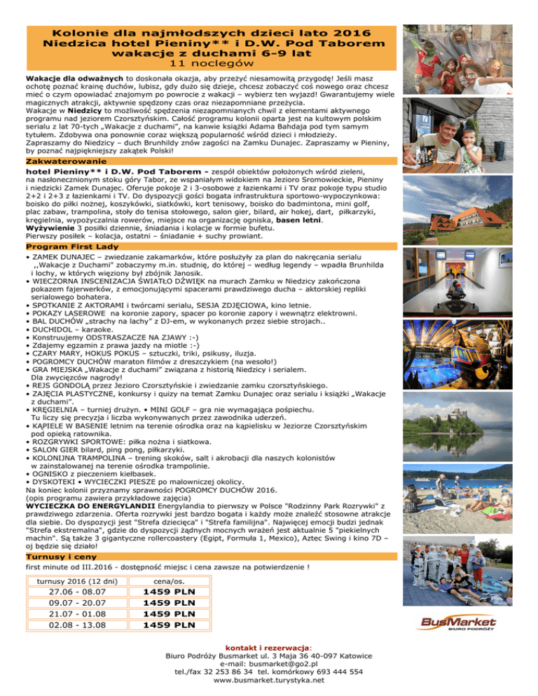 Kolonie dla najmłodszych dzieci lato 2016 Niedzica hotel Pieniny** i D.W. Pod Taborem wakacje z duchami 6-9 lat 11 noclegów Wakacje dla odważnych to doskonała okazja, aby przeżyć niesamowitą przygodę! Jeśli masz ochotę poznać krainę duchów, lubisz, gdy dużo się dzieje, chcesz zobaczyć coś nowego oraz chcesz mieć o czym opowiadać znajomym po powrocie z wakacji – wybierz ten wyjazd! Gwarantujemy wiele magicznych atrakcji, aktywnie spędzony czas oraz niezapomniane przeżycia. Wakacje w Niedzicy to możliwość spędzenia niezapomnianych chwil z elementami aktywnego programu nad jeziorem Czorsztyńskim. Całość programu kolonii oparta jest na kultowym polskim serialu z lat 70-tych „Wakacje z duchami”, na kanwie książki Adama Bahdaja pod tym samym tytułem. Zdobywa ona ponownie coraz większą popularność wśród dzieci i młodzieży. Zapraszamy do Niedzicy – duch Brunhildy znów zagości na Zamku Dunajec. Zapraszamy w Pieniny, by poznać najpiękniejszy zakątek Polski! Zakwaterowanie hotel Pieniny** i D.W. Pod Taborem - zespół obiektów położonych wśród zieleni, na nasłonecznionym stoku góry Tabor, ze wspaniałym widokiem na Jezioro Sromowieckie, Pieniny i niedzicki Zamek Dunajec. Oferuje pokoje 2 i 3-osobowe z łazienkami i TV oraz pokoje typu studio 2+2 i 2+3 z łazienkami i TV. Do dyspozycji gości bogata infrastruktura sportowo-wypoczynkowa: boisko do piłki nożnej, koszykówki, siatkówki, kort tenisowy, boisko do badmintona, mini golf, plac zabaw, trampolina, stoły do tenisa stołowego, salon gier, bilard, air hokej, dart, piłkarzyki, kręgielnia, wypożyczalnia rowerów, miejsce na organizację ogniska, basen letni. Wyżywienie 3 posiłki dziennie, śniadania i kolacje w formie bufetu. Pierwszy posiłek – kolacja, ostatni – śniadanie + suchy prowiant. Program First Lady • ZAMEK DUNAJEC – zwiedzanie zakamarków, które posłużyły za plan do nakręcania serialu ,,Wakacje z Duchami" zobaczymy m.in. studnię, do której – według legendy – wpadła Brunhilda i lochy, w których więziony był zbójnik Janosik. • WIECZORNA INSCENIZACJA ŚWIATŁO DŹWIĘK na murach Zamku w Niedzicy zakończona pokazem fajerwerków, z emocjonującymi spacerami prawdziwego ducha – aktorskiej repliki serialowego bohatera. • SPOTKANIE Z AKTORAMI i twórcami serialu, SESJA ZDJĘCIOWA, kino letnie. • POKAZY LASEROWE na koronie zapory, spacer po koronie zapory i wewnątrz elektrowni. • BAL DUCHÓW „strachy na lachy” z DJ-em, w wykonanych przez siebie strojach.. • DUCHIDOL – karaoke. • Konstruujemy ODSTRASZACZE NA ZJAWY :-) • Zdajemy egzamin z prawa jazdy na miotle :-) • CZARY MARY, HOKUS POKUS – sztuczki, triki, psikusy, iluzja. • POGROMCY DUCHÓW maraton filmów z dreszczykiem (na wesoło!) • GRA MIEJSKA „Wakacje z duchami” związana z historią Niedzicy i serialem. Dla zwycięzców nagrody! • REJS GONDOLĄ przez Jezioro Czorsztyńskie i zwiedzanie zamku czorsztyńskiego. • ZAJĘCIA PLASTYCZNE, konkursy i quizy na temat Zamku Dunajec oraz serialu i książki „Wakacje z duchami”. • KRĘGIELNIA – turniej drużyn. • MINI GOLF – gra nie wymagająca pośpiechu. Tu liczy się precyzja i liczba wykonywanych przez zawodnika uderzeń. • KĄPIELE W BASENIE letnim na terenie ośrodka oraz na kąpielisku w Jeziorze Czorsztyńskim pod opieką ratownika. • ROZGRYWKI SPORTOWE: piłka nożna i siatkowa. • SALON GIER bilard, ping pong, piłkarzyki. • KOLONIJNA TRAMPOLINA – trening skoków, salt i akrobacji dla naszych kolonistów w zainstalowanej na terenie ośrodka trampolinie. • OGNISKO z pieczeniem kiełbasek. • DYSKOTEKI • WYCIECZKI PIESZE po malowniczej okolicy. Na koniec kolonii przyznamy sprawności POGROMCY DUCHÓW 2016. (opis programu zawiera przykładowe zajęcia) WYCIECZKA DO ENERGYLANDII Energylandia to pierwszy w Polsce "Rodzinny Park Rozrywki" z prawdziwego zdarzenia. Oferta rozrywki jest bardzo bogata i każdy może znaleźć stosowne atrakcje dla siebie. Do dyspozycji jest "Strefa dziecięca" i "Strefa familijna". Najwięcej emocji budzi jednak "Strefa ekstremalna", gdzie do dyspozycji żądnych mocnych wrażeń jest aktualnie 5 "piekielnych machin". Są także 3 gigantyczne rollercoastery (Egipt, Formuła 1, Mexico), Aztec Swing i kino 7D – oj będzie się działo! Turnusy i ceny first minute od III.2016 - dostępność miejsc i cena zawsze na potwierdzenie ! turnusy 2016 (12 dni) 27.06 09.07 21.07 02.08 - 08.07 20.07 01.08 13.08 cena/os. 1459 1459 1459 1459 PLN PLN PLN PLN a kontakt i rezerwacja: Biuro Podróży Busmarket ul. 3 Maja 36 40-097 Katowice e-mail: [email protected] tel./fax 32 253 86 34 tel. komórkowy 693 444 554 www.busmarket.turystyka.net Cena obejmuje • • • • • Zakwaterowanie 11 noclegów i wyżywienie wg. oferty Opiekę wychowawców, przewodnika Wycieczkę do Energylandii Ubezpieczenie TUiR AXA: NNW (do 5000 zł) Program rekreacyjno-sportowy wg opisu Dopłaty opcjonalne • Dojazd na miejsce autokarem - patrz rozkład jazdy. • Ubezpieczenie od kosztów rezygnacji z imprezy TUiR AXA (dobrowolne, zalecamy wykupienie) – 52 zł. • Dodatkowe ubezpieczenia patrz w tabeli dopłat podczas rezerwacji. • Wycieczka autokarowa na Słowację i bilety wstępu do TATRALANDII (wymagany paszport lub dowód osobisty) – 120 zł. • Wycieczka w Pieniny – 70 zł. • Park Rozrywki + Park Miniatur – 40 zł. • Laserowy Painball – 35 zł. PROGRAM DODATKOWY (dla chętnych): WYCIECZKA NA SŁOWACJĘ – TATRALANDIA Jeden z największych i najpopularniejszych parków wodnych w Europie Środkowej. Tutaj będziecie szaleć pośród 14 basenów termalnych z krystalicznie czystą wodą. Czeka na was 21 unikalnych zjeżdżalni, wodne huśtawki, sztuczny deszcz, wodne wulkany, powietrzne leżaki i gejzery! Na miejscu zobaczycie równiez egzotyczne palmy oraz niesamowity piracki żaglowiec, co przeniesie Was w zupełnie inny świat! Tam obserwując przepiękne morskie ryby b
