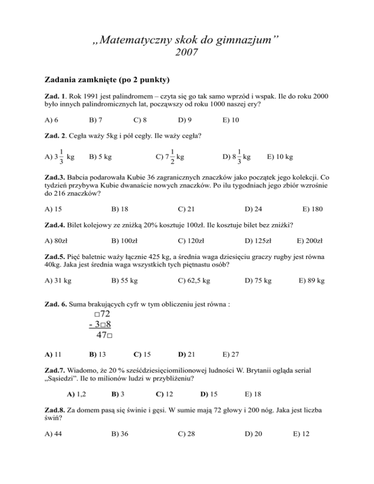„Matematyczny skok do gimnazjum” 2007 Zadania zamknięte (po 2 punkty) Zad. 1. Rok 1991 jest palindromem – czyta się go tak samo wprzód i wspak. Ile do roku 2000 było innych palindromicznych lat, począwszy od roku 1000 naszej ery? A) 6 B) 7 C) 8 D) 9 E) 10 Zad. 2. Cegła waży 5kg i pół cegły. Ile waży cegła? A) 3 1 kg 3 B) 5 kg C) 7 1 kg 2 1 D) 8 kg 3 E) 10 kg Zad.3. Babcia podarowała Kubie 36 zagranicznych znaczków jako początek jego kolekcji. Co tydzień przybywa Kubie dwanaście nowych znaczków. Po ilu tygodniach jego zbiór wzrośnie do 216 znaczków? A) 15 B) 18 C) 21 D) 24 E) 180 Zad.4. Bilet kolejowy ze zniżką 20% kosztuje 100zł. Ile kosztuje bilet bez zniżki? A) 80zł B) 100zł C) 120zł D) 125zł E) 200zł Zad.5. Pięć baletnic waży łącznie 425 kg, a średnia waga dziesięciu graczy rugby jest równa 40kg. Jaka jest średnia waga wszystkich tych piętnastu osób? A) 31 kg B) 55 kg C) 62,5 kg D) 75 kg E) 89 kg Zad. 6. Suma brakujących cyfr w tym obliczeniu jest równa : □72 - 3□8 47□ A) 11 B) 13 C) 15 D) 21 E) 27 Zad.7. Wiadomo, że 20 % sześćdziesięciomilionowej ludności W. Brytanii ogląda serial „Sąsiedzi”. Ile to milionów ludzi w przybliżeniu? A) 1,2 B) 3 C) 12 D) 15 E) 18 Zad.8. Za domem pasą się świnie i gęsi. W sumie mają 72 głowy i 200 nóg. Jaka jest liczba świń? A) 44 B) 36 C) 28 D) 20 E) 12 ZADANIA OTWARTE (PO 5 PUNKTÓW): Zad.9. W salonie samochodowym była pewna liczba samochodów. Gdyby dostawić jeszcze 50% liczby stojących samochodów, a następnie jeszcze 1 3 nowej liczby samochodów i jeszcze 4 samochody, wówczas w salonie byłoby 100 aut. Ile samochodów znajdowało się w salonie? Zad.10. O ile należy zmniejszyć wysokość równoległoboku o podstawie równej 8cm i polu równym 104cm2, aby pole tego równoległoboku zmniejszyło się o 24cm2, a podstawa nie uległa zmianie? Zad.11. Oto zadanie ułożone przez Johna Mellisa w 1594roku: Jeśli 1 jard sukna kupujesz za 6 szylingów i 8 pensów, a sprzedajesz za 8 szylingów i 6 pensów, to ile zarobisz na każdych 100 szylingach zainwestowanych w taką transakcję? Uwaga: W 1594 roku 12 pensów stanowiło równowartość 1 szylinga.