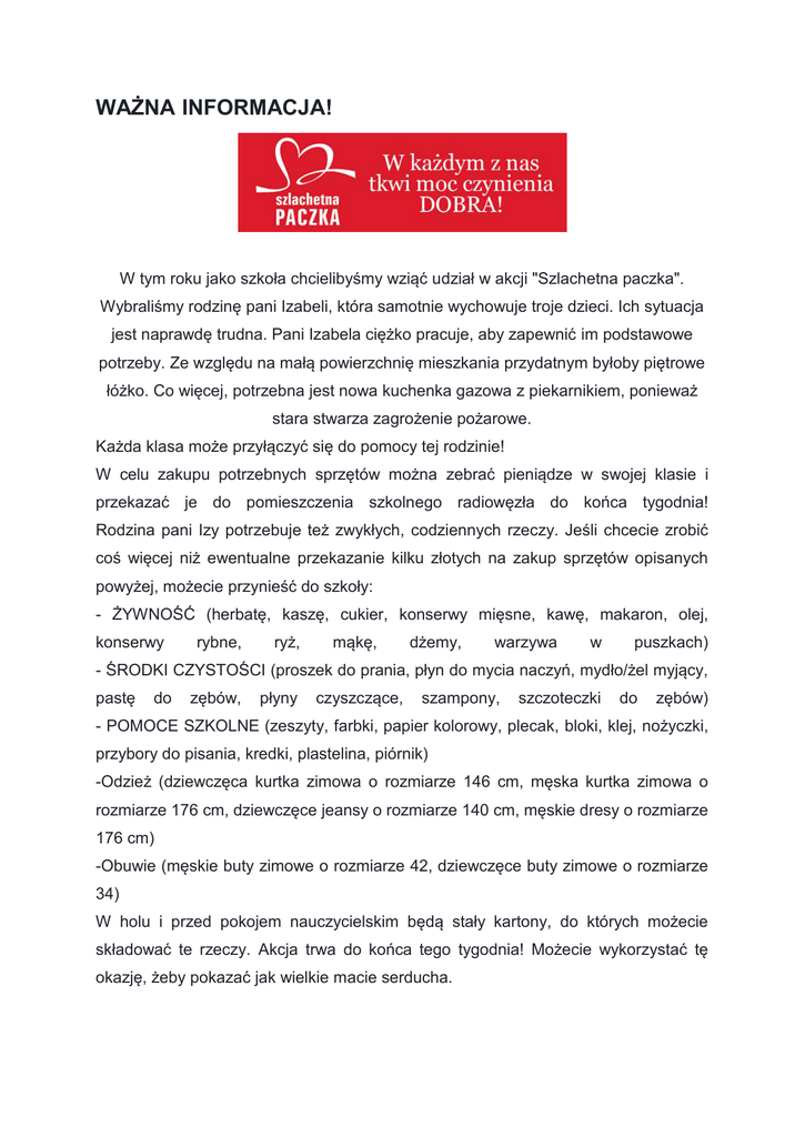 WAŻNA INFORMACJA! W tym roku jako szkoła chcielibyśmy wziąć udział w akcji "Szlachetna paczka". Wybraliśmy rodzinę pani Izabeli, która samotnie wychowuje troje dzieci. Ich sytuacja jest naprawdę trudna. Pani Izabela ciężko pracuje, aby zapewnić im podstawowe potrzeby. Ze względu na małą powierzchnię mieszkania przydatnym byłoby piętrowe łóżko. Co więcej, potrzebna jest nowa kuchenka gazowa z piekarnikiem, ponieważ stara stwarza zagrożenie pożarowe. Każda klasa może przyłączyć się do pomocy tej rodzinie! W celu zakupu potrzebnych sprzętów można zebrać pieniądze w swojej klasie i przekazać je do pomieszczenia szkolnego radiowęzła do końca tygodnia! Rodzina pani Izy potrzebuje też zwykłych, codziennych rzeczy. Jeśli chcecie zrobić coś więcej niż ewentualne przekazanie kilku złotych na zakup sprzętów opisanych powyżej, możecie przynieść do szkoły: - ŻYWNOŚĆ (herbatę, kaszę, cukier, konserwy mięsne, kawę, makaron, olej, konserwy rybne, ryż, mąkę, dżemy, warzywa w puszkach) - ŚRODKI CZYSTOŚCI (proszek do prania, płyn do mycia naczyń, mydło/żel myjący, pastę do zębów, płyny czyszczące, szampony, szczoteczki do zębów) - POMOCE SZKOLNE (zeszyty, farbki, papier kolorowy, plecak, bloki, klej, nożyczki, przybory do pisania, kredki, plastelina, piórnik) -Odzież (dziewczęca kurtka zimowa o rozmiarze 146 cm, męska kurtka zimowa o rozmiarze 176 cm, dziewczęce jeansy o rozmiarze 140 cm, męskie dresy o rozmiarze 176 cm) -Obuwie (męskie buty zimowe o rozmiarze 42, dziewczęce buty zimowe o rozmiarze 34) W holu i przed pokojem nauczycielskim będą stały kartony, do których możecie składować te rzeczy. Akcja trwa do końca tego tygodnia! Możecie wykorzystać tę okazję, żeby pokazać jak wielkie macie serducha. JEDEN ZA WSZYSTKICH, WSZYSCY ZA JEDNEGO! ;)
