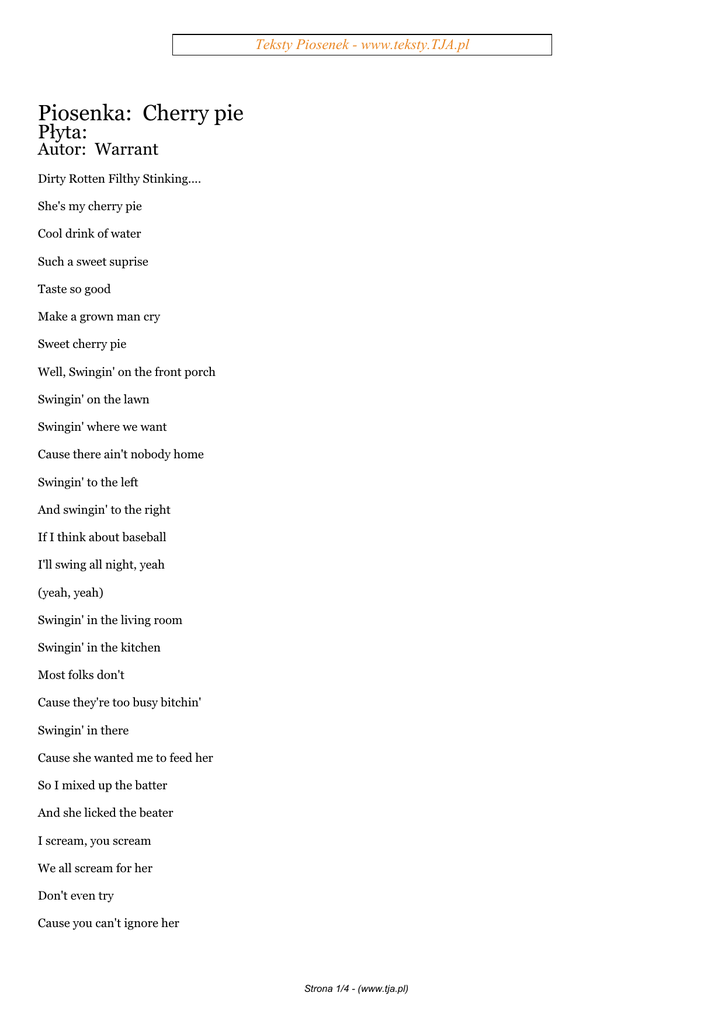 Teksty Piosenek - www.teksty.TJA.pl Piosenka: Cherry pie Płyta: Autor: Warrant Dirty Rotten Filthy Stinking.... She's my cherry pie Cool drink of water Such a sweet suprise Taste so good Make a grown man cry Sweet cherry pie Well, Swingin' on the front porch Swingin' on the lawn Swingin' where we want Cause there ain't nobody home Swingin' to the left And swingin' to the right If I think about baseball I'll swing all night, yeah (yeah, yeah) Swingin' in the living room Swingin' in the kitchen Most folks don't Cause they're too busy bitchin' Swingin' in there Cause she wanted me to feed her So I mixed up the batter And she licked the beater I scream, you scream We all scream for her Don't even try Cause you can't ignore her Strona 1/4 - (www.tja.pl) Teksty Piosenek - www.teksty.TJA.pl She's my cherry pie Cool drink of water Such a sweet suprise Tastes so good Make a grown man cry Sweet cherry pie Oh yeah She's my cherry pie Put a smile on your face Ten miles wide Looks so good Bring a tear to your eye Sweet cherry pie Swingin' to the drums Swingin' to guitar Swingin' to the bass In the back of my car Ain't got money Ain't got no gas But we'll get where we're going If we swing real fast I scream, you scream We all scream for her Don't even try Cause you can't ignore her She's my cherry pie Cool drink of water Such a sweet suprise Tastes so good Make a grown man cry Sweet cherry pie Oh yeah Strona 2/4 - (www.tja.pl) Teksty Piosenek - www.teksty.TJA.pl She's my cherry pie Put a smile on your face Ten miles wide Looks so good Bring a tear to your eye Sweet cherry pie Swing it! All night long Swing it! (I'm a trained professional) Swingin' in the bathroom Swingin' on the floor Swingin' so hard Forgot to lock the door In walks her daddy Standin' six foot four Said you ain't gonna swing With my daughter no more She's my cherry pie Cool drink of water Such a sweet suprise Tastes so good Make a grown man cry Sweet cherry pie Oh yeah She's my cherry pie Put a smile on your face Ten miles wide Looks so good Bring a tear to your eye Sweet cherry pie Sweet cherry pie Strona 3/4 - (www.tja.pl) Teksty Piosenek - www.teksty.TJA.pl Yeah Swing it! ***************************************** Polecamy Strony: www.opisy.tja.pl - Codzienie nowe opisy na GG www.rozmowki.tja.pl - Śmieszne Rozmówki www.tapeciarnia.pl - Mnustwo fajnych tapet na pulpit www.teledyski.tja.pl - Zawsze najnowsze teledyski www.lol2.pl - Śmieszne Filmiki, Kabarety www.wkinach.pl - Co jest grane w kinach ? Strona 4/4 - (www.tja.pl)