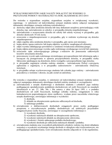WYKAZ DOKUMENTÓW JAKIE NALEśY DOŁĄCZYĆ DO WNIOSKU O PRZYZNANIE POMOCY MATERIALNEJ NA ROK AKADEMICKI 2013/2014 Do wniosku o stypendium socjalne, stypendium socjalne w zwiększonej wysokości, zapomogę - w zaleŜności od indywidualnej sytuacji studenta naleŜy załączyć następujące dokumenty określające sytuację rodzinną wnioskodawcy: a) skrócony odpis aktu urodzenia dziecka lub inny dokument urzędowy potwierdzający wiek dziecka, (np. zaświadczenie ze szkoły), w przypadku dziecka niepełnoletniego; b) zaświadczenie o uczęszczaniu dziecka do szkoły lub szkoły wyŜszej w przypadku, gdy dziecko ukończyło 18 rok Ŝycia; c) orzeczenie o niepełnosprawności w przypadku, gdy w rodzinie wychowuje się dziecko niepełnosprawne; d) odpis zupełny aktu urodzenia dziecka w przypadku, gdy ojciec jest nieznany; e) kopię aktów zgonu rodziców lub kopię odpisów wyroków zasądzających alimenty; f) odpis wyroku oddalającego powództwo o ustalenie świadczenia alimentacyjnego; g) kopię odpisu prawomocnego wyroku sądu rodzinnego orzekającego rozwód lub separację; h) orzeczenie sądu zobowiązującego jednego z rodziców do ponoszenia całkowitych kosztów utrzymania dziecka; i) prawomocny wyrok sądu rodzinnego stwierdzający przysposobienie lub informację sądu o toczącym się postępowaniu w sprawie przysposobienia dziecka, w przypadku osoby faktycznie opiekującej się dzieckiem, która wystąpiła o przysposobienie tego dziecka; j) w przypadku zaginięcia członka rodziny studenta - zaświadczenie Policji o przyjęciu zgłoszenia o zaginięciu, a w przypadku cudzoziemców - zaświadczenie właściwej instytucji; k) w przypadku urlopu wychowawczego studenta lub członka jego rodziny - zaświadczenie pracodawcy o terminie i okresie, na jaki został on udzielony. Do wniosku o stypendium socjalne, w zaleŜności od indywidualnej sytuacji studenta naleŜy załączyć następujące dokumenty określające dochód rodziny studenta w szczególności: a) zaświadczenia z urzędu skarbowego o dochodzie studenta i członków jego rodziny podlegającym opodatkowaniu podatkiem dochodowym od osób fizycznych na zasadach określonych w art. 27, 30b, 30c i 30e ustawy z dnia 26 lipca 1991 r. o podatku dochodowym od osób fizycznych, kaŜdego członka rodziny, osiągniętym w roku kalendarzowym poprzedzającym okres zasiłkowy, wydane przez naczelnika właściwego urzędu skarbowego, zawierające informacje o wysokości: 1) dochodu, 2) składek na ubezpieczenie społeczne odliczonych od dochodu, 3) naleŜnego podatku. b) oświadczenie o deklarowanych dochodach osiąganych przez osoby podlegające przepisom o zryczałtowanym podatku dochodowym od niektórych przychodów osiąganych przez osoby fizyczne, zawierające w szczególności informacje o: 1) wysokości dochodu, 2) wysokości naleŜnych składek na ubezpieczenie społeczne, 3) wysokości naleŜnych składek na ubezpieczenie zdrowotne, 4) wysokości i formie opłacanego podatku dochodowego, 5) wysokości dochodu po odliczeniu naleŜnych składek i podatku; c) oświadczenia studenta oraz wszystkich pełnoletnich członków rodziny (na dzień składania wniosku) o wysokości uzyskanego innego dochodu w ubiegłym roku rozliczeniowym, nie podlegającego opodatkowaniu; wzór oświadczenia określa załącznik nr 12 do regulaminu; d) zaświadczenie właściwego organu gminy albo oświadczenie właściciela o wielkości gospodarstwa rolnego wyraŜonej w hektarach przeliczeniowych ogólnej powierzchni lub nakaz płatniczy za ten rok; e) zaświadczenie lub oświadczenie członków rodziny studenta i studenta zawierające informacje o wysokości zapłaconych składek na ubezpieczenie zdrowotne w roku kalendarzowym poprzedzającym rok kalendarzowy. Dokument jest wymagany od członków rodziny studenta, którzy w roku kalendarzowym poprzedzającym rok akademicki osiągali dochody wykazane w zaświadczeniu z Urzędu Skarbowego o dochodzie członka rodziny podlegającym opodatkowaniu podatkiem dochodowym od osób fizycznych na zasadach określonych w art. 27, 30b, 30c i 30e ustawy z dnia 26 lipca 1991 r. o podatku dochodowym od osób fizycznych; f) umowę dzierŜawy, w przypadku oddania części lub całości znajdującego się w posiadaniu rodziny gospodarstwa rolnego w dzierŜawę, na podstawie umowy zawartej stosownie do przepisów o ubezpieczeniu społecznym rolników, albo oddania gospodarstwa rolnego w dzierŜawę w związku z pobieraniem renty określonej w przepisach o wspieraniu rozwoju obszarów wiejskich ze środków pochodzących z Sekcji Gwarancji Europejskiego Funduszu Orientacji i Gwarancji Rolnej (tzw. renty strukturalnej); g) umowę zawartą w formie aktu notarialnego, w przypadku wniesienia gospodarstwa rolnego do uŜytkowania przez rolniczą spółdzielnię produkcyjną; h) przekazy lub przelewy pienięŜne dokumentujące wysokość zapłaconych alimentów, jeŜeli członkowie rodziny są zobowiązani wyrokiem sądu lub ugodą sądową do ich płacenia na rzecz osoby spoza rodziny; i) kopię odpisu wyroku sądu zasądzającego alimenty na rzecz osób w rodzinie lub kopię odpisu protokołu posiedzenia zawierającego treść ugody sądowej lub zawartej przed mediatorem, przekazy lub przelewy pienięŜne dokumentujące faktyczną wysokość otrzymanych alimentów. W przypadku otrzymywania alimentów niŜszych niŜ zasądzone w wyroku, ugodzie sądowej lub ugodzie przed mediatorem naleŜy przedstawić przekazy lub przelewy wraz z zaświadczeniami komornika o całkowitej lub częściowej bezskuteczności egzekucji alimentów, a takŜe o wysokości wyegzekwowanych alimentów. W przypadku uzyskania alimentów wyŜszych niŜ zasądzone w wyroku, ugodzie sadowej lub ugodzie przed mediatorem naleŜy przedstawić oświadczenie o wysokości otrzymanych alimentów, kopie przelewów lub przekazów pocztowych oraz zaświadczenia komornika o wysokości wyegzekwowanych alimentów, gdy jest prowadzona egzekucja komornicza, a otrzymane ali