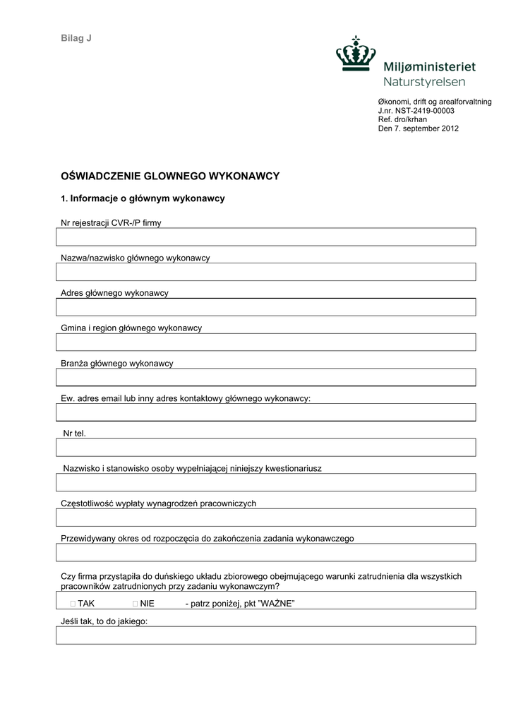 Bilag J Økonomi, drift og arealforvaltning J.nr. NST-2419-00003 Ref. dro/krhan Den 7. september 2012 OŚWIADCZENIE GLOWNEGO WYKONAWCY 1. Informacje o głównym wykonawcy Nr rejestracji CVR-/P firmy Nazwa/nazwisko głównego wykonawcy Adres głównego wykonawcy Gmina i region głównego wykonawcy Branża głównego wykonawcy Ew. adres email lub inny adres kontaktowy głównego wykonawcy: Nr tel. Nazwisko i stanowisko osoby wypełniającej niniejszy kwestionariusz Częstotliwość wypłaty wynagrodzeń pracowniczych Przewidywany okres od rozpoczęcia do zakończenia zadania wykonawczego Czy firma przystąpiła do duńskiego układu zbiorowego obejmującego warunki zatrudnienia dla wszystkich pracowników zatrudnionych przy zadaniu wykonawczym? TAK NIE Jeśli tak, to do jakiego: - patrz poniżej, pkt ”WAŻNE” 2. Oświadczenie głównego wykonawcy Poniższe oświadczenie wypełniają firmy, które świadczą usługi lub kupują produkty w charakterze głównego wykonawcy, i gdzie kupujący zapewnia siłę roboczą na terenach należących do Agencji Przyrody. Formularz zostaje przekazany Agencji Przyrody (będącej podmiotem wymagającym przekazania dokumentacji) przy zawarciu umowy. Warunki Główny wykonawca musi zapewnić pracobiorcom wynagrodzenie (łącznie ze świadczeniami szczególnymi), czas pracy i inne warunki pracy, nie mniej korzystne niż te, jakie mogliby osiągnąć w ramach układu zbiorowego, z mocy orzeczenia instancji arbitrażowej, ustaw krajowych lub przepisów wykonawczych obowiązujących dla prac o tym samym charakterze w danym zawodzie lub branży, w regionie, w którym wykonywane są dane prace. Główny wykonawca zobowiązuje się zapewnić pracownikom zatrudnionym przy wykonywaniu uslugi warunki płacy i zatrudnienia jak w.w. i jest zobowiązany do poinformowania pracobiorcy o obowiązujących warunkach. Pracobiorca ma prawo wnosić roszczenia względem glównego wykonawcy na zasadach niniejszego przepisu. W przypadku niespełnienia przez wykonawcę powyższego wymogu ze skutkiem powstania uzasadnionego roszczenia pracobiorcy o wynagrodzenie, Agencja Przyrody może zatrzymać wynagrodzenie wykonawcy w celu zabezpieczenia spełnienia warunków zatrudnienia pracobiorcy. Agencja Przyrody może w każdej chwili zażądać przedstawienia stosownej dokumentacji spełniania wymogów płacowych i warunków zatrudnienia względem pracowników. Na pisemne żądanie wykonawca główny musi przedstawić stosowną dokumentację dotyczącą własnych pracobiorców, a także pracobiorców swoich podwykonawców. Dokumentacja musi zostać dostarczona Agencji w terminie do 5 dni od otrzymania żądania. Dokumentację stanowią przykładowo: rozliczenia płac, rachunkowość płacowa, umowy o pracę i dowody zatrudnienia (ansaettelsesbevis). W przypadku realizacji zadania wykonawczego z pogwałceniem obowiązujących w Danii przepisów, pogwałcenia klauzuli o pracy lub nieprzekazania przez głównego wykonawcę stosownej dokumentacji świadczącej o spełnieniu wymogów tejże klauzuli, Agencja Przyrody ma prawo odstąpić od kontraktu ze skutkiem natychmiastiowym. Jesli glówny wykonawca i ewentualni podwykonawcy nie zawarli umowy w ramach ukladu zbiorowego, należy prowadzić bieżący rejestr czasu pracy dla pojedynczego pracownika. O zmianie warunków zatrudnienia należy natychmiast pisemnie poinformować Agencję Przyrody. _______________________________________________________________________________ Data i miejsce Podpis i ew. pieczęć głównego wykonawcy UWAGA: a. Główny wykonawca i ewentualni podwykonawcy, którzy przystąpili do obowiązującego duńskiego układu zbiorowego lub podpisali taki układ winni są dostarczyć stosowną dokumentację. b. Główny wykonawca i ewentualni podwykonawcy, którzy nie przystąpili do obowiązującego duńskiego układu zbiorowego i nie zawarli takiego układu, muszą wypełnić załaączone oświadczenie pracownika dla każdego pracownika indywidualnie. Oświadczenie/ oświadczenia muszą być podpisane zarówno przez głównego wykonawcę jak i pracownika. Oświadczenia muszą wpłynąć do podmiotu ich wymagającego przed rozpoczęciem pracy. Musi on być także niezwłocznie powiadamiany o ewentualnych zmianach. Prace mogą zostać rozpoczęte dopiero po przyjęciu przez podmiot wymagający dokumentacji powyżej opisanych oświadczeń /dokumentacji. 2 OSWIADCZENIE PRACOBIORCY 1. Informacje o pracobiorcy Nazwisko i imię: Data urodzenia: Narodowość: Płeć: Mężczyzna/kobieta 2. Informacje o warunkach zatrudnienia Rodzaj pracy (stanowisko) Data zatrudnienia Czas pracy (liczba godzin tygodniowo) Częstotliwość wypłaty wynagrodzenia pracobiorcy Czy zatrudnienie jest na czas określony? Jeśli tak, to podać datę ustania zatrudnienia Płaca (brutto) w duńskich koronach? Należy podać następujące dane: - Płaca za godzinę , za tydzień lub za miesiąc. - Wartość płaconej przez pracodawcę składki emerytalnej i wypłaty za dni ustawowo wolne od pracy w DKK za godzinę , za tydzień lub za miesiąc ( w takich samych jednostkach, w jakich podaje sie wypłatę ) lub w procentowej części wypłaty. Inne wynagrodzenie (np. akordowe, należy wyszczególnić)) Branża 3 3. Oświadczenie Poniższe oświadczenie musi być podpisane przez głównego wykonawcę i przez pracobiorcę. Oświadczenie stanowi dokumentację tego, że główny wykonawca zapewnia pracobiorcom wynagrodzenie (łącznie ze świadczeniami szczególnymi), czas pracy i inne warunki pracy, nie mniej korzystne niż te, jakie mogliby osiągnąć w ramach układu zbiorowego, z mocy orzeczenia instancji arbitrażowej, ustaw krajowych lub przepisów wykonawczych obowiązujących dla prac o tym samym charakterze w danym zawodzie lub branży, w regionie, w którym wykonywane są prace. Oświadczenia stanowią dokumentację, że główny wykonawca i pracobiorcy są świadomi tego przepisu i praw oraz obowiązków z niego wynikających. Zaleca się, aby oświa