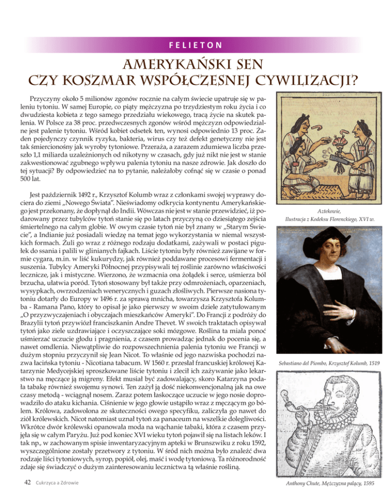 FELIETON Amerykański sen Czy koszmar współczesnej cywilizacji? Przyczyny około 5 milionów zgonów rocznie na całym świecie upatruje się w paleniu tytoniu. W samej Europie, co piąty mężczyzna po trzydziestym roku życia i co dwudziesta kobieta z tego samego przedziału wiekowego, tracą życie na skutek palenia. W Polsce za 38 proc. przedwczesnych zgonów wśród mężczyzn odpowiedzialne jest palenie tytoniu. Wśród kobiet odsetek ten, wynosi odpowiednio 13 proc. Żaden pojedynczy czynnik ryzyka, bakteria, wirus czy też defekt genetyczny nie jest tak śmiercionośny jak wyroby tytoniowe. Przeraża, a zarazem zdumiewa liczba przeszło 1,1 miliarda uzależnionych od nikotyny w czasach, gdy już nikt nie jest w stanie zakwestionować zgubnego wpływu palenia tytoniu na nasze zdrowie. Jak doszło do tej sytuacji? By odpowiedzieć na to pytanie, należałoby cofnąć się w czasie o ponad 500 lat. Jest październik 1492 r., Krzysztof Kolumb wraz z członkami swojej wyprawy dociera do ziemi „Nowego Świata”. Nieświadomy odkrycia kontynentu Amerykańskiego jest przekonany, że dopłynął do Indii. Wówczas nie jest w stanie przewidzieć, iż podarowany przez tubylców tytoń stanie się po latach przyczyną co dziesiątego zejścia śmiertelnego na całym globie. W owym czasie tytoń nie był znany w „Starym Świecie”, a Indianie już posiadali wiedzę na temat jego wykorzystania w niemal wszystkich formach. Żuli go wraz z różnego rodzaju dodatkami, zażywali w postaci pigułek do ssania i palili w glinianych fajkach. Liście tytoniu były również zawijane w formie cygara, m.in. w liść kukurydzy, jak również poddawane procesowi fermentacji i suszenia. Tubylcy Ameryki Północnej przypisywali tej roślinie zarówno właściwości lecznicze, jak i mistyczne. Wierzono, że wzmacnia ona żołądek i serce, uśmierza ból brzucha, ułatwia poród. Tytoń stosowany był także przy odmrożeniach, oparzeniach, wysypkach, owrzodzeniach wenerycznych i guzach złośliwych. Pierwsze nasiona tytoniu dotarły do Europy w 1496 r. za sprawą mnicha, towarzysza Krzysztofa Kolumba - Ramana Pano, który to opisał je jako pierwszy w swoim dziele zatytułowanym „O przyzwyczajeniach i obyczajach mieszkańców Ameryki”. Do Francji z podróży do Brazylii tytoń przywiózł franciszkanin Andre Thevet. W swoich traktatach opisywał tytoń jako ziele uzdrawiające i oczyszczające soki mózgowe. Roślina ta miała ponoć uśmierzać uczucie głodu i pragnienia, z czasem prowadząc jednak do pocenia się, a nawet omdlenia. Niewątpliwie do rozpowszechnienia palenia tytoniu we Francji w dużym stopniu przyczynił się Jean Nicot. To właśnie od jego nazwiska pochodzi nazwa łacińska tytoniu - Nicotiana tabacum. W 1560 r. przesłał francuskiej królowej Katarzynie Medycejskiej sproszkowane liście tytoniu i zlecił ich zażywanie jako lekarstwo na męczące ją migreny. Efekt musiał być zadowalający, skoro Katarzyna podała tabakę również swojemu synowi. Ten zażył ją dość niekonwencjonalną jak na owe czasy metodą - wciągnął nosem. Zaraz potem łaskoczące uczucie w jego nosie doprowadziło do ataku kichania. Ciśnienie w jego głowie ustąpiło wraz z męczącym go bólem. Królowa, zadowolona ze skuteczności owego specyfiku, zaliczyła go nawet do ziół królewskich. Nicot natomiast uznał tytoń za panaceum na wszelkie dolegliwości. Wkrótce dwór królewski opanowała moda na wąchanie tabaki, która z czasem przyjęła się w całym Paryżu. Już pod koniec XVI wieku tytoń pojawił się na listach leków. I tak np., w zachowanym spisie inwentaryzacyjnym apteki w Brunszwiku z roku 1592, wyszczególnione zostały przetwory z tytoniu. W śród nich można było znaleźć dwa rodzaje liści tytoniowych, syrop, popiół, olej, maść i wodę tytoniową. Ta różnorodność zdaje się świadczyć o dużym zainteresowaniu lecznictwa tą właśnie rośliną. 42 Cukrzyca a Zdrowie Aztekowie, Ilustracja z Kodeksu Florenckiego, XVI w. Sebastiano del Piombo, Krzysztof Kolumb, 1519 Anthony Chute, Mężczyzna palący, 1595 19 FELIETON Znany lekarz Nicolas Monardes w swojej pracy, zatytułowanej „Ocena medyczna towarów importowanych z naszych majątków położonych w Indiach Zachodnich” z 1571 r., podaje sposoby preparowania liści tytoniowych w celu uzyskania z nich mikstur leczniczych. Autor wymienił ponad dwadzieścia zastosowań medycznych tytoniu. W owym czasie w Polsce zastosowanie tytoniu w lecznictwie nie było tak powszechne. Świadczyć o tym mógłby fakt pominięcia tej rośliny przez Szymona Syreńskiego w jego zielniku, wydanym w 1613 roku. Sytuacja ta uległa zmianie w latach kolejnych. Liście tytoniu zostały ujęte chociażby w Farmakopei Królestwa Polskiego z roku 1817. Ich przetwory były wówczas dostępne w aptekach. Stosowanie tytoniu jako używki początkowo szerzyło się w Anglii, jeszcze pod koniec XVI wieku. We Francji jego szczególna popularność przypada na czasy Ludwika XIII. Po roku 1590 zaczęła rodzić się moda w Holandii. W Niemczech wzmianki dotyczące palenia tytoniu sięgają roku 1601, a w Turcji 1605. Do Polski zwyczaj palenia, bądź też zażywania tytoniu przenieśli w XVII wieku synowie szlachty, wyjeżdżający na edukację do Francji i Włoch. Wiek XVII to czas stopniowego zwiększania się mody na tytoń w Europie. Powstały liczne sklepy z tą rośliną, służącą do palenia w fajkach, żucia i zażywania. Fajki palono nawet w teatrze, co uważane było za przejaw wysokiej kultury. Tego rodzaju praktyki miały oznaczać nowoczesność i pewnego rodzaju wyrafinowanie. Mniej więcej w tym okresie pojawiają się pierwsze prace na temat szkodliwości tytoniu. W 1672 roku angielski lekarz Maynwaring zauważa związek palenia tytoniu z rozwojem gnilca. W roku 1689 francuski król Ludwik XIII wydaje dekret, na mocy którego jedynie aptekarze mogli sprzedawać tytoń do celów leczniczych. W Anglii pierwszy traktat leka