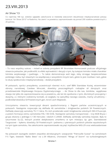 23.VIII.2013 Air Show ’13 Co najmniej 180 tys. widzów oglądało zakończone w niedzielę wieczorem dwudniowe międzynarodowe pokazy lotnicze "Air Show 2013" w Radomiu. Na ziemi i w powietrzu zaprezentowało się ponad 200 statków powietrznych z 20 państw. – To nasz wspólny sukces – mówił w sobotę prezydent RP Bronisław Komorowski podczas oficjalnego otwarcia pokazów. Jak podkreślił, to efekt wytrwałości i decyzji o tym, by tutejsze lotnisko miało charakter lotniska wojskowego i cywilnego. – To także demonstracja woli tego, żeby strzegąc bezpieczeństwa polskiego nieba, być otwartym na współpracę z wszystkimi innymi tam, gdzie to jest możliwe i tam, gdzie to służy społeczności międzynarodowej – dodał prezydent. W pokazach, oprócz prezydenta, uczestniczyli również m.in.: szef BBN Stanisław Koziej, wiceminister obrony narodowej Czesław Mroczek, dowódcy poszczególnych rodzajów sił zbrojnych oraz przedstawiciele Wojskowego Korpusu Dyplomatycznego. – Air Show to dla nas, lotników, wyjątkowa okazja nie tylko do zaprezentowania się w powietrzu, ale też do spotkania z tymi, dla których pracujemy i służymy, a z którymi codzienny kontakt, ze względu na specyfikę naszego zawodu, mamy utrudniony – podkreślał dowódca Sił Powietrznych gen. broni Lech Majewski. Uroczystemu otwarciu towarzyszył desant spadochroniarzy z flagami państw uczestniczących w pokazach. Następnie rozpoczęła się defilada 46 samolotów i śmigłowców polskich Sił Powietrznych. Defiladę otworzyły samoloty TS-11 Iskra. Po nich przeleciało sześć śmigłowców szkolnych SW-4 Puszczyk, a potem formacja ośmiu samolotów PZL-130 Orlik. Następnie samoloty transportowe – trzy M28 Bryza i grupa złożona z jednego C-130 Hercules i dwóch C-295M. Defiladę zamknęły samoloty bojowe. Były to szturmowe Su-22, których przelot dedykowano zmarłemu w tym miesiącu śp. gen. Stanisławowi Targoszowi – byłemu dowódcy Sił Powietrznych i jednemu z pierwszych polskich pilotów wyszkolonych na tym typie samolotu. Na zakończenie zaprezentowało się pięć myśliwców MiG-29 oraz wielozadaniowe F-16. Na pokazach wystąpiło siedem zespołów akrobacyjnych: szwajcarski "Patrouille Suisse" na samolotach F-5 Tiger, łotewski "Baltic Bees" na L-39 Albatros, chorwacki "Wings of Storm" na turbośmigłowych Strona 1 PC-9M, fiński "Midnight Hawks" na samolotach Hawk oraz trzy zespoły z Polski: "Biało-Czerwone Iskry", "Orliki" i "Żelazny". W imprezie zadebiutowali w tym roku lotnicy z Rumunii, Turcji i Ukrainy. Na F-16 akrobacje pokazali Turcy, Belgowie, Holendrzy i Grecy. W powietrzu pokazały się też m.in. samoloty wielozadaniowe: Rafale z Francji, Eurofighter Typhoon z Włoch oraz JAS 39 Gripen z Czech i Węgier. W powietrzu zaprezentował się również polski myśliwiec MiG-29 i włoski transportowy C-27J Spartan. Polskie Su-22 i F-16 dały pokaz misji bliskiego wsparcia oddziałów na ziemi. Licznie reprezentowane były śmigłowce. Holendrzy zaprezentowali się na AH-64 Apache. Pokazały się też trzy walczące w przetargu na 70 maszyn dla polskich sił zbrojnych: AgustaWestland AW149, Eurocopter EC 725 Caracal i Sikorsky S-70i Black Hawk. Na wystawie naziemnej można było obejrzeć np. samolot transportowy Ił-76 z Ukrainy, do którego w sobotę i niedzielę ustawiły się długie kolejki, a także morski patrolowy P-3 Orion z Niemiec czy szkolny BAE Hawk z Wielkiej Brytanii. Po raz pierwszy na Air Show odbyła się też wystawa sprzętu polskich wojsk obrony przeciwlotniczej i radiotechnicznych, np. radaru NUR-15M i rakietowego systemu S-125 Newa SC. Dwudniowe Air Show to największa impreza lotnicza w Polsce. Od 2000 r. odbywa się na radomskim lotnisku Sadków; od 2003 r. jest organizowana co dwa lata. Pierwsze Air Show zorganizowano w 1991 r. Pokazy w Radomiu były elementem obchodów Święta Lotnictwa Polskiego i 95. rocznicy powstania lotnictwa wojskowego w Polsce. Organizatorzy Air Show to: Siły Powietrzne, miasto Radom, spółka Port Lotniczy Radom, Aeroklub Polski i Wojskowe Stowarzyszenie Społeczno-Kulturalne SWAT. Strona 2