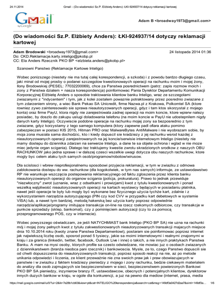 24.11.2014 Gmail - (Do wiadomości Sz.P. Elżbiety Anders): ŁKI-924937/14 dotyczy reklamacji kartowej Adam B <[email protected]> (Do wiadomości Sz.P. Elżbiety Anders): ŁKI-924937/14 dotyczy reklamacji kartowej Adam Brodowski <[email protected]> Do: [email protected] CC: Ela Anders Rzecznik PKO BP <[email protected]> 24 listopada 2014 01:36 Szanowni Panstwo (Reklamacje Kartowe Inteligo) Wobec ponizszego (niestety nie ma tutaj calej korespondencji, a szkoda) i z powodu bardzo dlugiego czasu, jaki minal od mojej prosby o podanei szczegolow kwestionowaych operacji na rachunku moim i mojej żony, Ilony Brodowskiej (PESEL: 77032200069), chce za Panstwa posrednictwem (patrz: zapis rozmow moich i zony z Panstwa dzialem + nasza korespondencja) poinformowac Pania Dyrektor Departamentu Komunikacji Korporacyjnej Elżbietę Anders o sposobie traktowania klientow banku Inteligo, wraz ze szczegolami zwiazanymi z "indycentem" i tym, jak z kolei zostalem powaznie potraktowany przez posrednio zwiazane z tym zdarzeniem strony, a wiec Bank Pekao SA Unicredit, firme Nazwa.pl z Krakowa, Polkomtel SA (ktore rowniez zywo zainteresowalo sie sprawa nieautoryzowanych operacji, gdyz i tam ktos skorzystal z mojego konta) oraz firme PayU, ktora nigdy nie zarejestrowala zadnej operacji na moim koncie, ktore wpierw nalezy posiadac, by doszlo do zakupu uslugi doladowania telefonu (na moim koncie w PayU nie udostepnilem nigdy danych karty Inteligo). Oczywiscie podobne operacje na rachunku mojej zony sa bezposrednio z tym zwiazane, gdyz korzystamy z tego samego komputera (ktory zapewne padl ofiara ataku pomimo zabezpieczen w postaci KIS 2015, Hitman PRO oraz MalwareBytes AntiMalware i nie wyobrazam sobie, by moja zona musiala sama dochodzic, kto i kiedy dopuscil sie kradziezy z jej rachunku wsrod kazdej z nieautoryzowanych operacji zarejestrowanych na jej koncie/serwisie internetowym Inteligo (niestety nie mamy dostepu do dziennika zdarzen na serwerze Inteligo, a dane te sa objete ochrona i wglad w nie moze miec jedynie organ scigania). Dlatego tez traktujemy kwestie zwrotu skradzionych srodkow z naszych OBU RACHUNKOW jako jedna sprawe i w dalszej czesci wszelkie uwagi dotycza obu naszych rachunkow, ktore mogly byc celem ataku tych samych osob/programow/robotow/wirusow. Dla scislosci i wbrew nieprofesjonalnemu sposobowi przyjecia reklamacji, w tym w zwiazku z odmowa zablokowania dostepu do ww. rachunkow (dla kogokolwiek, w tym nas samych) informuje, ze ustawodawstwo RP nie warunkuje wszczęcia postepowania reklamacyjnego od faktu zgloszenia przez klienta banku nieautoryzowanych operacji do organow scigania (policja, prokuratura). Prawo to jednak przewiduje "niezwłoczny" zwrot (uznanie, wraz z odsetkami i prowizjami) kwot z tytułu kwestionowanych i ponad wszelką wątpliwość nieautoryzowanych operacji na kartach wystawcy będących w posiadaniu płatnika, nawet jeśli operacje te były lub mogły być wykonane bez fizycznego użycia tychże kart, zdalnie i z wykorzystaniem narzędzia autoryzującego (PIN czy kod CVV w przypadku kart debetowych w systemie VISA) lub, a nawet tym bardziej, metodą hakerską bez użycia karty poprzez odpowiednie narzędzia/aplikacje/programy imitujące transakcje on-line na rzecz rzekomych odbiorcow, czy transakcje w punkcie sprzedaży (sklep, bankomat), czy z pominięciem autoryzacji (czy to za pomocą przeprogramowanego POS, czy w internecie). Wobec powyzszego oświadczam, ze jeśli NATYCHMIAST bank Inteligo (PKO BP SA) nie uzna na rachunki mój i mojej żony pełnych kwot z tytułu zakwestionowanych nieautoryzowanych transakcji majacych miejsce dnia 10.10.2014 roku (kwoty znane Panstwa Departamentowi), postaram sie poinformowac poprzez internet jak najwiekszą liczbę osob, sposrod ponad 5 tysiecy, jakie sa moimi internetowymi i realnymi znajomymi w kraju i za granica (linkedin, twitter, facebook, Outlook Live i inne) o takich, a nie innych praktykach Panstwa Banku. A mam na mysi osoby, ktorych profile sa czesto odwiedzane, nie mowiac juz o osobach zwiazanych z dziennikarstwem (branża nieobca pani rzecznik) i bankowoscia. Mysle, ze to, czego Panstwo dopuscili sie od chwili dopuszczenia do nieautoryzowanych transakcji, poprzez sposob reakcji na nie, az po metode unikania odpowiedzi i liczenia, ze klient przeważnie nie zna swoich praw jak i praw obowiazujacych w panstwie i w zwiazku z faktem kradziezy pieniedzy z mojego i zony rachunku, bedzie ciekawym materialem do analizy dla osob zajmujacych sie bezpieczenstwem w sieci, bezpieczenstwem powierzonych Bankowi PKO BP SA pieniedzy, inzynierow branzy IT, ustawodawcow, obecnych i potencjalnych klientow, dyrektorow innych duzych bankow w kraju, w ogole dla konkurencji, a juz na pewno dla mediow (internet, prasa, media https://mail.google.com/mail/u/0/?ui=2&ik=7e28b1cb63&view=pt&cat=INTELIGO%20korespondencja&search=cat&msg=149df3a0427d2aa7&siml=149df3a… 1/6 24.11.2014 Gmail - (Do wiadomości Sz.P. Elżbiety Anders): ŁKI-924937/14 dotyczy reklamacji kartowej neizalezne), ktore nie przepuszcza mozliwosci skomentowania dzialan najwiekszego banku w Polsce. A bank ten, wedlug mnie (czym podzielilem sie jakis czas temu z biurem Rzecznika Praw Konsumenta) naruszyl kilka, jeśli nie kilkanaście, przepisów lub zasad ustanowionych przez Ustawę o Usługach Płatniczych, Kodeks Cywilny oraz swoje wewnętrzne regulaminy (co jest najciekawsze w tym wszystkim). Częśc zaś zapisów w tychże regulaminach/regulaminie zawiera co najmniej 1 klauzule abuzywna wykazana przez Sad Okregowy w Warszawie - SOKiK w przypadku innego banku w naszym kraju, na ktorym ciazy jego prawomocny wyrok. Zapist zaś w Panstwa "Ogolnych Warunkach Prowadzenia Rachunkow (...)" jest kopią tamtego zapisu, słowo w słowo i co do przecinka. Zważywszy 8-letnią karierę pani Elżbiety w UOKiK i to, czym się zajmowała, dziwi obecny fakt odpowiadania własną twarzą za instytucję, która jawnie działa na niekorzyść klienta zbiorowego. Czy mozliwe to jest, by rzecznik pr