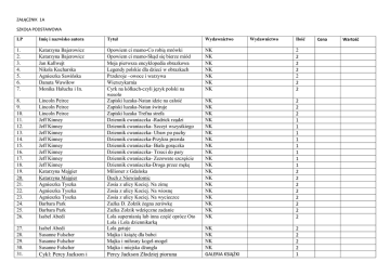 ZAŁĄCZNIK 1A SZKOŁA PODSTAWOWA LP Imię i nazwisko autora Tytuł Wydawnictwo 1. 2. 3. 4. 5. 6. 7. Katarzyna Bajerowicz Katarzyna Bajerowicz Jan Kallwejt Nikola Kucharska Agnieszka Sawińska Danuta Wawiłow Monika Hałucha i In. NK NK NK NK NK NK NK 2 2 2 2 2 2 2 8. 9. 10. 11. 12. 13. 14. 15. 16. 17. 18. 19. 20. 21. 22. 23. 24. 25. 26. Lincoln Peirce Lincoln Peirce Lincoln Peirce Jeff Kinney Jeff Kinney Jeff Kinney Jeff Kinney Jeff Kinney Jeff Kinney Jeff Kinney Jeff Kinney Katarzyna Majgier Katarzyna Majgier Agnieszka Tyszka Agnieszka Tyszka Agnieszka Tyszka Barbara Park Barbara Park Isabel Abedi NK NK NK NK NK NK NK NK NK NK NK NK NK NK NK NK NK NK NK 2 2 2 1 1 1 1 1 1 1 1 2 2 2 2 2 2 2 2 27. 28. 29. 30. 31. Isabel Abedi Susanne Fulscher Susanne Fulscher Susanne Fulscher Opowiem ci mamo-Co robią mrówki Opowiem ci mamo-Skąd się bierze miód Moja pierwsza encyklopedia obrazkowa Legendy polskie dla dzieci w obrazkach Przekroje –owoce i warzywa Wierszykarnia Cyrk na kółkach-czyli język polski na wesoło Zapiski luzaka-Natan idzie na całość Zapiski luzaka-Natan świruje Zapiski luzaka Trefna strefa Dziennik cwaniaczka -Radrick rządzi Dziennik cwaniaczka- Szczyt wszystkiego Dziennik cwaniaczka- Ubaw po pachy Dziennik cwaniaczka-Przykra prawda Dziennik cwaniaczka- Biała gorączka Dziennik cwaniaczka- Trzeci do pary Dziennik cwaniaczka- Zezowate szczęście Dziennik cwaniaczka-Droga przez mękę Milioner z Gdańska Duch z Niewiadomic Zosia z ulicy Kociej. Na zimę Zosia z ulicy Kociej. Na wiosnę Zosia z ulicy Kociej. Na wycieczce Zuźka D. Zołzik żegna zerówkę Zuźka Zołzik wdzięczne zadanie Lola supernianią lub inna część oprócz Oto Lola i Lola dziennikarką Lola gotuje Majka i książę dla babci Majka i miłosny kogel-mogel Majka i miejska dżungla Cykl: Percy Jackson i Percy Jackson Złodziej pioruna NK NK NK NK GALERIA KSIĄŻKI 2 2 2 2 1 Wydawnictwo Ilość Cena Wartość 32. 33. 34. 35. 36. 37. 38. bogowie olimpijscy Riordan Rick Martin Widmark Martin Widmark Marlen Melin Oscar Brenifier Oscar Brenifier N.Berkane, A. Nesme N.Berkane, A. Nesme (pakiet 5 tomów) Tajemnica urodzin Wyspa obłąkanych Chłopak z lasu 39. 40. 41. 42. 43. 44. 45. 46. N.Berkane, A. Nesme Thea Feldman A.Clare Opracowanie zbiorowe Uczucia, co to takiego? Dobro i zło, co to takiego? Marysia ma ospę lub inna z serii Marysia nadąsana złośnica lub inna z serii Marysia jest starszą siostrzyczką lub…. Najlepsi przyjaciele Auta. Rajd grozy Król Lew 101 Dalmatyńczyków Piotruś Pan Koń. Poradnik miłośnika 101 najpiękniejszych ras psów 47. 48. Singer Detlef Atlas ptaków Europy K.Twardowska Motyle .Atlas. 49. 50. 51. 52. 53. OPR.ZBIOROWE Gorazdowski Marcin j/w Grzyby w lesie Żółw stepowy Świnka morska j/w Brian Augustyn 54. 55. 56. Louise Simonson J. Loeb Opr. Zbiorowe Chomik syryjski Komiks.Batman. Gotham w świetle lamp gazowych Rycerz z Gotham City Batman :Hush#1 Barbie. Barbie i magiczne baletki Barbie. Księżniczka i piosenkarka Barbie. Akademia księżniczek Barbie i sekret wróżek Thea Feldman Thea Feldman Thea Feldman Thea Feldman ZAKAMARKI ZAKAMARKI ZAKAMARKI ZAKAMARKI ZAKAMARKI DEBIT DEBIT 2 2 1 2 2 2 2 DEBIT DISNEY DISNEY DISNEY DISNEY DISNEY BELLONA DRAGON 2 2 2 2 2 2 2 2 DELTA WZ SBM 2 2 G&P AW EGROS AW EGROS AW EGROS EGMONT 2 1 1 1 2 SIEDMIORÓG EAGLEMOSS EGMONT 2 2 2 2 2 2 57. 58. Opr.zbiorowe Delahaye G. Superman .Zagadki superbohatera Martynka. Garść nowinek dla dziewczynek Martynka opowiada historyjki o zwierzętach Martynka w domu Martynka poznaje zwierzęta Martynka. Kochana mamusia Martynka .Nauka jazdy konnej Martynka. Kociak włóczęga Martynka. Nad morzem Martynka. troskliwa opiekunka Martynka. Wizyta doktora Martynka. Skarbczyk opowieści EGMONT PAPILON 2 2 2 2 2 2 2 2 2 2 2 2 59. 60. M.Lobe J.Papuzińska Babcia na jabłoni Nasza mama czarodziejka DWIE SIOSTRY LITERATURA 61. Opracowanie zbiorowe Seria sami czytamy: Na ratunek, wieczór wróżb, tajemnica zielonej skarpetki, SBM Seria czytamy bez mamy: Wizyta w bibliotece, Jak zostałam szpiegiem , DEBIT 62. Opracowanie zbiorowe 1 3 2 2 2 2 2 2 2 Wycieczka do w ZOO, Wszystkie śledztwa detektywa Anatola, Szkoła na końcu świata, Kraina Nieczytania 63. 64. 65. Opr. Zbior. Grażyna Łoś Słownik symboli P. Bourgeois 66. 67. 68. 69. 70. 71. 72. 73. 74. 75. 76. 77. 78. 79. P. Bourgeois P. Bourgeois P. Bourgeois P. Bourgeois P. Bourgeois P. Bourgeois P. Bourgeois P. Bourgeois P. Bourgeois P. Bourgeois P. Bourgeois Praca zbiorowa Praca zbiorowa Roald Dahl Franklin i Boże narodzenie Franklin i święto duchów Franklin i walentynki Franklin i zabawa w strachy Franklin i ja Franklin chodzi do szkoły Franklin i wielka dynia Franklin urządza piknik Franklin ma zły dzień Franklin nocuje u misia Franklin bawi się z nami Franklin poznaje świat Franklin i starszy kolega Franklin i wielki mecz hokeja Bajki o księżniczkach Barbie.Tajne agentki Matylda 80. 81. P.Pomykalski Górny Śląsk 99 miejsc Gillian Berrow 82. Gillian Berrow 83. Gillian Berrow 84. Gillian Berrow My Little Pony. Equestria girls Magia Przyjaźni My Little Pony Mój Kucyk Pony. Przyjaźń to magia t.1 My little Pony Mój Kucyk Pony. Przyjaźń to magia t.2 My little Pony Mój Kucyk Pony. Przyjaźń to magia t.3 85. 86. 87. 88. Praca zbiorowa Brandon Mull Brandon Mull Brandon Mull Cytaty literackie dla uczniów Ptaki Polski Baśniobór.Gwiazda wieczorna wschodzi Baśniobór.Plaga cieni Baśniobór .Klucze do więzienia demonów EGMONT EGMONT EGMONT EGMONT EGMONT EGMONT EGMONT EGMONT EGMONT EGMONT EGMONT DRAGON AMEET EGMONT 2 2 2 2 2 2 2 2 2 2 2 2 2 2 2 2 2 2 2 2 2 EGMONT AMEET 2 2 AMEET 2 AMEET 2 AMEET 2 DRAGON W.A.B. W.A.B. W.A.B. 2 2 2 2 GREG PRINTEX EGMONT 89. Francesca Simon 90. Francesca Simon 91. Francesca Simon 92. Francesca Simon 93. Praca zbiorowa 94. 95. 96. 97. 98. 99. 100. 101. 102. 103. 104. 105. Praca zbiorowa M. McDonald M. McDonald M. McDonald M. McDonald Disney Disney J. Tłłoczko Nela Nela Nela S.Bentley Koszmarny