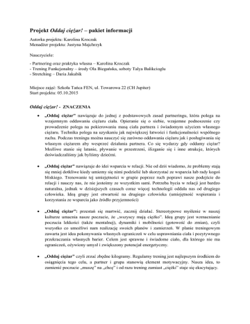 Projekt Oddaj ciężar! – pakiet informacji Autorka projektu: Karolina Kroczak Menadżer projektu: Justyna Majchrzyk Nauczyciele: - Partnering oraz praktyka własna – Karolina Kroczak - Trening Funkcjonalny – środy Ola Biegańska, soboty Talya Balikcioglu - Stretching – Daria Jakubik Miejsce zajęć: Szkoła Tańca FEN, ul. Towarowa 22 (CH Jupiter) Start projektu: 05.10.2015 Oddaj ciężar! - ZNACZENIA „Oddaj ciężar” nawiązuje do jednej z podstawowych zasad partneringu, która polega na wzajemnym oddawaniu ciężaru ciała. Opieranie się o siebie, wzajemne podnoszenie czy prowadzenie polega na pokierowaniu masą ciała partnera i świadomym użyciem własnego ciężaru. Technika polega na uzyskaniu jak największej łatwości i funkcjonalności wspólnego ruchu. Podczas treningu można nauczyć się zarówno oddawania ciężaru jak i posługiwania się własnym ciężarem aby wesprzeć działania partnera. Co się wydarzy gdy oddamy ciężar? Możliwe stanie się latanie, pływanie w przestrzeni, ślizganie się i inne atrakcje, których doświadczaliśmy jak byliśmy dziećmi. „Oddaj ciężar” nawiązuje do idei wsparcia w relacji. Nie od dziś wiadomo, że problemy stają się mniej dotkliwe kiedy umiemy się nimi podzielić lub skorzystać ze wsparcia lub rady kogoś bliskiego. Trenowanie tej umiejętności w grupie poprzez ruch poprawi nasze podejście do relacji i nauczy nas, że nie jesteśmy ze wszystkim sami. Potrzeba bycia w relacji jest bardzo naturalna, jednak w dzisiejszych czasach coraz więcej technologii oddala nas od drugiego człowieka. Ideą grupy jest otwartość na drugiego człowieka (umiejętność wspierania i korzystania ze wsparcia jako źródło przyjemności) „Oddaj ciężar”: przestań się martwić, zacznij działać. Stereotypowe myślenie w naszej kulturze umacnia nasze poczucie, że „wszyscy mają ciężko”. Ideą grupy jest wzmacnianie poczucia lekkości (także mentalnej), dynamiki i mobilności (gotowość do zmian), czyli wszystko co umożliwi nam realizację swoich planów i zamierzeń. W planie treningowym zawarta jest idea pokonywania własnych ograniczeń w celu usprawniania ciała i pozytywnego przekraczania własnych barier. Celem jest sprawne i świadome ciało, dla którego nie ma ograniczeń, ożywiony umysł i zwiększony potencjał energetyczny. „Oddaj ciężar” czyli zrzuć zbędne kilogramy. Regularny trening jest najlepszym środkiem do osiągnięcia tego celu, a partner i grupa stanowią element motywacyjny. Nasza idea, to zamienić poczucie „muszę” na „chcę” i od razu trening zamiast „ciężki” staje się ekscytujący. Oddaj ciężar! – GRUPY Grupa zamknięta Oferta skierowana do osób średniozaawansowanych i zaawansowanych w tańcu współczesnym lub innych dziedzinach ruchowych (sztuki walki, free run, akrobatyka, teatr fizyczny, yoga, acroyoga). Zajęcia obejmują szkolenie umiejętności z zakresu Partneringu, uzupełnione są o trening funkcjonalny i stretching z elementami akrobatyki. Częścią pracy jest praktyka własna (z partnerem) pod okiem nauczyciela. Dla członków grupy wszystkie zajęcia uwzględnione w grafiku są obowiązkowe. Grupa ma charakter zamknięty, w ciągu roku dołączenie do grupy możliwe jest po wcześniejszej aplikacji oraz tylko jeśli są wolne miejsca. ZAKRES MATERIAŁU: Partnerowanie: nauka poszczególnych elementów Partnerowanie: elementy grupowe Nauka fraz choreograficznych z partnerem Improwizacja zadaniowa z partnerem Technika partneringu Świadomość ciała i przepływu ruchu w kontakcie fizycznym Trening Funkcjonalny: wzmacnianie ciała, szybkość, sprawność Rozciąganie i elementy gimnastyczne Grupa otwarta Oferta skierowania do wszystkich osób zainteresowanych dbałością o swoją sprawność fizyczną, zdrowie oraz kondycję. Systematyczny trening jest kluczem do świetnej formy i smukłej sylwetki. W programie znajdują się zajęcia treningu funkcjonalnego (dla osób początkujących oraz bardziej zaawansowanych) oraz stretching, niezbędny w bezpiecznym i profesjonalnym podejściu do trenowania. Oddaj ciężar! – KONTAKT Justyna Majchrzyk – Menadżer projektu Tel. 504-769-426 e-mail: [email protected]