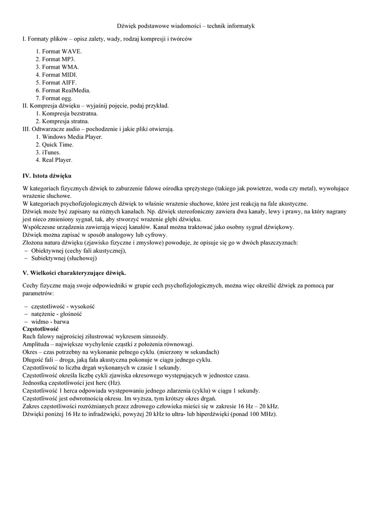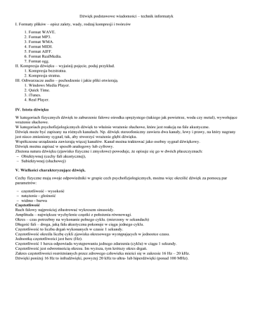 Dźwięk podstawowe wiadomości – technik informatyk I. Formaty plików – opisz zalety, wady, rodzaj kompresji i twórców 1. Format WAVE. 2. Format MP3. 3. Format WMA. 4. Format MIDI. 5. Format AIFF. 6. Format RealMedia. 7. Format ogg. II. Kompresja dźwięku – wyjaśnij pojęcie, podaj przykład. 1. Kompresja bezstratna. 2. Kompresja stratna. III. Odtwarzacze audio – pochodzenie i jakie pliki otwierają. 1. Windows Media Player. 2. Quick Time. 3. iTunes. 4. Real Player. IV. Istota dźwięku W kategoriach fizycznych dźwięk to zaburzenie falowe ośrodka sprężystego (takiego jak powietrze, woda czy metal), wywołujące wrażenie słuchowe. W kategoriach psychofizjologicznych dźwięk to właśnie wrażenie słuchowe, które jest reakcją na fale akustyczne. Dźwięk może być zapisany na różnych kanałach. Np. dźwięk stereofoniczny zawiera dwa kanały, lewy i prawy, na który nagrany jest nieco zmieniony sygnał, tak, aby stworzyć wrażenie głębi dźwięku. Współczesne urządzenia zawierają więcej kanałów. Kanał można traktować jako osobny sygnał dźwiękowy. Dźwięk można zapisać w sposób analogowy lub cyfrowy. Złożona natura dźwięku (zjawisko fizyczne i zmysłowe) powoduje, że opisuje się go w dwóch płaszczyznach: − Obiektywnej (cechy fali akustycznej), − Subiektywnej (słuchowej) V. Wielkości charakteryzujące dźwięk. Cechy fizyczne mają swoje odpowiedniki w grupie cech psychofizjologicznych, można więc określić dźwięk za pomocą par parametrów: − częstotliwość - wysokość − natężenie - głośność − widmo - barwa Częstotliwość Ruch falowy najprościej zilustrować wykresem sinusoidy. Amplituda – największe wychylenie cząstki z położenia równowagi. Okres – czas potrzebny na wykonanie pełnego cyklu. (mierzony w sekundach) Długość fali – droga, jaką fala akustyczna pokonuje w ciągu jednego cyklu. Częstotliwość to liczba drgań wykonanych w czasie 1 sekundy. Częstotliwość określa liczbę cykli zjawiska okresowego występujących w jednostce czasu. Jednostką częstotliwości jest herc (Hz). Częstotliwość 1 herca odpowiada występowaniu jednego zdarzenia (cyklu) w ciągu 1 sekundy. Częstotliwość jest odwrotnością okresu. Im wyższa, tym krótszy okres drgań. Zakres częstotliwości rozróżnianych przez zdrowego człowieka mieści się w zakresie 16 Hz – 20 kHz. Dźwięki poniżej 16 Hz to infradźwięki, powyżej 20 kHz to ultra- lub hiperdźwięki (ponad 100 MHz). Wykres obrazujący ruch falowy Wysokość dźwięku Cechą subiektywną pozwalającą rozróżniać dźwięki o różnej częstotliwości jest ich wysokość. Drgania z przedziału: • 16 – 300 Hz określa się, jako niskie • 300 Hz - 3000 Hz określa się, jako średnie • 3000 Hz - 20 kHz określa się, jako wysokie Zdolność rozpoznawania wysokości dźwięku zależy od czasu trwania. Dźwięki zbyt krótkie to impulsy lub trzaski. Minimalny czas trwania impulsu zależy od częstotliwości. Od niej zależy również zdolność rozpoznawania zmian w wysokości dźwięku. Natężenie dźwięku Natężenie dźwięku określa energię „czoła” fali, przepływającą w konkretnym czasie przez określoną powierzchnię. Natężenie maleje wraz z kwadratem odległości od źródła dźwięku. Natężenie dźwięku zależy od amplitudy drgań; jest większe, gdy amplituda drgań jest większa. Głośność Głośność to subiektywne odczucie natężenia dźwięku. Zależy zarówno od natężenia jak i częstotliwości. Im większe natężenie, tym większa głośność. Ale przy stałym natężeniu dźwięki niskie i wysokie wydają się cichsze niż dźwięki o średniej częstotliwości. Widmo dźwięku Każdy, dowolnie złożony, okresowy przebieg akustyczny (np. dźwięk muzyczny) dzięki analizie Fouriera można przedstawić, jako pewną kombinację tonów sinusoidalnych o różnej częstotliwości i amplitudzie. Drgania można zilustrować w postaci prążków na osi częstotliwości tak, by każdej częstotliwości współtworzącej dźwięk odpowiadał jeden prążek o wysokości reprezentującej jej amplitudę. Otrzymany w taki sposób obraz przedstawiający częstotliwości składowe i ich amplitudy tworzy widmo dźwięku. Najcelniejszym obrazem dźwięku, w pełni uwzględniającym jego istotę, a więc zmienność amplitudy i częstotliwości w czasie jest widmo trójwymiarowe. Barwa dźwięku To subiektywna cecha dźwięku, która pozwala odróżnić brzmienia różnych instrumentów lub głosu. Uzależniona jest od ilości, rodzaju i natężenia tonów składowych. Barwa zmienia się m.in. wraz z wysokością dźwięku. Barwa dwóch różnych dźwięków o tym samym tonie różni się ze względu na inne spektrum harmoniczne. Widmo trójwymiarowe VI. Analogowy zapis dźwięku Sygnał analogowy, to taki, w którym zmiany jednej wartości w sposób ciągły odpowiadają drugiej. Idea zapisu analogowego dźwięku polega na transformowaniu zmian dźwięku na zmiany parametrów fizycznych nośnika. A zatem jeśli natężenie dźwięku rośnie, to rośnie też np. namagnesowanie nośnika. Wadą zapisu analogowego jest nieuchronne pogarszanie się jakości dźwięku i pojawianie się tzw. szumów. Aby zapisać dźwięk analogowy należy zapisać jak zmienia się jego natężenie w czasie. Do tego celu można wykorzystać np. przetwornik elektroniczny, który zmieni natężenie dźwięku na natężenie indukcji magnetycznej na taśmie. W ten sposób wprost przełoży dźwięk na parametry fizyczne nośnika. Na taśmie magnetofonowej zostanie odwzorowany wykres a taśma przesuwając się z określoną prędkością spowoduje, że punkt na taśmie odpowiada punktowi z wykresu. Natężenie indukcji magnetycznej odpowiada natężeniu dźwięku. Zamiana różnic ciśnienia akustycznego na analogowy sygnał elektryczny VII. Cyfrowy zapis dźwięku By dźwięk mógł być wprowadzony do komputera, musi ulec przekszt