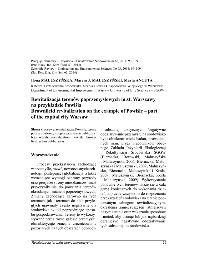 Przegląd Naukowy – Inżynieria i Kształtowanie Środowiska nr 63, 2014: 99–109 (Prz. Nauk. Inż. Kszt. Środ. 63, 2014) Scientific Review – Engineering and Environmental Sciences No 63, 2014: 99–109 (Sci. Rev. Eng. Env. Sci. 63, 2014) Ilona MAŁUSZYŃSKA, Marcin J. MAŁUSZYŃSKI, Marta ANCUTA Katedra Kształtowania Środowiska, Szkoła Główna Gospodarstwa Wiejskiego w Warszawie Department of Environmental Improvement, Warsaw University of Life Sciences – SGGW Rewitalizacja terenów poprzemysłowych m.st. Warszawy na przykładzie Powiśla Brownfield revitalization on the example of Powiśle – part of the capital city Warsaw Słowa kluczowe: rewitalizacja, Powiśle, tereny poprzemysłowe, miejska przestrzeń publiczna Key words: revitalization, Powiśle, brownfield, urban public areas Wprowadzenie Procesy przekształceń zachodzące w przemyśle, rozwój nowoczesnych technologii, postępująca globalizacja, a także wzrastające wymogi ochrony przyrody oraz presja ze strony mieszkańców miast przyczyniły się do powstania terenów określanych mianem poprzemysłowych. Zmiany zachodzące zarówno na tych terenach, jak i terenach do nich przyległych ujawniały często negatywne dla środowiska skutki poprzedniego sposobu gospodarowania. Tereny te wykorzystywane przez różne gałęzie przemysłu, charakteryzuje znaczne zróżnicowanie pozostałych na tych obszarach odpadów Rewitalizacja terenów poprzemysłowych... i substancji toksycznych. Negatywne oddziaływanie przemysłu na środowisko było obiektem wielu badań, prowadzonych m.in. przez pracowników obecnego Zakładu Inżynierii Ekologicznej i Rekultywacji Środowiska SGGW (Biernacka, Borowski, Małuszyńska i Małuszyński, 2006, Biernacka, Małuszyńska i Małuszyński, 2007, Małuszyńska, Biernacka, Małuszyński i Kośla, 2009, Małuszyński, Biernacka, Kośla i Małuszyńska, 2009). Wykorzystanie ponowne tych terenów wiąże się z całą gamą koniecznych do wykonania działań, a przede wszystkim do rozpoznania przekształceń środowiska na terenie poddawanym zabiegom rewitalizacyjnym, określenia zanieczyszczeń istniejących na tym terenie oraz wskazania sposobów i metod, aby usunąć lub jak najbardziej ograniczyć negatywne oddziaływanie tych substancji na środowisko. 99 Rozważając proces rewitalizacji miast, należy zwrócić uwagę na rozwój miasta i jednoczesną jego degradację, a także na skutki przestrzenne, społeczne, ekonomiczne i ekologiczne. Wymienione aspekty zostały uwzględnione przy tworzeniu definicji rewitalizacji na potrzeby projektu naukowego pt. „Rewitalizacja miast polskich jako sposób zachowania dziedzictwa materialnego i duchowego oraz czynnik zrównoważonego rozwoju”. Rewitalizację zdefiniowano jako skoordynowany proces, prowadzony wspólnie przez władzę samorządową, społeczność lokalną i innych uczestników, będących elementem polityki rozwoju i mających na celu przeciwdziałanie degradacji przestrzeni zurbanizowanej, zjawiskom kryzysowym, a także pobudzenie rozwoju i zmian jakościowych poprzez wzrost aktywności społecznej i gospodarczej, poprawę środowiska zamieszkania oraz ochronę dziedzictwa narodowego, z zachowaniem zasad zrównoważonego rozwoju (Jarczewski, 2010). Pozytywne zmiany, jakie zachodzą na obszarach poprzemysłowych, szczególnie położonych w strefach śródmiejskich, wskutek ich rewitalizacji przyczyniają się do powstania nowego ładu przestrzennego miasta. Realizacja projektów i zadań inwestycyjnych obejmujących rewitalizację uzależniona jest między innymi od pozyskanych funduszy z różnych źródeł. Wśród nich znaczną część stanowią fundusze strukturalne, dotacje i inne środki zewnętrzne. Realizacja działań z zakresu rewitalizacji jest możliwa m.in. dzięki tworzonym zintegrowanym programom operacyjnym rozwoju regionalnego (ZPORR) w ramach, których jednym z priorytetów jest „Rozwój Lokalny”, obejmujący m.in. działanie dotyczące „zdegradowanych obszarów miejskich, poprzemysłowych i powojskowych” (Ministerstwo Gospodarki i Pracy, 2004). Realizacja przewidzianego programu rewitalizacji obejmuje powtórne zagospodarowanie terenów zdegradowanych przy uwzględnieniu celów: 1) ożywienia gospodarczego i społecznego; 2) wzrostu potencjału turystycznego obszarów zdegradowanych przez wsparcie wszechstronnych projektów działań technicznych; 3) rozwiązywanie problemów społecznych, m.in. walka z patologiami społecznymi; 4) podniesienie atrakcyjności inwestycyjnej terenów poddanych rewitalizacji. Zdaniem Sztando (2008), budowa i aplikacja programu rewitalizacji danego wycinka struktury miejskiej jest zabiegiem złożonym. Wymaga bowiem przeprowadzenia wielu działań o charakterze diagnostycznym, konsultacyjnym, negocjacyjnym, planistycznym, prawnym, wdrożeniowym i monitoringowym – korygowania projektów i działań w trakcie ich realizacji za pomocą pomiaru efektów rewitalizacji oraz kompleksowej oceny po zakończeniu realizacji projektu. Wyłączone z użytkowania powierzchnie poprzemysłowe w wyniku ich rewitalizacji nie stanowią już zagrożenia dla środowiska, a poprzez zmianę sposobu zagospodarowania terenu pełnią nowe funkcje zaproponowane w wyniku dialogu społecznego, stając się obszarami, na których zlokalizowane są obiekty: handlowo-usługowe, gospodarcze, edukacyjne, społeczne, kulturalne, rekreacyjne i turystyczne. 100 I. Małuszyńska, M.J. Małuszyński, M. Ancuta Kontynuacja działań prowadzonych w ramach ZPORR w latach 2004–2006 była możliwa dzięki utworzonym dla każdego z województw regionalnym programom operacyjnym (RPO) w perspektywie na lata 2007–2013 oraz 2014–2020. W ramach tych programów możliwe było lub będzie wsparcie działań obejmujących realizację projektów uwzględniających zagadnienie innowacyjności, co jest ściśle związane z realizacją polityki spójności i strategii „Europa 2020”. Niniejsze opracowanie miał