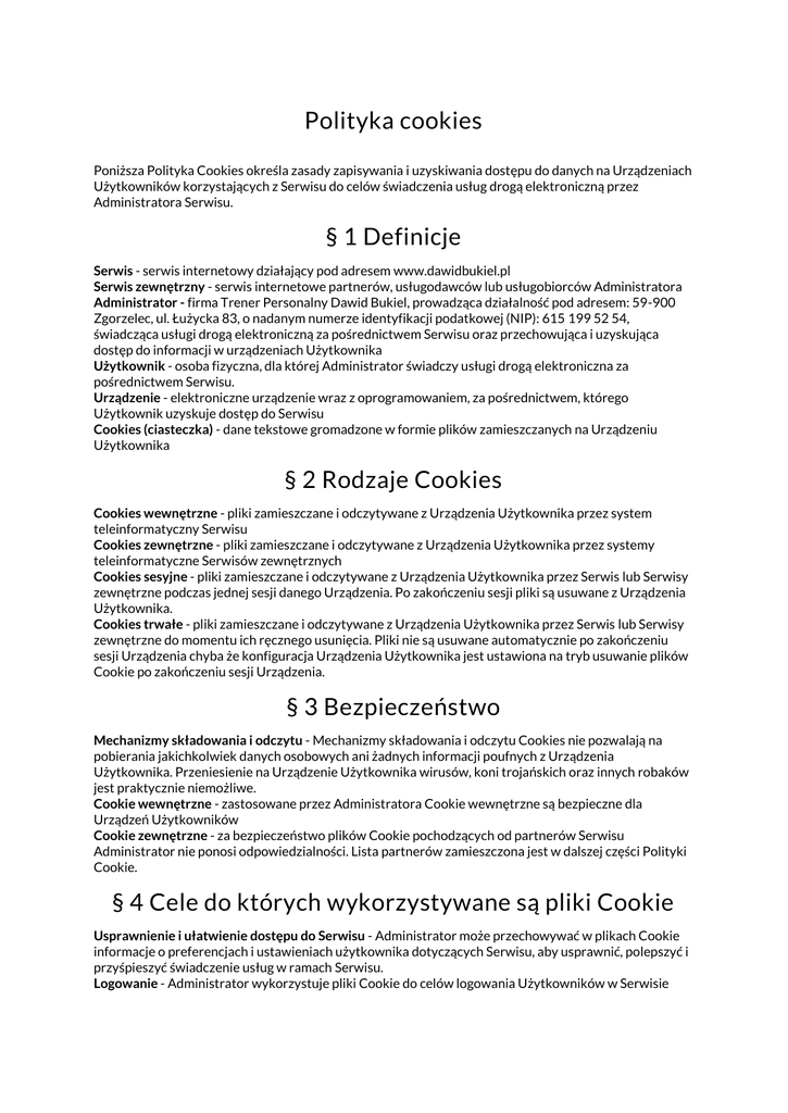 Polityka cookies Poniższa Polityka Cookies określa zasady zapisywania i uzyskiwania dostępu do danych na Urządzeniach Użytkowników korzystających z Serwisu do celów świadczenia usług drogą elektroniczną przez Administratora Serwisu. § 1 Definicje Serwis - serwis internetowy działający pod adresem www.dawidbukiel.pl Serwis zewnętrzny - serwis internetowe partnerów, usługodawców lub usługobiorców Administratora Administrator - firma Trener Personalny Dawid Bukiel, prowadząca działalność pod adresem: 59-900 Zgorzelec, ul. Łużycka 83, o nadanym numerze identyfikacji podatkowej (NIP): 615 199 52 54, świadcząca usługi drogą elektroniczną za pośrednictwem Serwisu oraz przechowująca i uzyskująca dostęp do informacji w urządzeniach Użytkownika Użytkownik - osoba fizyczna, dla której Administrator świadczy usługi drogą elektroniczna za pośrednictwem Serwisu. Urządzenie - elektroniczne urządzenie wraz z oprogramowaniem, za pośrednictwem, którego Użytkownik uzyskuje dostęp do Serwisu Cookies (ciasteczka) - dane tekstowe gromadzone w formie plików zamieszczanych na Urządzeniu Użytkownika § 2 Rodzaje Cookies Cookies wewnętrzne - pliki zamieszczane i odczytywane z Urządzenia Użytkownika przez system teleinformatyczny Serwisu Cookies zewnętrzne - pliki zamieszczane i odczytywane z Urządzenia Użytkownika przez systemy teleinformatyczne Serwisów zewnętrznych Cookies sesyjne - pliki zamieszczane i odczytywane z Urządzenia Użytkownika przez Serwis lub Serwisy zewnętrzne podczas jednej sesji danego Urządzenia. Po zakończeniu sesji pliki są usuwane z Urządzenia Użytkownika. Cookies trwałe - pliki zamieszczane i odczytywane z Urządzenia Użytkownika przez Serwis lub Serwisy zewnętrzne do momentu ich ręcznego usunięcia. Pliki nie są usuwane automatycznie po zakończeniu sesji Urządzenia chyba że konfiguracja Urządzenia Użytkownika jest ustawiona na tryb usuwanie plików Cookie po zakończeniu sesji Urządzenia. § 3 Bezpieczeństwo Mechanizmy składowania i odczytu - Mechanizmy składowania i odczytu Cookies nie pozwalają na pobierania jakichkolwiek danych osobowych ani żadnych informacji poufnych z Urządzenia Użytkownika. Przeniesienie na Urządzenie Użytkownika wirusów, koni trojańskich oraz innych robaków jest praktycznie niemożliwe. Cookie wewnętrzne - zastosowane przez Administratora Cookie wewnętrzne są bezpieczne dla Urządzeń Użytkowników Cookie zewnętrzne - za bezpieczeństwo plików Cookie pochodzących od partnerów Serwisu Administrator nie ponosi odpowiedzialności. Lista partnerów zamieszczona jest w dalszej części Polityki Cookie. § 4 Cele do których wykorzystywane są pliki Cookie Usprawnienie i ułatwienie dostępu do Serwisu - Administrator może przechowywać w plikach Cookie informacje o preferencjach i ustawieniach użytkownika dotyczących Serwisu, aby usprawnić, polepszyć i przyśpieszyć świadczenie usług w ramach Serwisu. Logowanie - Administrator wykorzystuje pliki Cookie do celów logowania Użytkowników w Serwisie Marketing i reklama - Administrator oraz Serwisy zewnętrzne wykorzystują pliki Cookie do celów marketingowych oraz serwowania reklam Użytkowników. Dane statystyczne - Administrator oraz Serwisy zewnętrzne wykorzystuje pliki Cookie do zbierania i przetwarzania danych statystycznych takich jak np. statystyki odwiedzin, statystyki Urządzeń Użytkowników czy statystyki zachowań użytkowników. Dane te zbierane są w celu analizy i ulepszania Serwisu. Serwowanie usług multimedialnych - Administrator oraz Serwisy zewnętrzne wykorzystuje pliki Cookie do serwowania Użytkownikom usług multimedialnych. Usługi społecznościowe - Administrator oraz Serwisy zewnętrzne wykorzystują pliki Cookie do wsparcia usług społecznościowych § 5 Serwisy zewnętrzne Administrator współpracuje z następującymi serwisami zewnętrznymi, które mogą zamieszczać pliki Cookie na Urządzeniach Użytkownika: Google Analytics Google AdSense Google AdWords Google+ Facebook Twitter AddThis Youtube Vimeo § 6 Możliwości określania warunków przechowywania i uzyskiwania dostępu na Urządzeniach Użytkownika przez Serwis i Serwisy zewnętrzne Użytkownik może w dowolnym momencie, samodzielnie zmienić ustawienia dotyczące zapisywania, usuwania oraz dostępu do danych zapisanych plików Cookies Informacje o sposobie wyłączenia plików Cookie w najpopularniejszych przeglądarkach komputerowych i urządzeń mobilnych dostępna są na stronie: http://jakwylaczyccookie.pl/ Użytkownik może w dowolnym momencie usunąć wszelkie zapisane do tej pory pliki Cookie korzystając z narzędzi Urządzenia Użytkownika za pośrednictwem którego Użytkownik korzysta z usług Serwisu. § 7 Wymagania Serwisu Ograniczenie zapisu i dostępu do plików Cookie na Urządzeniu Użytkownika może spowodować nieprawidłowe działanie niektórych funkcji Serwisu. Administrator nie ponosi żadnej odpowiedzialności za nieprawidłowo działające funkcje Serwisu w przypadku, gdy Użytkownik ograniczy w jakikolwiek sposób możliwość zapisywania i odczytu plików Cookie. § 8 Zmiany w Polityce Cookie Administrator zastrzega sobie prawo do dowolnej zmiany niniejszej Polityki Cookie bez konieczności informowania o tym użytkowników. Wprowadzone zmiany w Polityce Cookie zawsze będą publikowane na tej stronie. Wprowadzone zmiany wchodzą w życie w dniu publikacji Polityki Cookie.