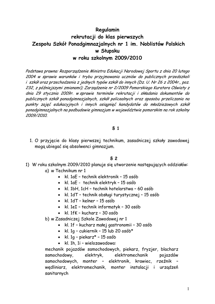 Regulamin rekrutacji do klas pierwszych Zespołu Szkół Ponadgimnazjalnych nr 1 im. Noblistów Polskich w Słupsku w roku szkolnym 2009/2010 Podstawa prawna: Rozporządzenie Ministra Edukacji Narodowej Sportu z dnia 20 lutego 2004 w sprawie warunków i trybu przyjmowania uczniów do publicznych przedszkoli i szkół oraz przechodzenia z jednych typów szkół do innych (Dz. U. Nr 26 z 2004r., poz. 232, z późniejszymi zmianami); Zarządzenie nr 2/2009 Pomorskiego Kuratora Oświaty z dnia 29 stycznia 2009r. w sprawie terminów rekrutacji i składania dokumentów do publicznych szkół ponadgimnazjalnych, szkół policealnych oraz sposobu przeliczania na punkty zajęć edukacyjnych i innych osiągnięć kandydatów do młodzieżowych szkół ponadgimnazjalnych na podbudowie gimnazjum w województwie pomorskim na rok szkolny 2009/2010. § 1 1. O przyjęcie do klasy pierwszej technikum, zasadniczej szkoły zawodowej mogą ubiegać się absolwenci gimnazjum. § 2 1) W roku szkolnym 2009/2010 planuje się utworzenie następujących oddziałów: a) w Technikum nr 1 kl. 1aE – technik elektronik – 15 osób kl. 1aE - technik elektryk – 15 osób kl. 1bH, 1cH – technik hotelarstwa – 60 osób kl. 1dT – technik obsługi turystycznej – 15 osób kl. 1dT – kelner – 15 osób kl. 1eI – technik informatyk – 30 osób kl. 1fK – kucharz – 30 osób b) w Zasadniczej Szkole Zawodowej nr 1 kl. 1f – kucharz małej gastronomii – 30 osób kl. 1g – cukiernik – 15 lub 20 osób* kl. 1g – piekarz* – 15 osób kl. 1h, 1i – wielozawodowa: mechanik pojazdów samochodowych, piekarz, fryzjer, blacharz samochodowy, elektryk, elektromechanik pojazdów samochodowych, monter – elektronik, krawiec, rzeźnik – wędliniarz, elektromechanik, monter instalacji i urządzeń sanitarnych 1 2. * W razie zapotrzebowania przewiduje się przekształcenie klasy 1g w zawodzie cukiernik w oddział integracyjny. W przypadku utworzenia takiego oddziału kandydaci zakwalifikowani do nauki w zawodzie piekarz zostaną umieszczeni w klasie wielozawodowej (1h lub 1i). 1. Dokumenty obowiązujące kandydata ubiegającego się o przyjęcie do Zespołu Szkół Ponadgimnazjalnych nr 1 im. Noblistów Polskich w Słupsku: a) Podanie o przyjęcie do szkoły na wymaganym druku. b) Poświadczona kopia świadectwa ukończenia gimnazjum, we wskazanym terminie oryginał. c) Poświadczona kopia zaświadczenia o szczegółowych wynikach egzaminu przeprowadzonego w ostatnim roku nauki w gimnazjum, we wskazanym terminie oryginał. d) Inne, posiadane przez kandydata zaświadczenia, np. opinia publicznej poradni pedagogiczno – psychologicznej o potrzebie kształcenia specjalnego, wydana przez zespół orzekający. e) Zaświadczenie/zaświadczenia o uzyskaniu tytułu laureata lub finalisty olimpiad lub konkursów. f) Zaświadczenie lekarskie o braku przeciwwskazań zdrowotnych do kształcenia w określonym zawodzie. g) We wskazanym w harmonogramie terminie: dwie fotografie karta informacyjna w przypadku młodocianych pracowników – umowa o pracę lub zaświadczenie od pracodawcy o zamiarze zawarcia umowy o pracę w celu przygotowania zawodowego w formie nauki zawodu z dniem 1.09.2008 r. 2. Kandydat ma prawo równocześnie wybrać co najwyżej trzy różne szkoły. Pod pojęciem „szkoła” należy rozumieć każdą szkołę wchodzącą w skład zespołu szkół, a więc: Technikum nr 1, Zasadniczą Szkołę Zawodową nr 1. 3. Kandydat w podaniu, na liście preferencji wskazuje kolejno interesujące go klasy wybranych trzech szkół. 4. Podania należy składać w szkole pierwszego wyboru. 5. Dyrektor zakłada rejestr wpływających podań. 6. Oddziału nie tworzy się przy liczbie chętnych poniżej dwudziestu pięciu, chyba że organ prowadzący postanowi inaczej. 7. Szkołą zastrzega sobie prawo do zmiany planu naboru w określonych zawodach w przypadku braku wystarczającej liczby chętnych. 2 § 3 1. O przyjęciu kandydata do klasy pierwszej technikum, zasadniczej szkoły zawodowej decyduje suma punktów, której składnikami są: a) punkty uzyskane w wyniku egzaminu gimnazjalnego, zawarte w zaświadczeniu ( maksymalnie można uzyskać 100 pkt. ); b) punkty uzyskane za oceny z zajęć edukacyjnych (maksymalnie można uzyskać 76 pkt.); c) punkty uzyskane za inne osiągnięcia, wymienione w świadectwie ukończenia gimnazjum, które uwzględnia się w procesie rekrutacji ( maksymalnie 24 pkt.). 2. Ustala się progi punktowe dla poszczególnych klas: a) technik obsługi turystycznej – 70 pkt. b) kucharz – 70 pkt. c) kelner – 70 pkt. d) technik elektryk – 70 pkt. e) technik informatyk – 70 pkt. f) technik elektronik – 70 pkt. g) technik hotelarstwa – 80 pkt. h) klasy Zasadniczej Szkoły Zawodowej nr 1 (wszystkie zawody) –45 pkt. a) Próg punktowy nie dotyczy kandydatów posiadających orzeczenia o potrzebie kształcenia specjalnego, ubiegających się o przyjęcie do oddziału integracyjnego w zawodzie cukiernik w Zasadniczej Szkole Zawodowej nr 1. § 4 1. Punkty pochodzące z przeliczenia ocen uzyskanych na świadectwie ukończenia gimnazjum są przyznawane z języka polskiego, obowiązkowego języka obcego, matematyki oraz jednych zajęć edukacyjnych w zależności od typu szkoły: a) Technikum nr 1 w zawodzie technik elektronik – fizyka b) Technikum nr 1 w zawodzie technik elektryk – fizyka c) Technikum nr 1 w zawodzie technik informatyk – fizyka d) Technikum nr 1 w zawodzie technik hotelarstwa – geografia e) Technikum nr 1 w zawodzie technik obsługi turystycznej– geografia f) Technikum nr 1 w zawodzie kucharz– biologia g) Technikum nr 1 w zawodzie kelner - geografia h) Zasadnicza Szkoła Zawodowa nr 1 – technika 3 2. Sposób przeliczania na punkty ocen z zajęć edukacyjnych: a) celujący – 19 punktów b) bardzo dobry – 15 punktów c) dobry – 11 punktów d) dostateczny – 7 punktów § 5 1. Punktacji podlegają inne osiągnięcia kandydata wymienione na świadectwie ukończeni