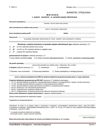 Strzegom, dnia ………................................ F- 1/RIG (1) WNIOSEK BURMISTRZ STRZEGOMIA o wydanie zezwolenia na sprzedaż napojów alkoholowych Oznaczenie przedsiębiorcy: …………………………………………………..……….………………………………………………………... (nazwisko i imię lub nazwa osoby prawnej) adres zamieszkania lub siedziba osoby prawnej …………………...………………………..………….…………………………..………..… (ulica nr, kod pocztowy, miejscowość) Numer identyfikacji podatkowej NIP: Pełnomocnik: ……………......…………………….. telefon …………………………………………. ................................................................................................................................................................................... (w przypadku ustanowienia pełnomocników ich imiona, nazwiska i adres zamieszkania, nr telefonu) Wnioskuję o wydanie zezwolenia na sprzedaż napojów alkoholowych typu (właściwe zaznaczyć „X”): □ □ □ „A” - do 4,5% zawartości alkoholu oraz na piwo „B” - od 4,5% do 18% zawartości alkoholu (z wyjątkiem piwa) „C” - powyżej 18% zawartości alkoholu przeznaczonych do spożycia (właściwe zaznaczyć „X”): □ poza miejscem sprzedaży (sklep) □ na miejscu sprzedaży (lokal gastronomiczny) □ u klienta (zezwolenie na organizację przyjęć) dla punktu sprzedaży: …………………………………………………………….…………………………………………………………. nazwa punktu sprzedaży oraz dokładny adres i miejscowość, ulica, nr lokalu) w budynku (właściwe zaznaczyć „X”): □ Placówka nowo uruchamiana □ □ mieszkalnym □ Kontynuacja działalności □ niemieszkalnym Zmiana przedsiębiorcy w istniejącej placówce ………………….………………………………………………………………………………………………………………………………. numer w rejestrze przedsiębiorców (KRS) lub ewidencji działalności gospodarczej (podać pełny nr i organ rejestrowy) Przedmiot działalności gospodarczej wg PKD 2007 (zaznaczyć „X” działalność dominującą): □ 47.11.Z Sprzedaż detaliczna prowadzona w niewyspecjalizowanych sklepach z przewagą żywności, napojów i wyrobów tytoniowych □ 47.19.Z Pozostała sprzedaż detaliczna prowadzona w niewyspecjalizowanych sklepach □ 47.25.Z Sprzedaż detaliczna napojów alkoholowych prowadzona w wyspecjalizowanych sklepach □ 56.10.A Restauracje i inne stałe placówki gastronomiczne □ 56.30.A Przygotowywanie i podawanie napojów (bar) □ 56.21.Z Przygotowywanie i dostarczanie żywności dla odbiorców zewnętrznych (katering) Adres punktu składowania napojów alkoholowych ( magazynu dystrybucyjnego )...................................................................... Godziny otwarcia placówki (do wiadomości Urzędu): ............................................................................................................... Uwagi(adres do korespondencji/inne): ..................................................................................................................................... ........................................................................................................................................................................................ Oświadczam, że znane mi są przepisy ustawy o wychowaniu w trzeźwości i przeciwdziałaniu alkoholizmowi ustawy z dnia 26.10.1982 r. o wychowaniu w trzeźwości i przeciwdziałaniu alkoholizmowi (Dz.U. z 2007 r. Nr 70, poz. 473 z późn.zm.) oraz uchwały Nr 93/02 Rady Miejskiej w Strzegomiu z dnia 30.12. 2002 r. * w przypadku prowadzenia działalności na podstawie umowy spółki cywilnej – podpisy wszystkich wspólników Wykaz dokumentów jakie należy dołączyć do wniosku oraz dodatkowe informacje na str. 2 wniosku Urząd Miejski w Strzegomiu – www.bip.strzegom.pl ……………………………… podpis wnioskodawcy* Strona 1 Do wniosku należy dołączyć następujące dokumenty: 1) dokument potwierdzający tytuł prawny wnioskodawcy do lokalu stanowiącego punkt sprzedaży napojów alkoholowych; 2) pisemną zgodę właściciela, użytkownika, zarządcy lub administratora budynku, jeżeli punkt sprzedaży będzie zlokalizowany w budynku mieszkalnym wielorodzinnym; 3) decyzję właściwego państwowego inspektora sanitarnego o zatwierdzeniu zakładu, o której mowa w art.65 ust.1 pkt 2 o bezpieczeństwie żywności i żywienia (Dz.U. z 2010 r. Nr 136, poz. 914 z późn. zm.). 4) pełnomocnictwo wraz z dowodem uiszczenia opłaty skarbowej w wysokości 17 zł - w przypadku ustanowienia pełnomocnika. Od opłaty skarbowej zwolnione jest pełnomocnictwo udzielone małżonkowi, wstępnemu, zstępnemu lub rodzeństwu (art.4 ustawy o opłacie skarbowej Dz.U. z 2006r. Nr 225,poz.1635 z późn. zm.). Uwaga: Wniosek złożony bez wymaganych dokumentów (załączników) i nieuzupełniony w terminie 7 dni od dnia doręczenia przedsiębiorcy wezwania, zostanie pozostawiony bez rozpoznania – podstawa prawna: art. 64 § 2 ustawy z dnia 14 czerwca 1960 r. Kodeks postępowania administracyjnego (Dz.U. z 2000 r. Nr 98, poz. 1071 z późn.zm.). Opłata: ● Opłata roczna dla przedsiębiorców rozpoczynających działalność w zakresie sprzedaży napojów alkoholowych, na podstawie art. 111 ust. 2 i 3 ustawy o wychowaniu w trzeźwości i przeciwdziałaniu alkoholizmowi (Dz. U. z 2007r. Nr 70, poz. 473 z późn.zm.): 525 zł na sprzedaż napojów zawierających do 4,5% alkoholu oraz piwa, 525 zł na sprzedaż napojów zawierających powyżej 4,5% do 18% alkoholu(za wyjątkiem piwa), - 2.100 zł na sprzedaż napojów zawierających powyżej 18% alkoholu. ● Opłata roczna dla przedsiębiorców prowadzących sprzedaż napojów alkoholowych, na podstawie art. 111 u