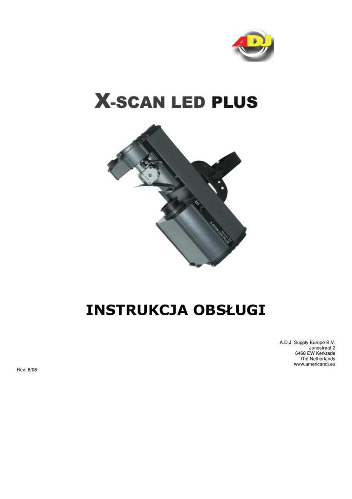 INSTRUKCJA OBSŁUGI Rev. 8/08 A.D.J. Supply Europe B.V. Junostraat 2 6468 EW Kerkrade The Netherlands www.americandj.eu Contents INFORMACJE OGÓLNE ............................................................................................................................................................ 3 OGÓLNE WSKAZÓWKI ............................................................................................................................................................ 3 CHARAKTERYSTYKA ................................................................................................................................................................. 3 BEZPIECZNA OBSŁUGA ............................................................................................................................................................ 3 ŚRODKI BEZPIECZEŃSTWA ...................................................................................................................................................... 4 USTAWIENIA ........................................................................................................................................................................... 5 MENU SYSTEMU ..................................................................................................................................................................... 7 DZIAŁANIE ............................................................................................................................................................................... 9 STEROWANIE KONSOLĄ UC3 .................................................................................................................................................. 9 CECHY DMX ........................................................................................................................................................................... 10 WYMIANA BEZPIECZNIKA ..................................................................................................................................................... 12 CZYSZCZENIE ......................................................................................................................................................................... 12 USUWANIE USTEREK............................................................................................................................................................. 12 SPECYFIKACJA ....................................................................................................................................................................... 13 ROHS – OLBRZYMI WKŁAD W OCHRONĘ ŚRODOWISKA ...................................................................................................... 14 WEEE – ODPADY Z URZĄDZEŃ ELEKTRYCZNYCH I ELEKTRONICZNYCH ................................................................................ 15 A.D.J. Supply Europe B.V. – www.americandj.eu – X-Scan LED™ Instrukcja obsługi Strona 2 INFORMACJE OGÓLNE Wypakowanie: Dziękujemy za zakup urządzenia świetlnego X-Scan LED™ firmy American DJ®. KaŜdy egzemplarz X-Scan LED™ został gruntownie przetestowany, co jest gwarancją jego prawidłowego funkcjonowania. Przed rozpakowaniem naleŜy sprawdzić czy opakowanie nie zostało uszkodzone w czasie transportu. W razie stwierdzenia uszkodzenia opakowania, dokładnie sprawdź, czy nie nastąpiło uszkodzenie sprzętu oraz upewnij się, Ŝe wszystkie części konieczne do obsługi urządzenia przybyły w stanie nienaruszonym. W razie stwierdzenia usterek lub braku części, naleŜy skontaktować się z bezpłatnym biurem obsługi klienta. Prosimy o taki kontakt przed podjęciem decyzji o zwrocie urządzenia do sprzedawcy. Wstęp: X-Scan LED™ jest ośmiokanałowym inteligentnym skanerem diodowym kompatybilnym z systemem DMX. Urządzenie X-Scan LED™ moŜe być uŜywane samodzielnie w trybie Stand Alone lub w konfiguracji Master/Slave. X-Scan LED™ posiada dwa tryby operacyjne: tryb reakcji na dźwięk (Sound Active Mode) oraz tryb sterowania sygnałem DMX. W celu osiągnięcia lepszych efektów poprzez poprawienie widoczności projektowanej wiązki światła, naleŜy równocześnie uŜyć maszyny mgielnej lub dymu do efektów specjalnych. Urządzenie X-Scan LED™ zawiera nowe zaawansowane źródło światła o duŜej wydajności – 30% jaśniejsze niŜ 20W źródło diodowe stosowane dotychczas w urządzeniach X-Scan LED. Obsługa klienta: Jeśli pojawią się jakiekolwiek problemy związane z obsługą sprzętu, prosimy skontaktować się z najbliŜszym sklepem American Audio. MoŜna równieŜ skontaktować się z nami bezpośrednio poprzez naszą stronę internetową www.americandj.eu oraz pod adresem email: [email protected] OstrzeŜenie! Aby zapobiec lub zmniejszyć ryzyko poraŜenia prądem lub poŜaru, nie włączaj urządzenia w warunkach deszczowych lub przy podwyŜszonej wilgotności powietrza. OstrzeŜenie! Urządzenie moŜe powaŜnie uszkodzić wzrok. Nie naleŜy patrzeć bezpośrednio na źródło światła. OGÓLNE WSKAZÓWKI Aby w pełni wykorzystać moŜliwości urządzenia X-Scan LED™, prosimy o przeczytanie instrukcji obsługi i zapoznanie z podstawowymi funkcjami urządzenia. Instrukcja zawiera waŜne informacje dotyczące bezpieczeństwa obsługi oraz sposobu konserwacji urządzenia. Prosimy o zachowanie instrukcji obsługi w celu ponownego uŜycia. CHARAKTERYSTYKA • Kompatybilny z protokołem DMX-512 (8 kanałów DMX) • Szybka zmiana pozycji lustra X/Y • 2 tryby operacyjne – tryb reakcji na dźwięk (Sound Active) I tryb sterowania sygnałem DMX • Wbudowany mikrofon wewnętrzny • Wyświetlacz cyfrowy dla ustawiania adresów i funkcji • Kompatybilny z konsolą UC3 (sprzedawana osobno) BEZPIECZNA OBSŁUGA Uwaga! Urządzenie nie zawiera Ŝadnych elementów przeznaczonych do serwisowania przez uŜytkownika. Gwarancja na urządzenie traci waŜnoś