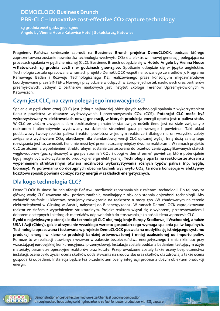 Hotel | Sokolska 24, Katowice DEMOCLOCK Business Brunch PBR-CLC – Innovative cost-effective CO2 capture technology 13 grudnia 2016 godz. 9:00-13:00 Angelo by Vienna House Katowice Hotel | Sokolska 24, Katowice Pragniemy Państwa serdecznie zaprosić na Bussienes Brunch projektu DemoCLOCK, podczas którego zaprezentowana zostanie nowatorska technologia wychwytu CO2 dla elektrowni nowej generacji, polegająca na procesach spalania w pętli chemicznej (CLC). Bussienes Brunch odbędzie się w Hotelu Angelo by Vienna House w Katowicach 13 grudnia 2016 r w godzinach 9:00-13:00. Spotkanie odbędzie się w języku angielskim. Technologia została opracowana w ramach projektu DemoCLOCK współfinansowanego ze środków 7. Programu Ramowego Badań i Rozwoju Technologicznego KE, realizowanego przez konsorcjum międzynarodowe koordynowane przez SINTEF z Norwegii przy udziale wiodących w Europie jednostek naukowych oraz partnerów przemysłowych. Jednym z partnerów naukowych jest Instytut Ekologii Terenów Uprzemysłowionych w Katowicach. Czym jest CLC, na czym polega jego innowacyjność? Spalanie w pętli chemicznej (CLC) jest jedną z najbardziej obiecujących technologii spalania z wykorzystaniem tlenu z powietrza w obszarze wychwytywania i przechowywania CO2 (CCS). Potencjał CLC może być wykorzystywany w elektrowniach nowej generacji, w których produkcja energii oparta jest o paliwa stałe. W CLC ze złożem z wypełnieniem strukturalnym, materiał stanowiący nośnik tlenu jest na stale związany z reaktorem i alternatywnie wystawiany na działanie strumieni gazu paliwowego i powietrza. Taki układ podstawowy tworzy reaktor paliwa i reaktor powietrza w jednym reaktorze i dlatego ma on wszystkie zalety związane z wychwytem CO2, określanym dla standardowej wersji CLC opisanej wyżej. Inną dużą zaletą tego rozwiązania jest to, że nośnik tlenu nie musi być przemieszczany między dwoma reaktorami. W ramach projektu CLC ze złożem z wypełnieniem strukturalnym zostanie zastosowana do przetworzenia zgazyfikowanych stałych węglowodorów (gaz syntezowy) w gorący strumień CO2 i ubogi w tlen strumień powietrza, które potencjalnie będą mogły być wykorzystane do produkcji energii elektrycznej. Technologia oparta na reaktorze ze złożem z wypełnieniem strukturalnym otwiera możliwości wykorzystywania różnych typów paliwa (np. węgla, biomasy). W porównaniu do dostępnych obecnie technik wychwytu CO2, ta nowa koncepcja w efektywny kosztowo sposób powinna obniżyć straty energii w zakładach energetycznych. Dla kogo technologia CLC? DemoCLOCK Business Brunch oferuje Państwu możliwość zapoznania się z zaletami technologii. Do tej pory za główną wadę CLC uważano niski poziom zaufania, wynikający z niskiego stopnia dojrzałości technologii. Aby wzbudzić zaufanie u klientów, testujemy rozwiązanie na reaktorze o mocy 500 kW zbudowanym na terenie elektrociepłowni w Güssing w Austrii, nalężącej do Bioenergy2000+. W ramach DemoCLOCK zaprojektowano reaktor ze złożem z wypełnieniem strukturalnym. Projekt reaktora wiązał się z wyborem, przetestowaniem i doborem dostępnych i niedrogich materiałów odpowiednich do stosowania jako nośnik tlenu w procesie CLC. Rynki o największym potencjale dla technologii CLC obejmują kraje Europy Środkowej i Wschodniej, a także USA i Azji (Chiny), gdzie utrzymanie wysokiego wzrostu gospodarczego wymaga spalania paliw kopalnych. Technologia opracowana i testowana w projekcie DemoCLOCK pozwala na modyfikację istniejącego systemu produkcji energii w kierunku produkcji bardziej zrównoważonej i mniej uzależnionej od importu paliw. Pomoże to w realizacji stawianych wyzwań w zakresie bezpieczeństwa energetycznego i zmian klimatu przy wzrastającej europejskiej konkurencyjności przemysłowej. Instalacja została poddana badaniom testującym użyte materiały, parametry operacyjne reaktorów oraz koszty. Przeprowadzone zostały także oceny bezpieczeństwa instalacji, ocena cyklu życia i ocena skutków oddziaływania na środowisko oraz skutków dla zdrowia, a także ocena gospodarki odpadami. Instalacja będzie też przedmiotem oceny integracji procesu z dużym obiektem produkcji energii. DEMOCLOCK Business Brunch PBR-CLC – Innovative cost-effective CO2 capture technology 13 grudnia 2016 godz. 9:00-13:00 Angelo by Vienna House Katowice Hotel | Sokolska 24, Katowice Program DemoCLOCK Business Brunch 13 grudnia 2016 | 9:00-13:00 Angelo by Vienna House Katowice Hotel | Sokolska 24, Katowice Spotkanie będzie prowadzone w języku angielskim. 9.00 – 9.30 Welcoming Breakfast 9.30 - 9.50 Demonstration of a Chemical Looping Combustion system for power production with CO2 capture (20') Shahriar Amini – SINTEF 9.50 - 10.15 CLC based power plant: plant arrangement, heat management and performance assessment (25') Paolo Chiesa – Politecnico di Milano 10.15 - 10. 35 Technical features of the system and overall plant configuration (20’) Ruben van Ruijven – Array Industries 10.35 - 10.50 Environmental aspects of the configuration (15') Janina Fudala – Institute for Ecology of Industrial Areas 10.50 - 11.30 Economic aspects of a full-scale CLC plant, comparison with other zero emission technologies (40') Luca Mancuso – Amec Foster Wheeler 11.30 - 11.50 Q&A 11.50 - 12.45 Light Lunch Jak wziąć udział w DemoCLOCK Bussines Brunch? Liczba uczestników ograniczona. Warunkiem udziału w DemoCLOCK Business Brunch jest wypełnienie i podpisanie formularza zgłoszeniowego oraz przesłanie pocztą elektroniczną na adres: [email protected] Termin nadsyłania zgłoszeń: do 6 grudnia 2016 r. Gdzie znaleźć dodatkowe informacje o projekcie? Więcej informacji o projekcie DemoCLOCK: http://www.sintef.no/Projectweb/DemoClock/ Projekt otrzymał dofinansowanie z Unii Europejskiej w ramach 7.Programu Ramowego w obszarze badań, rozwoju technologicznego i demonstracji w ramach umowy o dofinansowanie nr 268112