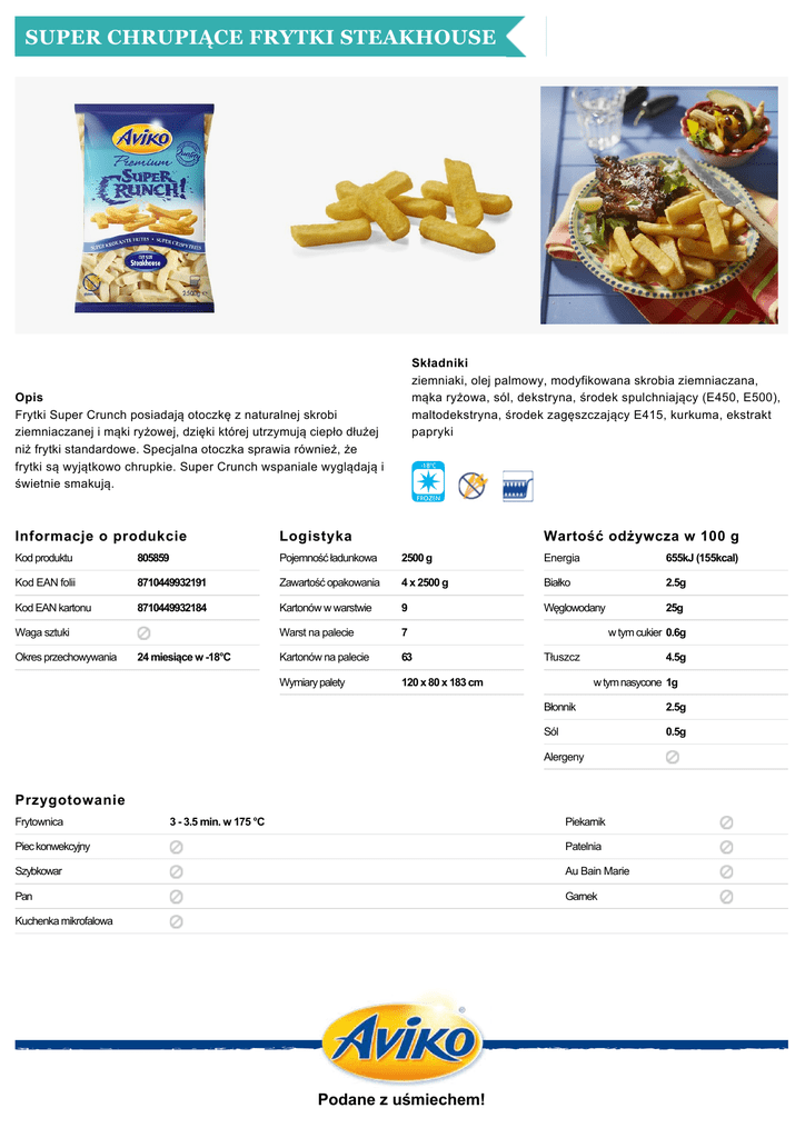 SUPER CHRUPIĄCE FRYTKI STEAKHOUSE Składniki ziemniaki, olej palmowy, modyfikowana skrobia ziemniaczana, mąka ryżowa, sól, dekstryna, środek spulchniający (E450, E500), maltodekstryna, środek zagęszczający E415, kurkuma, ekstrakt papryki Opis Frytki Super Crunch posiadają otoczkę z naturalnej skrobi ziemniaczanej i mąki ryżowej, dzięki której utrzymują ciepło dłużej niż frytki standardowe. Specjalna otoczka sprawia również, że frytki są wyjątkowo chrupkie. Super Crunch wspaniale wyglądają i świetnie smakują. Wartość odżywcza w 100 g Informacje o produkcie Logistyka Kod produktu 805859 Pojemność ładunkowa 2500 g Energia 655kJ (155kcal) Kod EAN folii 8710449932191 Zawartość opakowania 4 x 2500 g Białko 2.5g Kod EAN kartonu 8710449932184 Kartonów w warstwie 9 Węglowodany 25g Warst na palecie 7 Kartonów na palecie 63 Wymiary palety 120 x 80 x 183 cm Waga sztuki Okres przechowywania 24 miesiące w 18°C w tym cukier 0.6g Tłuszcz 4.5g w tym nasycone 1g Błonnik 2.5g Sól 0.5g Alergeny Przygotowanie Frytownica 3 3.5 min. w 175 °C Piekarnik Piec konwekcyjny Patelnia Szybkowar Au Bain Marie Pan Garnek Kuchenka mikrofalowa Podane z uśmiechem!