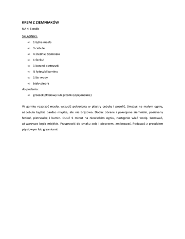KREM Z ZIEMNIAKÓW NA 4-6 osób SKŁADNIKI: • 1 łyżka masła • 3 cebule • 4 średnie ziemniaki • 1 fenkuł • 1 korzeń pietruszki • ½ łyżeczki kuminu • 1 litr wody • biały pieprz do podania: • groszek ptysiowy lub grzanki (opcjonalnie) W garnku rozgrzać masło, wrzucić pokrojoną w plastry cebulę i posolić. Smażyć na małym ogniu, aż cebula będzie bardzo miękka, ale nie brązowa. Dodać obrane i pokrojone ziemniaki, posiekany fenkuł, pietruszkę i kumin. Dusić 5 minut na niewielkim ogniu, następnie wlać wodę. Gotować, aż warzywa będą miękkie. Przyprawić do smaku solą i pieprzem, zmiksować. Podawać z groszkiem ptysiowym lub grzankami.