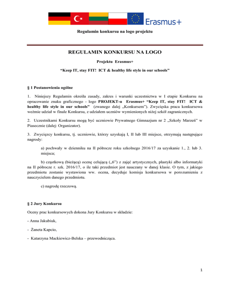 Regulamin konkursu na logo projektu REGULAMIN KONKURSU NA LOGO Projektu Erasmus+ “Keep IT, stay FIT! ICT & healthy life style in our schools” § 1 Postanowienia ogólne 1. Niniejszy Regulamin określa zasady, zakres i warunki uczestnictwa w I etapie Konkursu na opracowanie znaku graficznego - logo PROJEKT-u Erasmus+ “Keep IT, stay FIT! ICT & healthy life style in our schools” (zwanego dalej „Konkursem”). Zwycięska praca konkursowa weźmie udział w finale Konkursu, z udziałem uczniów wymienionych niżej szkół zagranicznych. 2. Uczestnikami Konkursu mogą być uczniowie Prywatnego Gimnazjum nr 2 „Szkoły Marzeń” w Piasecznie (dalej: Organizator). 3. Zwycięzcy konkursu, tj. uczniowie, którzy uzyskają I, II lub III miejsce, otrzymają następujące nagrody: a) pochwały w dzienniku na II półrocze roku szkolnego 2016/17 za uzyskanie 1., 2. lub 3. miejsca; b) cząstkową (bieżącą) ocenę celującą („6”) z zajęć artystycznych, plastyki albo informatyki na II półrocze r. szk. 2016/17, o ile taki przedmiot jest nauczany w danej klasie. O tym, z jakiego przedmiotu zostanie wystawiona ww. ocena, decyduje komisja konkursowa w porozumieniu z nauczycielem danego przedmiotu. c) nagrodę rzeczową. § 2 Jury Konkursu Oceny prac konkursowych dokona Jury Konkursu w składzie: - Anna Jakubiuk, - Żaneta Kapcio, - Katarzyna Mackiewicz-Belska – przewodnicząca. 1 Regulamin konkursu na logo projektu § 3 Terminarz Konkursu 1. Ogłoszenie Konkursu: do 9.01.2017 2. Ostateczny termin składania prac: 26.01.2017. Prace należy składać na ręce p. Katarzyny Mackiewicz-Belskiej lub w sekretariacie szkoły. 3. Ogłoszenie wyników: do 1.02.2017. § 4 Przedmiot konkursu 1. Przedmiotem Konkursu jest opracowanie projektu znaku graficznego - logo, mającego stać się oficjalnym elementem identyfikacji wizualnej Projektu Erasmus+ “Keep IT, stay FIT! ICT & healthy life style in our schools”. 2. Wybrane logo będzie służyć celom identyfikacyjnym, reprezentacyjnym, informacyjnym, korespondencyjnym. Zastosowanie projektu powinno umożliwiać różnorodne wykorzystanie: na plakatach i papierze firmowym, w wydawnictwach, materiałach promocyjnych, w materiałach elektronicznych, prezentacjach, grafice internetowej, w różnych formatach i rozmiarach. 3. Logo powinno odzwierciedlać nowoczesny i innowacyjny charakter projektu oraz jego ważną cechę współpracy międzynarodowej. 4. Znak powinien być zrozumiały zarówno dla Polaków, jak i obcokrajowców. 5. Opis projektu: Projekt "Keep IT, stay FIT! ICT & Helathy life style in our schools." powstał jako odpowiedź na potrzeby zdiagnozowane w szkołach partnerskich Niemiec, Litwy, Polski i Turcji. Z analiz potrzeb naszych szkół wynikło, że uczniowie mają problem z wykorzystaniem TIK na potrzeby edukacji, jednocześnie nad używają nowych technologii w celach rozrywkowych, w skrajnej postaci krzywdząc innych (cyberprzemoc). Znaczna część nauczycieli nie wykorzystuje w pełni możliwości, jakimi dysponuje dana szkoła w obszarze TIK oraz nie nadąża za postępem technologicznym. Nasi uczniowie prowadzą siedzący tryb życia, często niezdrowo się odżywiają. Skutkiem tego nieraz nie w pełni harmonijny rozwój psychosomatyczny młodego człowieka: nadwaga, niedotlenie wynikające z niechęci do spędzania czasu na świeżym powietrzu, bezproduktywne przebywanie w przestrzeni wirtualnej. Jednocześnie każdy partner ma know-how w interesujących nas obszarach dydaktyczno-wychowawczych, którego poszukują pozostali. I tak np. szkoła polska ma wiedzę w dziedzinie geocachingu ( rodzaj gry miejskiej z wykorzystaniem nawigacji w smartfonie). Litewscy partnerzy korzystają z tabletów na lekcjach, koledzy z Niemiec budują dynamiczne strony internetowe, świetnie organizują czas podczas przerw międzylekcyjnych dzięki tzw. uczniowskim asystentom sportowym. Szkoła turecka zaś od lat korzysta e-podręczników. Doszliśmy do wniosku, że dzięki wymianie dobrych praktyk powstanie efekt synergii oraz wypracowana zostanie europejska wartość dodana. Mamy dwa cele strategiczne: I. Pragniemy wyposażyć uczniów i nauczycieli w nowe kompetencje w dziedzinie TIK. II. Chcemy następnie wykorzystać atrakcyjne dla młodzieży nowoczesne technologie do kształtowania właściwych nawyków żywienio wych oraz przekonania uczniów do aktywnego spędzania czasu na świeżym powietrzu (geocaching) - ale bez zbędnych wyrzeczeń. Dzięki geocachingowi przekonamy uczniów, że można w atrakcyjny sposób, z wykorzystaniem smartfonów, uprawiać krajoznawstwo, a piesze wędrówki są świetnym i tanim sposobem na ruch i dotlenienie. Nauczymy przygotowywać zdrowe i smaczne potrawy. Swoje dokonania młodzież udokumentuje na vlogach. Zwieńczeniem projektu będzie lip dub do wspólnej piosenki. Nauczyciele podczas sesji wymiany dobrych praktyk oraz studiów przypadku poznają zalety i wady e-dziennika i tabletów, podzielą się doświadczeniem nt. praw autorskich w Internecie, poznają nowe sposoby wykorzystania TIK na potrzeby dydaktyczne. Kadra opanuje umiejętność przeprowadzania badań ankietowych za pośrednictwem narzędzi internetowych. 2 Regulamin konkursu na logo projektu Materialnymi rezultatami projektu będą Otwarte Zasoby Edukacyjne (OER): scenariusze lekcji z wykorzystaniem TIK (rozszerzenie podstaw programowych (PP) przedmiotów przyrodniczych, wf, historii, informatyki); vlog kulinarny oraz "Kalendarz z przepisami na zdrowe i smaczne pot rawy" (na lekcje techniki oraz godz. wychowawcze); miniporadnik oraz zbiór scenariuszy gier miejskich z wykorzystaniem geocachingu (rozszerzenie PP geografii oraz wf); Miniporadnik młodego filmowca; ezeszyty do przedmiotów przyrodniczych; "Vademecum posługiwania się smartfonami (do wykorzystania na godz. wychowawczych i do tworzenia szkolnych regulaminów). Będą one miały charakter uniwersalny dzięki temu, że nasze pomysły zostaną zweryfikowane i udoskonalone w 