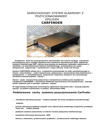 SAMOCHODOWY SYSTEM ALARMOWY Z POZYCJONAOWANIEM GPS/GSM CARFINDER Urządzenie służy do pozycjonowania samochodów lub innych środków transportu poruszających się w zasięgu działania sieci telefonów komórkowych GSM. Odbiornik systemu satelitarnego GPS oblicza swą pozycję na podstawie sygnałów odebranych z satelitów i za pośrednictwem telefonu komórkowego przekazuje je do części stacjonarnej , połączonej z komputerem i mapą cyfrową kraju lub Europy . System CARFINDER składa się z urządzenia przewoźnego na stałe zainstalowanego w Twoim samochodzie i części stacjonarnej połączonej z przewodową linią telefoniczną i komputerem, z zainstalowanym programem mapowym służącym do precyzyjnego określenia pozycji pojazdu (opcja ) Oprócz części stacjonarnej połączonej z komputerem możliwa jest współpraca urządzenia CARFINDER z dowolnym telefonem komórkowym lub stacjonarnym , którego numer zapisany jest w pamięci systemu (opcja) W najprostszej konfiguracji otrzymujemy zgłoszenia alarmowe lub/i pozycję pojazdu wprost na telefon komórkowy w postaci komunikatu SMS. Podstawowe cechy systemu pozycjonowania Carfinder – określanie aktualnej pozycji – miejsca postoju lub trasy przejazdu poszukiwanego pojazdu - pomiar aktualnej prędkości pojazdu oraz odtworzenie ostatniego fragmentu przebytej trasy lub miejsc postoju - podsłuch wnętrza samochodu w trakcie trwania połączenia telefonicznego - wysyłanie informacji alarmowych SMS - alarmy o włamaniu, przekroczeniu prędkości , przekroczeniu zadanego obszaru - zdalne wykonywanie określonych czynności np. unieruchomienie silnika lub włączenie dodatkowych urządzeń - współpraca z telefonem NOKIA 5110 ,3310 lub podobnymi - współpraca z dowolnym alarmem samochodowym lub możliwość podłączenia dodatkowych czujników np. stłuczenia szyby lub otwarcia drzwi , każdorazowo po aktywacji takiego alarmu telefon komórkowy zainstalowany w samochodzie wykonuje połączenie pod wpisany numer telefonu (komórkowego , lub stacjonarnego) – sterowanie funkcjami alarmowymi wprost z klawiatury telefonu , lub komunikatami SMS Ogólne zalecenia instalacyjne . Urządzenie montujemy w dowolnym , suchym , nienarażonym na działanie wysokich temperatur , oraz nadmiernych wibracji miejscu samochodu. Zalecane jest podłączanie do instalacji elektrycznej jak najbliżej zacisków akumulatora tak by wyeliminować nadmierne spadki napięcia na dodatkowych odbiornikach instalacji. Antenę GPS montujemy w zależności od jej typu i obudowy na zewnątrz lub pod przednią lub tylną szybą , w taki sposób by zapewnić jej możliwie najlepsze warunki odbioru . Telefon komórkowy mocujemy w miejscu zapewniającym możliwie najlepszy poziom sygnału chyba , że stosujemy zewnętrzną antenę GSM . Generalnie wszystkie elementy systemu muszą być zamocowane w sposób pewny , uniemożliwiający przemieszczanie w czasie jazdy , wyrwanie lub naprężenie przewodów , odpadnięcie anteny , zalanie lub przegrzanie np. w wyniku nagrzania od silnika ( montaż w komorze silnika jest niedozwolony). Pierwsza konfiguracja urządzenia Kupiony przez Państwa moduł jest skonfigurowany do wykonywania podstawowych fukcji , oraz ma wpisany na stałe numer telefonu pod , który ma wysyłać komunikaty alarmowe. Dodatkową konfigurację , lub zmiany umożliwia firmowe oprogramowanie PC-SET. Umożliwia ono dowolną edycje treści komunikatów alarmowych np. drzwi , okno, szyba itp. Ponadto możliwa jest modyfikacja profili alarmowych np. po zaaktywowaniu wejścia alarmowego 3 otrzymamy tekst: „ingerencja strefa22, pozycja czas” a po zaaktywowaniu wejścia 2 otrzymamy : „ wejście2 , czas , stan wyjść” Współpraca z samochodowym systemem alarmowym. Urządzenie posiada dostępne 4 cyfrowe wejścia alarmowe, 1 wyjście sterujące(opcjonalnie 4) , 2 wejścia analogowe 0- 5V do pomiarów dowolnych napięć lub odpowiednio przekształconych innych wielkości , temperatura , wilgotność , poziom paliwa , średnie lub chwilowe zużycie paliwa , przekroczenie ustalonej prędkości . Wejścia alarmowe dopuszczają doprowadzenie dodatnich , stałych napięć z zakresu 920V . System wykrywa wystąpienie i utrzymanie napięcia przez czas ok. 2s , powoduje to wysłanie pod zapisany w pamięci urządzenia numer telefonu , SMS-a o treści ALARM 1...4 w zależności od wejścia alarmu . Możliwe jest przypisanie ( na etapie programowania) dodatkowych komentarzy np. ALARM 3 = DRZWI itp. Obsługa wejść alarmowych możliwa jest jedynie po UZBROJENIU alarmu. Funkcję tą pełni wejście 4 , do którego należy podać statycznie napięcie na ok 2-3 s . Stan uzbrojenia sygnalizuje środkowa dioda : czerwony =UZBROJONY , zielony = NIEUZBROJONY , brak świecenia = brak komunikacji z telefonem , lub uszkodzony telefon. Dodatkowo każdy zanik napięcia zasilania ( odłączenie akumulatora lub jego rozładowanie) sygnalizowane jest SMS-em o treści : „ Zanik Us” . Współpraca z mapą cyfrową System umożliwia korzystanie z dowolnej mapy cyfrowej . Optymalny do współpracy jest Atlas Samochodowy Europy MICROSOFT AUTOROUTE , do którego można z klawiatury wprowadzić dane o pozycji odczytane bezpośrednio z SMSa telefonu . Dodatkowo oferujemy program ułatwiający tą operację .Przy częstym monitorowaniu większej liczby pojazdów zalecane jest korzystanie z firmowego programu współpracującego z w.w. mapą i telefonem NOKIA 5110 dołączonym do portu RS komputera . W tej konfiguracji wysyłanie i odbiór komunikatów SMS wykonywane jest automatycznie przez program , a obsługa ogranicza się do utworzenia bazy danych o pojazdach i okresowym lub automatycznym weryfikowaniu pozycji samochodów. Współpraca z telefonem komórkowym Urządzenie Carfinder przystosowane jest do współpracy z telefonem NOKIA 5110, Inne typy telefonów wymagają zmiany oprogramowania . Przed podłączeniem telefonu należy ustawić PIN karty na : 1111 , umożliwi to