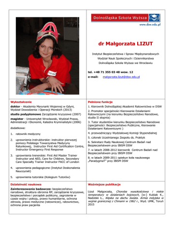 dr Małgorzata LIZUT Instytut Bezpieczeństwa i Spraw Międzynarodowych Wydział Nauk Społecznych i Dziennikarstwa Dolnośląska Szkoła Wyższa we Wrocławiu tel. +48 71 355 03 48 wew. 12 e-mail: [email protected] Wykształcenie Pełnione funkcje doktor - Akademia Marynarki Wojennej w Gdyni, Wydział Dowodzenia i Operacji Morskich (2013) 1. Kierownik Dolnośląskiej Akademii Ratownictwa w DSW studia podyplomowe Zarządzanie kryzysowe (2007) magister - Uniwersytet Wrocławski, Wydział Prawa, Administracji i Ekonomii, Katedra Kryminalistyki (2006) 2. Promotor specjalności Kierowanie Działaniami Ratowniczymi (na kierunku Bezpieczeństwo Narodowe, studia II stopnia) dodatkowe: 3. Tutor studentów kierunku Bezpieczeństwo Narodowe (specjalności: Bezpieczeństwo Publiczne, Kierowanie Działaniami Ratowniczymi ) 1. ratownik medyczny 4. przewodniczący Wydziałowej Komisji Stypendialnej 2. uprawnienia instruktorskie: instruktor pierwszej pomocy Polskiego Towarzystwa Medycyny Ratunkowej, Instructor First Aid Certification Centre, Instructor Emergency First Response 3. uprawnienia trenerskie: First Aid Master Trainer Instructor and AED, Care for Children, Secondary Care Specialty Trainer Instructor FACC of London 5. członek Uczelnianego Zespołu ds. Praktyk 6. Sekretarz Rady Naukowej Centrum Badań nad Bezpieczeństwem przy IBiSM DSW 7. w latach 2008-2012 kierownik Centrum Badań nad Bezpieczeństwem przy IBiSM DSW 8. w latach 2009-2011 opiekun koła naukowego „ParadygmaT” przy IBiSM DSW 4. uprawnienia pedagogiczne (Instytut Doskonalenia Nauczycieli) 5. uprawnienia tutorskie (Kolegium Tutorów) Działalność naukowa Zainteresowania badawcze: bezpieczeństwo narodowe, struktura obronna RP, zarządzanie kryzysowe, bezpieczeństwo i porządek publiczny, zagrożenia w czasie wojny i pokoju, prawo humanitarne, ochrona zdrowia, prawo medyczne (ratownicze), ratownictwo, ochrona praw pacjenta Ważniejsze publikacje Małgorzata, Choroba wysokościowa i niskie temperatury w działaniach bojowych, [w:] Kubiak K., Nadolski Ł., Klęska na dachu świata. Armia indyjska w wojnie granicznej z Chinami w 1962 r. , Wyd. UMK, Toruń Lizut 2015 Działalność dydaktyczna w DSW Lizut Małgorzata, Pokonać klątwę „Białej Ciszy”. Rozwój 1. Bezpieczeństwo publiczne w stanach nadzwyczajnych Międzynarodowego 2012/2013, Wyd. DSW, Wrocław 2013 2. Instytucje zarządzania kryzysowego 3. Medycyna a sport 4. Organizacja akcji ratowniczych w wypadkach i katastrofach współpracy służb ratowniczych państw regionu Arktyki po II wojnie światowej, [w:] Rocznik Bezpieczeństwa Lizut M., Nauczanie o bezpieczeństwie – wyzwanie dla nowoczesnej edukacji, 109 Annales Universitatis Padagogicae Cracoviensis, Studia de Securitate et Educatione Civili II, Wyd. Naukowe UP, Kraków 2012 6. Prawne aspekty zapewniania bezpieczeństwa Lizut M., Medyczne aspekty działań kontrterrorystycznych na jednostkach pływających, Rocznik Bezpieczeństwa Morskiego, rok IV, wyd. AMW, Gdynia 2011 7. Prawne podstawy ochrony zdrowia Dyderska M., Lizut M., Współpraca z mediami w 5. Pierwsza pomoc w nagłych wypadkach 8. Prawo obronne RP 9. Ratownictwo medyczne sytuacjach kryzysowych na przykładzie pożaru w Kamieniu Pomorskim 13 kwietnia 2009 r., Rocznik 10. Ratownictwo drogowe Bezpieczeństwa Międzynarodowego 2010/2011 , Wyd. DSW, Wrocław 2011 11. Ratownictwo i ochrona ludności Lizut M., Lizut J., Perspektywy i kierunki rozwoju 12. System ratownictwa medycznego 13. Systemy ratownicze w Polsce 14. Zdrowie i bezpieczeństwo publiczne 15. Zarządzanie bezpieczeństwem w sytuacji kryzysowej 16. Zarządzanie kryzysowe 17. Zarządzanie systemami ratowniczymi Lotniczego Pogotowia Ratunkowego na Dolnym Śląsku w świetle doświadczeń ostatniego 10-lecia, Otwarte niebo nad Dolnym Śląskiem. 5 lat wykorzystanej szansy, Wyd. DSW, Wrocław, 2011 Lizut M., Pomiędzy nożem a ścianą, „Komandos” Militarny Magazyn Specjalny nr 3/2010 Lizut M., Pierwszy opatrunek, „Komandos” Militarny Magazyn Specjalny nr 10/2009 Lizut M., Wojna nie da drugiej szansy – taktyczna opieka nad poszkodowanym w warunkach bojowych, „Komandos” Militarny Magazyn Specjalny nr 10/2009