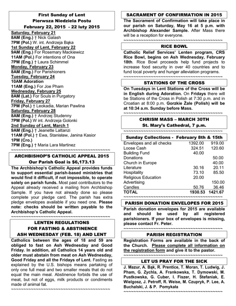 First Sunday of Lent Pierwsza Niedziela Postu February 22, 2015 - 22 luty 2015 Saturday, February 21 8AM (Eng.) † Nick Galash 7PM (Pol.) W. int. Andrzeja Bąka 1st Sunday of Lent, February 22 9AM (Eng.) For Rosemary Mackiewicz 11AM (Pol.) For intentions of Ona 7PM (Eng.) † Laura Schimmel Monday, February 23 8AM (Eng.) For Parishioners Tuesday, February 24 10AM Adoration 11AM (Eng.) For Joe Pham Wednesday, February 25 8AM (Lat.) For Souls in Purgatory Friday, February 27 7PM (Pol.) † Leokadia, Marian Pawlina Saturday, February 28 8AM (Eng.) † Andrzej Studenny 7PM (Pol.) W int. Andrzeja Golonki 2nd Sunday of Lent, March 1 9AM (Eng.) † Jeanette Lattanzi 11AM (Pol.) † Ewa, Stanisław, Janina Kasior 1PM (Cro.) 7PM (Eng.) † Maria Lara Martinez ~~~~~~~~~~~~~~~~~~~~~~~~~~~~~~~~~~~~~~~~ ARCHBISHOP’S CATHOLIC APPEAL 2015 Our Parish Goal is $6,173.13 The Archbishop’s Catholic Appeal provides funds to support essential parish-based ministries that would find it difficult, if not impossible, to operate solely on parish funds. Most past contributors to the Appeal already received a mailing from Archbishop Sample. If you have not already done so please complete your pledge card. The parish has extra pledge envelopes available if you need one. Please note: checks should be written payable to the Archbishop’s Catholic Appeal. ~~~~~~~~~~~~~~~~~~~~~~~~~~~~~~~~~~~~~~~~ LENTEN REGULATIONS FOR FASTING & ABSTINENCE ASH WEDNESDAY (FEB. 18) AND LENT Catholics between the ages of 18 and 59 are obliged to fast on Ash Wednesday and Good Friday. In addition, all Catholics 14 years old and older must abstain from meat on Ash Wednesday, Good Friday and all the Fridays of Lent. Fasting as explained by the U.S. bishops means partaking of only one full meal and two smaller meals that do not equal the main meal. Abstinence forbids the use of meat, but not of eggs, milk products or condiments made of animal fat. ~~~~~~~~~~~~~~~~~~~~~~~~~~~~~~~~~~~~~~~~ SACRAMENT OF CONFIRMATION IN 2015 The Sacrament of Confirmation will take place in our parish on Saturday, May 16 at 5 p.m. with Archbishop Alexander Sample. After Mass there will be a reception for everyone. ~~~~~~~~~~~~~~~~~~~~~~~~~~~~~~~~~~~~~~~~ RICE BOWL Catholic Relief Services’ Lenten program, CRS Rice Bowl, begins on Ash Wednesday, February 18th. Rice Bowl proceeds help fund projects to increase food security in over 40 countries and to fund local poverty and hunger alleviation programs. ~~~~~~~~~~~~~~~~~~~~~~~~~~~~~~~~~~~~~~~~ STATIONS OF THE CROSS On Tuesdays in Lent Stations of the Cross will be in English during Adoration. On Fridays there will be Stations of the Cross in Polish at 7:30 p.m. and in Croatian at 8:00 p.m. Gorzkie Żale (Polish) will be at 10:34 a.m. Sunday before Mass. ~~~~~~~~~~~~~~~~~~~~~~~~~~~~~~~~~~~~~~~~ CHRISM MASS – MARCH 30TH St. Mary’s Cathedral, 7 p.m. ~~~~~~~~~~~~~~~~~~~~~~~~~~~~~~~~~~~~~~~~ Sunday Collections - February 8th & 15th Envelopes and all checks 1392.00 919.00 Loose Cash 324.51 120.60 Building Fund 40.00 Donations 50.00 Church in Europe 40.00 Literature 30.16 20.11 Hospitality 73.10 85.50 Religious Education 20.00 Advertising 150.00 Candles 50.76 36.46 TOTAL 1930.53 1421.67 ~~~~~~~~~~~~~~~~~~~~~~~~~~~~~~~~~~~~~~~~ PARISH DONATION ENVELOPES FOR 2015 Parish donation envelopes for 2015 are available and should be used by all registered parishioners. If your box of envelopes is missing, please contact Fr. Peter. ~~~~~~~~~~~~~~~~~~~~~~~~~~~~~~~~~~~~~~~~ PARISH REGISTRATION Registration Forms are available in the back of the Church. Please complete all information on the registration form and give it to the pastor. ~~~~~~~~~~~~~~~~~~~~~~~~~~~~~~~~~~~~~~~~ LET US PRAY FOR THE SICK J. Mazur, A. Bąk, R. Prentice, T. Moran, T. Ludwig, J. Pham, G. Zychla, A. Frankowska, T. Dymowski, M. Pustkowska, G. Cuber, I. Fiszer, H. Stefaniak, E. Wielgosz, J. Petroff, R. Weise, M. Czupryk, P. Lee, A. Buchalski, J. & P. Pomykała ~~~~~~~~~~~~~~~~~~~~~~~~~~~~~~~~~~~~~~~~ ARCHBISHOP’S CATHOLIC APPEAL 2015 Parafialne zobowiązanie $6,173.13 Przez cały luty i marzec będziemy starali się wywiązać z naszego zobowiązania na Archbishop’s Appeal. Donacje lub zobowiązania prosimy skadać na niedzielne tace. Z tyłu kościoła są wystawione koperty dla tych, którzy nie otrzymali ich pocztą. Popierajmy Archbishop’s Catholic Appeal, który wspomaga wszystkie dzieła misyjne w naszej diecezji. Prosimy czeki wypisywać na Archidiecezję. ~~~~~~~~~~~~~~~~~~~~~~~~~~~~~~~~~~~~~~~ WIELKI POST - DNI POKUTY Kan. 1250 – W Kościele Powszechnym dniami i okresami pokutnymi są poszczególne piątki całego roku i czas Wielkiego Postu. Wstrzemięźliwość od pokarmów mięsnych obowiązuje we wszystkie piątki Wielkiego Postu, w Środę Popielcową i w Wielki Piątek. Post oznacza trzy posiłki w ciągu dnia – dwa lekkie i jeden do syta. Post obowiązuje wszystkich od 18 do 59 roku życia i obowiązuje w Środę Popielcową i Wielki Piątek. ~~~~~~~~~~~~~~~~~~~~~~~~~~~~~~~~~~~~~~~~ NABOŻEŃSTWA WIELKOPOSTNE Drogi Krzyżowe w każdy piątek o godz. 19:30 po polsku i o 20:00 po chorwacku. Gorzkie Żale w każdą niedzielę przed mszą o godz. 10:35. ~~~~~~~~~~~~~~~~~~~~~~~~~~~~~~~~~~~~~~~~ RICE BOWLS – Wielkopostna Pomoc dla Catholic Relief Services Rice Bowl wspomaga najbardziej potrzebujących w ponad 40 krajach świata. Prosimy aby wszystkie dzieci z katechezy wzięły skarbonki, które znajdują się z tyłu kościoła. Zwracamy je z naszymi ofiarami po Wielkanocy. ~~~~~~~~~~~~~~~~~~~~~~~~~~~~~~~~~~~~~~~~ CAŁODNIOWA ADORACJA – 3 marca W Pierwszy Piątek Miesiąca – CAŁODNIOWA ADORACJA - od 8:30 do 18:50. Msze św. o godz. 8:00 (ang.), 19:00 (pol.). Wpisujemy się na listę. ~~~~~~~~~~~~~~~~~~~~~~~~~~~~~~~~~~~~~~~ WIELKOPOSTNE REKOLEKCJE PARAFIALNE – 20 - 23 marca poprowadzi Ks. Kazimierz Długosz T.Chr. duszpasterz z Brazylii ~~~~~~~~~~~~~~~~~~~~~~~~~~~~~~~~~~~~~~~ MSZA ŚWIĘTA POŚWIĘCENIA OLEJÓW W Wielki Ponie