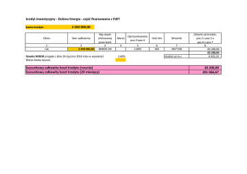 kredyt inwestycyjny - Zielona Energia - część finansowana z EWT 3 200 000,00 kwota kredytu Okres 1 rok Stan zadłużenia 2 3 200 000,00 Wg stawki oferowanej przez bank 3 WIBOR 1M Stawka WIBOR przyjęta z dnia 24 stycznia 2014 roku w wysokości Marża banku wynosi Szacunkowy całkowity koszt kredytu (rocznie) Szacunkowy całkowity koszt kredytu (29 miesięcy) Marża 4 2,60% Oprocentowanie poz.3+poz.4 Ilość dni Mnożnik 5 2,60% 6 365 7 365*100 średnia za m-c Odsetki od kredytu poz.2 x poz.5 x poz.6 x poz.7 8 83 200,00 83 200,00 6 933,33 83 200,00 201 066,67 kredyt krótkoterminowy (19 miesięcy) - WEIiT - wkład własny kwota kredytu lp 300 000,00 Okres 1 2 1 2 3 4 5 6 7 8 2014-03-01 do 2014-12-31 2015-01-01 do 2015-03-31 2015-04-01 do 2015-04-30 2015-05-01 do 2015-05-31 2015-06-01 do 2015-06-30 2015-07-01 do 2015-07-31 2015-08-01 do 2015-08-31 2015-09-01 do 2015-09-30 Wg stawki Oprocentowanie Stan zadłuŜenia oferowanej MarŜa (w %) Ilość dni przez bank poz.4+poz.5 3 300 000,00 300 000,00 300 000,00 250 000,00 200 000,00 150 000,00 100 000,00 50 000,00 4 WIBOR1M WIBOR1M WIBOR1M WIBOR1M WIBOR1M WIBOR1M WIBOR1M WIBOR1M Stawka WIBOR przyjęta z dnia 24 stycznia 2014 roku w wysokości MarŜa banku wynosi Spłata kredytu w pięciu ratach Szacunkowy całkowity koszt kredytu (19 miesięcy) 5 MnoŜnik Odsetki od kredytu poz.4 x poz.6 x poz.7 /365 Spłata 9 10 6 7 8 2,60% 2,60% 2,60% 2,60% 2,60% 2,60% 2,60% 2,60% 306 90 31 28 31 30 31 30 365*100 365*100 365*100 365*100 365*100 365*100 365*100 365*100 6 539,18 1 923,29 662,47 498,63 441,64 320,55 220,82 106,85 10 713,42 2,60% 10 713,42 0,00 0,00 50 000,00 50 000,00 50 000,00 50 000,00 50 000,00 50 000,00 Stan zadłuŜenia 11 300 000,00 300 000,00 250 000,00 200 000,00 150 000,00 100 000,00 50 000,00 0,00