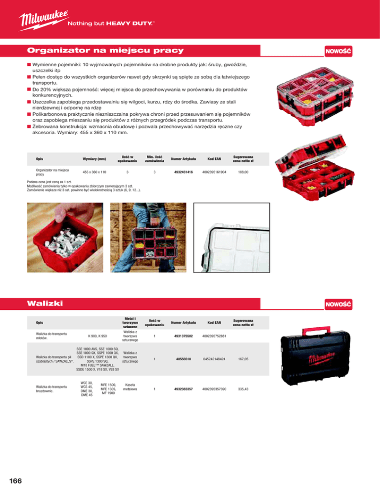 Organizator na miejscu pracy NOWOŚĆ ■ Wymienne pojemniki: 10 wyjmowanych pojemników na drobne produkty jak: śruby, gwoździe, uszczelki itp ■ Pełen dostęp do wszystkich organizerów nawet gdy skrzynki są spięte ze sobą dla łatwiejszego transportu. ■ Do 20% większa pojemność: więcej miejsca do przechowywania w porównaniu do produktów konkurencyjnych. ■ Uszczelka zapobiega przedostawainiu się wilgoci, kurzu, rdzy do środka. Zawiasy ze stali nierdzewnej i odpornę na rdzę ■ Polikarbonowa praktycznie niezniszczalna pokrywa chroni przed przesuwaniem się pojemników oraz zapobiega mieszaniu się produktów z różnych przegródek podczas transportu. ■ Żebrowana konstrukcja: wzmacnia obudowę i pozwala przechowywać narzędzia ręczne czy akcesoria. Wymiary: 455 x 360 x 110 mm. Opis Wymiary (mm) Ilość w opakowaniu Min. ilość zamówienia Numer Artykułu Kod EAN Sugerowana cena netto zł Organizator na miejscu pracy 455 x 360 x 110 3 3 4932451416 4002395161904 188,00 Podana cena jest ceną za 1 szt. Możliwość zamówienia tylko w opakowaniu zbiorczym zawierającym 3 szt. Zamówienie większe niż 3 szt. powinno być wielokrotnością 3 sztuk (6, 9, 12...). Walizki NOWOŚĆ Numer Artykułu Kod EAN 1 4931375502 4002395752881 SSE 1000 AVS, SSE 1000 SQ, SSE 1000 QX, SSPE 1000 QX, Walizka z Walizka do transportu pił SSD 1100 X, SSPE 1300 QX, tworzywa szablastych / SAWZALLS®. sztucznego SSPE 1300 SQ, M18 FUEL™ SAWZALL, SSDE 1500 X, V18 SX, V28 SX 1 48556510 045242148424 167,05 WCE 30, WCS 45, DME 30, DME 45 1 4932383357 4002395357390 335,43 Walizka do transportu młotów. Walizka do transportu bruzdownic. 166 Metal i tworzywo sztuczne Walizka z tworzywa sztucznego Ilość w opakowaniu Opis K 900, K 950 MFE 1500, MFE 1305, MF 1900 Kaseta metalowa Sugerowana cena netto zł milwaukeetool.pl Walizki Heavy Duty NOWOŚĆ ■ Walizki dostarczane z zamkami i pianką. Walizka HD Wymiary (mm) Ilość w opakowaniu Min. ilość zamówienia Numer Artykułu Kod EAN Sugerowana cena netto zł Walizki dostarczane z zamkami i pianką. 1 475 x 358 x 132 1 1 4932453385 4002395146376 125,00 2 475 x 358 x 192 1 1 4932449767 4002395146383 175,00 3 475 x 358 x 195 1 1 4932453386 4002395143634 175,00 Osprzęt do walizki Heavy Duty 1 1 4932451545 4002395146581 175,00 Zapasowe zatrzaski. 2 1 4932373252 4002395347247 17,23 Wkładki do walizki Heavy Duty NOWOŚĆ Ilość w opakowaniu Min. ilość zamówienia Numer Artykułu Kod EAN Sugerowana cena netto zł 1 1 1 4932440936 4002395147588 33,00 2 1 1 4932449686 4002395147595 52,00 3 1 1 4932453379 4002395148202 33,00 4 1 1 4932456391 4002395148219 52,00 Wkładka do walizki HD 5 1 1 4932456392 4002395148226 52,00 6 1 1 4932456393 4002395148233 52,00 7 1 1 4932456394 4002395148240 52,00 8 1 1 4932453508 4002395146390 33,00 9 1 1 4932453507 4002395143603 33,00 10 1 1 4932453509 4002395143610 33,00 11 1 1 4932453510 4002395143627 33,00 Akcesoria do wkładki 1 1 4932451546 4002395146598 42,00 Walizka HD Wkładka do walizki HD M18 CDD-202X 1 1 M18 CDD-502X 1 1 M18 CPD-202X 1 1 M18 CPD-502X 1 1 M18 CIW12-502X 1 1 M18 CID-202X 1 1 M18 CID-502X 1 1 M18 CAG125XPDB-502X 2 2 M18 CAG115XPDB-502X 2 2 M18 FDD-202X 1 3 M18 FDD-502X 1 3 M18 FPD-202X 1 3 M18 FPD-502X 1 3 M18 FTPD-502X 1 3 M18 FTDD-502X 1 3 M18 CCS55-502X 2 4 M18 CSX-502X 2 5 M18 CHPX-502X 2 6 M18 CHX-502X 2 7 M18 CHIWF12-502X 1 8 M18 CHIWF34-502X 1 8 M18 CAG-115 X-502X 1 9 M18 CAG-125 X-502X 1 9 M18 CAG-125 XPD-502X 1 9 M18 CHIWP12-502X 1 8 M18 CRAD-502X 1 10 M18 FIWF12-502X 1 11 M18 FID-502X 1 11 M18 FTID-502X 1 11 M18 FTIWP12-502X 1 11 M18 FTIWF12-502X 1 11 167 Torba dla elektryków Mocna konstrukcja: wykonana z nylonu balistycznego 1680D ■ Wytrzymała i gruba. Z podwójnymi, nitowanymi szwami ■ Zintegrowany uchwyt: umożliwia łatwy transport. Zapewnia łatwy montaż w miejscu pracy ■ Mocna podstawa: umożliwia postawienie torby, nawet całkowicie załadowanej ■ Zintegrowane szlufki: umożliwiają noszenie torby na pasie narzędziowym ■ Centralnie zamontowane pierścienie w kształcie litery D: umożliwiają równe zawieszenie na pasku na ramię ■ Metalowa klamerka na taśmę mierniczą: bezpieczne miejsce na taśmę zapewniające łatwy dostęp ■ Opis Torba dla elektryków Ilość w opakowaniu Min. ilość zamówienia Numer Artykułu Kod EAN Sugerowana cena netto zł 1 1 48228100 045242333929 164,24 Małe torby z zamkiem błyskawicznym - 3 szt. Wzmocnione torby z zamkiem błyskawicznym aby wytrzymywały trudne warunki w miejscu pracy, 2x bardziej wytrzymałe niż konkurencyjne torby. ■ Wykonane ze wzmocnionego brezentu; oddychające i trwałe ■ Ucho parciane: umożliwia spinanie torebek ze sobą lub przypięcie ich do torby ■ Opis Małe torby z zamkiem błyskawicznym - 3 szt. 168 Ilość w opakowaniu Min. ilość zamówienia Numer Artykułu Kod EAN Sugerowana cena netto zł 3 1 48228193 045242344611 99,00 milwaukeetool.pl Pas dla elektryków Mocna konstrukcja: wykonany z nylonu balistycznego 1680D ■ Wytrzymały i gruby, z podwójnymi, nitowanymi szwami ■ Zintegrowane uchwyty: umożliwiają łatwy transport torby ■ Wyściełany, przepuszczający powietrze pas: bardzo wygodny i solidnie wykonany ■ Metalowe zaczepy na szelki: umożliwiają przypięcie szelek ■ Metalowa klamerka na taśmę mierniczą: bezpieczne miejsce na taśmę zapewniające łatwy dostęp ■ Opis Ilość w opakowaniu Min. ilość zamówienia Numer Artykułu Kod EAN Sugerowana cena netto zł 1 1 48228110 045242333936 324,48 Pas dla elektryków Uprząż budowlana Mocna konstrukcja: wykonana z nylonu balistycznego 1680D Z podwójnymi, nitowanymi szwami ■ Wyściełana 4-punktowa uprząż: rozkłada ciężar dla zapewnienia wygody ■ Wyściełany, przepuszczający powietrze pas: bardzo wygodny i solidnie wykonany ■ Zintegrowany uchwyt umożliwia łatwy transport, zapewnia łatwy montaż w miejscu pracy ■ Metalowe zaczepy na szelki: umożliwiają przypięcie szelek ■ ■ Opis Uprząż b