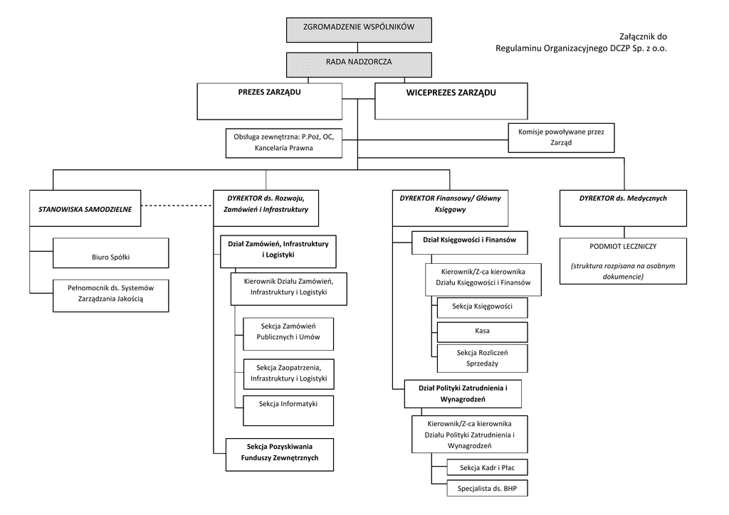 ZGROMADZENIE WSPÓLNIKÓW Załącznik do Regulaminu Organizacyjnego DCZP Sp. z o.o. RADA NADZORCZA PREZES ZARZĄDU WICEPREZES ZARZĄDU Komisje powoływane przez Zarząd Obsługa zewnętrzna: P.Poż, OC, Kancelaria Prawna STANOWISKA SAMODZIELNE Biuro Spółki Pełnomocnik ds. Systemów Zarządzania Jakością DYREKTOR ds. Rozwoju, Zamówień i Infrastruktury Dział Zamówień, Infrastruktury i Logistyki Kierownik Działu Zamówień, Infrastruktury i Logistyki DYREKTOR Finansowy/ Główny Księgowy Dział Księgowości i Finansów Kierownik/Z-ca kierownika Działu Księgowości i Finansów Sekcja Księgowości Sekcja Zamówień Publicznych i Umów Sekcja Zaopatrzenia, Infrastruktury i Logistyki Sekcja Informatyki Sekcja Pozyskiwania Funduszy Zewnętrznych Kasa Sekcja Rozliczeń Sprzedaży Dział Polityki Zatrudnienia i Wynagrodzeń Kierownik/Z-ca kierownika Działu Polityki Zatrudnienia i Wynagrodzeń Sekcja Kadr i Płac Specjalista ds. BHP DYREKTOR ds. Medycznych PODMIOT LECZNICZY (struktura rozpisana na osobnym dokumencie)