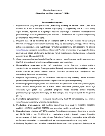 Regulamin programu „Wypróbuj markizę za darmo” 2014 r. §1 Postanowienia ogólne. 1. Organizatorem programu pod nazwą „Wypróbuj markizę za darmo” 2014 r. jest firma FAKRO Sp z o.o. z siedzibą w Nowym Sączu przy ul. Węgierskiej 144 a, 33-300 Nowy Sącz, Polska, wpisana do Krajowego Rejestru Sądowego – Rejestru Przedsiębiorców prowadzonego przez Sąd Rejonowy dla Krakowa – Śródmieście XII Wydział Gospodarczy pod numerem KRS 0000110248. 2. Program trwa od 28 kwietnia do 31 sierpnia 2014 r. W tym okresie naleŜy zakupić Produkt promocyjny w dowolnym rozmiarze (liczy się data zakupu), w ciągu 30 dni od daty zakupu zarejestrować się wypełniając Formularz Zgłoszeniowy zamieszczony na stronie www.fakro.pl, następnie zamontować i testować Produkt promocyjny, a w przypadku braku zadowolenia z jego uŜytkowania zwrócić po min. 2 miesiącach od daty zakupu, jednak nie później niŜ do 31 grudnia 2014r. 3. Celem programu jest zachęcenie klientów do zakupu i wypróbowania markiz zewnętrznych FAKRO, jako optymalnej ochrony poddaszy przed nagrzewaniem. 4. Uczestnikiem programu moŜe być pełnoletnia osoba fizyczna, mająca miejsce zamieszkania na terytorium Rzeczypospolitej Polskiej, zwana dalej Uczestnikiem, która w czasie trwania programu dokona zakupu Produktu promocyjnego, zarejestruje się, wypełniając formularz zgłoszeniowy. 5. Program organizowany jest na terytorium Rzeczypospolitej Polskiej. Zwrot Produktu promocyjnego odbywa się wyłącznie na terytorium Rzeczypospolitej Polskiej. 6. Uczestnik programu w przypadku niezadowolenia z uŜytkowania Produktów promocyjnych, moŜe zwrócić maksymalnie ich 5 sztuk. Zwrot Produktów promocyjnych moŜe być dokonany tylko jeden raz. Uczestnik programu moŜe dokonać zwrotu Produktu promocyjnego po upływie 2 miesięcy od daty zakupu, lecz nie później niŜ do 31 grudnia 2014r. 7. Formularz zgłoszeniowy – formularz rejestracyjny FAKRO zamieszczony na stronie: www.fakro.pl, wypełniany w formie elektronicznej. 8. Produktem promocyjnym jest markiza zewnętrzna typu: AMZ tj. AMZ089, AMZ090, AMZ091, AMZ 092, AMZ093, AMZ094 oraz wszystkie markizy z serii New Line. 9. Dowód zakupu – faktura VAT 23% za zakup Produktu promocyjnego, dokonany w okresie od 28.04.2014 r. do 31.08.2014 r., zawierający między innymi: nazwę Produktu promocyjnego, ich ilości oraz datę zakupu. Zakupione Produkty promocyjne, które widnieją na fakturze zakupu bez przypisanej ilości, nie zostaną uwzględnione w programie. 10. Niniejszy Regulamin oraz wszelkie materiały informacyjne dotyczące promocji dostępne są w siedzibie Organizatora, u Doradców Technicznych FAKRO na terenie całego kraju oraz na stronie internetowej www.fakro.pl. §2 Prawo i ograniczenia nabywcy do zwrotu zakupionego towaru. 1. Organizator programu zapewnia dobrą jakość oferowanych Produktów promocyjnych oraz prawo nabywcy do ich zwrotu, jeŜeli walory uŜytkowe nie są z jakichkolwiek powodów satysfakcjonujące dla Uczestnika programu, z zastrzeŜeniem dalszych postanowień Regulaminu. 2. Uprawnienia Uczestnika programu określone w punkcie 1 nie dotyczą zwrotu Produktów promocyjnych, co do których poziom satysfakcji z ich uŜytkowania został obniŜony ze względu na ich uszkodzenia oraz niesprawność po dokonaniu ich zakupu a wynikłe z: 1) przypadków losowych (uszkodzenie mechaniczne, podwyŜszona temperatura itp.), 2) uŜytkowania w sposób niezgodny z instrukcją obsługi, 3) napraw wykonanych przez osoby nieuprawnione, 4) montaŜu wykonanego w nieprawidłowy sposób. §3 Zasady programu. 1. Aby wziąć udział w programie naleŜy dokonać zakupu min. 1 szt. markizy zewnętrznej FAKRO typu: AMZ tj. AMZ089, AMZ090, AMZ091, AMZ 092, AMZ093, AMZ094 i/lub markizy New Line w dowolnym rozmiarze. 2. Zakupu moŜna dokonać w dowolnym punkcie handlowym na terenie Polski na ogólnych zasadach rynkowych lub w sklepie internetowym FAKRO. 3. Uczestnik programu przy dokonaniu zakupu otrzymuje fakturę VAT, którą musi zachować jako dowód zakupu upowaŜniający do zwrotu towaru. 4. W ciągu 30 dni od daty dokonania zakupu naleŜy zarejestrować się na stronie internetowej www.fakro.pl – zakładka „Wypróbuj Markizę za darmo 2014 r.” 5. Po 2 miesiącach od dnia dokonania zakupu, lecz nie póŜniej niŜ do 31 grudnia 2014r. klient moŜe zwrócić maksymalnie 5 sztuk Produktu promocyjnego do punktu handlowego, w którym je zakupił przedstawiając dowód zakupu wraz z formularzem zgłoszeniowym. 6. Formularz zgłoszeniowy musi być wypełniony w sposób kompletny i zgodnie z prawdą, a dane adresowe na fakturze muszą odpowiadać danym zamieszczonym w formularzu, w przeciwnym wypadku Organizator zastrzega sobie prawo nieuwzględnienia zgłoszenia i prawo do nie przyjęcia zwrotu Produktu promocyjnego. 7. Produkty promocyjne, które Uczestnik Programu chce zwrócić, powinny być kompletne, nieuszkodzone i w oryginalnym opakowaniu. Zwrot Produktów promocyjnych do punktu handlowego, moŜe być dokonany jednokrotnie. 8. Sprzedawca sprawdza towar określając jego stan, następnie po pozytywnej weryfikacji zwraca klientowi kwotę zakupu Produktu promocyjnego, wystawiając fakturę korygującą do faktury VAT. 9. W przypadku, gdy sprzedawca z przyczyn technicznych nie zaakceptuje zwrotu Produktu promocyjnego, klient moŜe kierować pisemną reklamację na adres firmy FAKRO, która zostanie rozpatrzona zgodnie z zapisem §7 pkt 1. 10. Zwrot Produktu promocyjnego dokonany przez klienta po terminie 31 grudnia 2014r., nie będzie przyjmowany. §4 Warunki uczestnictwa. 1. W czasie trwania programu naleŜy dokonać jednokrotnego zakupu Produktów promocyjnych FAKRO, jeden raz zarejestrować się, a co za tym idzie tylko jeden raz dokonać zwrotu Produktu promocyjnego. 2. Aby przystąpić do programu Uczestnik musi: 1. dokonać zakupu Produktu promocyjnego FAKRO w czasie trwania programu, 2. zarejestrować się na stronie internetowej FAKRO na www.fakr