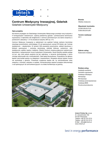 Branża Centrum Medycyny Inwazyjnej, Gdańsk Gdański Uniwersytet Medyczny Obiekty medyczne Wysokość kontraktu 22.600.000,00 PLN Opis projektu Na terenie przyległym do Gdańskiego Uniwersytetu Medycznego powstaje nowy budynek o 5 kondygnacjach nadziemnych, częścią podziemną (garaże i pomieszczenia techniczne) wyposażony w lądowisko dla śmigłowców z centrum pianotwórczym (na dachu budynku) o powierzchni zabudowy 1,13 ha (kubatura budynku 264 tys. m3). Centrum Medycyny Inwazyjnej w założeniach ma spełniać funkcje zarówno lecznictwa otwartego (przychodnie), zamkniętego (15 sal operacyjnych, ponad 270 łóżek), jak i funkcje dydaktyczne – akademickie. W ramach CMI powstanie przychodnia, oddział ratunkowy z blokiem operacyjnym i centralną sterylizacją, oddziały łóżkowe, audytorium, sale dydaktyczne, apteka, kaplica i kafeteria. Obiekty Centrum zostaną połączone nadziemnymi łącznikami z wytypowanymi innymi budynkami Uniwersytetu. Nowa filozofia szpitala polega na tym, aby czas pobytu pacjenta był jak najkrótszy, a leczenie dochodzącego z domu chorego dokonywało się w ambulatoriach. Sale będą dwuosobowe. Przeszklony hol główny będzie miał kształt pasażu ze sklepikami i kawiarenkami. Wszędzie dotrzeć będzie można nie wychodząc z gmachu. Przestrzeń urządzona będzie tak, by zminimalizować stres związany z chorobą i pobytem w szpitalu. Komputeryzacja zapewni przepływ dokumentacji z sal operacyjnych do sal konferencyjnych i na wideo konferencje za granicą. 5.650.000,00 EUR Termin realizacji 2011 Zakres usług Wykonanie instalacji Rodzaj usług Instalacje sanitarne Centralne ogrzewanie Instalacja chłodząca Wentylacja Klimatyzacja Instalacja przeciwpożarowa Instalacja BMS Poczta pneumatyczna Imtech Polska Sp. z o.o. Al. Jerozolimskie 162 02-342 Warszawa Telefon: +48 22 210 3710 Telefax: +48 22 210 3713 E-Mail: [email protected] www.imtech.pl