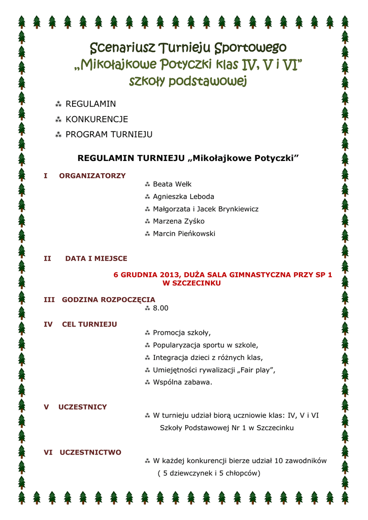 Scenariusz Turnieju Sportowego „Mikołajkowe Potyczki klas IV, V i VI” szkoły podstawowej REGULAMIN KONKURENCJE PROGRAM TURNIEJU REGULAMIN TURNIEJU „Mikołajkowe Potyczki” I ORGANIZATORZY Beata Wełk Agnieszka Leboda Małgorzata i Jacek Brynkiewicz Marzena Zyśko Marcin Pieńkowski II DATA I MIEJSCE 6 GRUDNIA 2013, DUŻA SALA GIMNASTYCZNA PRZY SP 1 W SZCZECINKU III GODZINA ROZPOCZĘCIA 8.00 IV CEL TURNIEJU Promocja szkoły, Popularyzacja sportu w szkole, Integracja dzieci z różnych klas, Umiejętności rywalizacji „Fair play”, Wspólna zabawa. V UCZESTNICY W turnieju udział biorą uczniowie klas: IV, V i VI Szkoły Podstawowej Nr 1 w Szczecinku VI UCZESTNICTWO W każdej konkurencji bierze udział 10 zawodników ( 5 dziewczynek i 5 chłopców) Turniej jest formą rywalizacji klas IV, V i VI VII PRZYBORY piłki do kosza, nogi, siatki i ręcznej bombki z plastiku woreczki hula- hop rakietki do tenisa stołowego kije do unihokeja pałeczki sztafetowe szarfy ringa płotki składane słupki koce maxi – rollery czapki mikołajkowe nagłośnienie VIII NAGRODY pamiątkowe dyplomy dla każdej klasy i słodki upominek PROGRAM TURNIEJU – KONKURENCJE KLASA IV Sadzenie bombek w kółka ringo. Bieg z bombką umieszczoną na pałeczce sztafetowej. Nakładanie czapek Mikołaja na pachołki i zbieranie. Bieg z bombką umieszczoną na rakietce do tenisa stołowego. Wyścig pomocników świętego Mikołaja ( przenoszenie worka z prezentami ). Rzut bombką do celu. KLASA V Slalom – prowadzenie bombki kijem do unihokeja. Skoki z piłką do kosza – piłka trzymana między nogami. Bieg z woreczkiem na głowie. Rzut do kosza zbiegu ( rzut do kosza musi być celny ) Rzut woreczkami do celu . Bieg – trzymanie woreczka kijami od unihokeja. KLASA VI Wyścig reniferów – bieg na czworakach w slalomie. Prowadzenie piłki nogą w slalomie zakończone celnym strzałem na bramkę. Bieg w parach z piłką umieszczoną między głowami. W parach – wyścig śnieżnych zaprzęgów. Kozłowanie piłki w slalomie zakończone celnym rzutem do kosza z biegu. Zamiana śnieżnych kul. Wyścig maxi – rollerów świętego Mikołaja. PROGRAM MINUTOWY TURNIEJU „Mikołajkowe Potyczki klas IV, V i VI” 8.00 – 9.30 – MIKOŁAJKOWE POTYCZKI KLAS V 10.00 – 11.30 – MIKOŁAJKOWE POTYCZKI KLAS VI 12.00 – 13.30 – MIKOŁAJKOWE POTYCZKI KLAS IV Każda część rozpoczyna się uroczystym przywitaniem przez Świętego Mikołaja Mikołaj i Śnieżynki omawiają każdą kolejną konkurencję, a Elfy wykonują pokaz. Na zakończenie każdego bloku Mikołaj i Śnieżynki wręczają dyplomy i słodkie upominki. Uroczyste zakończenie imprezy. Podziękowanie dla wszystkich uczestników.