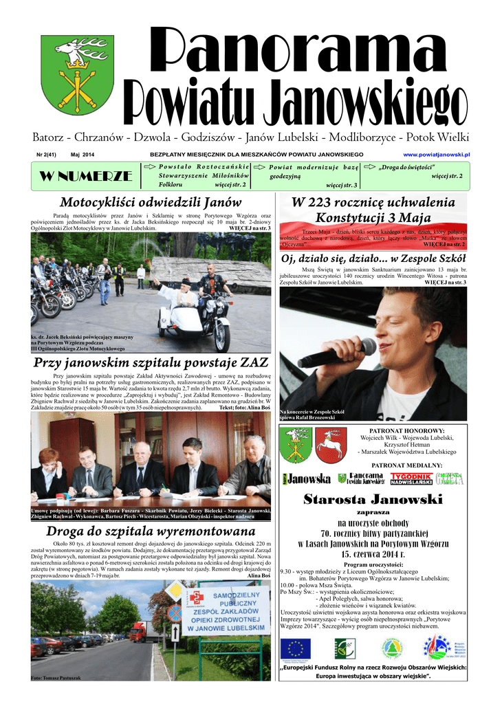 Panorama Powiatu Janowskiego Batorz - Chrzanów - Dzwola - Godziszów - Janów Lubelski - Modliborzyce - Potok Wielki Nr 2(41) Maj 2014 W NUMERZE BEZPŁATNY MIESIĘCZNIK DLA MIESZKAŃCÓW POWIATU JANOWSKIEGO Powstało Roztoczańskie Stowarzyszenie Miłośników Folkloru więcej str. 2 Powiat modernizuje bazę geodezyjną więcej str. 3 Motocykliści odwiedzili Janów Paradą motocyklistów przez Janów i Szklarnię w stronę Porytowego Wzgórza oraz poświęceniem jednośladów przez ks. dr Jacka Beksińskiego rozpoczął się 10 maja br. 2-dniowy Ogólnopolski Zlot Motocyklowy w Janowie Lubelskim. WIĘCEJ na str. 3 www.powiatjanowski.pl „Droga do świętości” więcej str. 2 W 223 rocznicę uchwalenia Konstytucji 3 Maja Trzeci Maja - dzień, bliski sercu każdego z nas, dzień, który połączył wolność duchową z narodową, dzień, który łączy słowo „Matka” ze słowem „Ojczyzna”... WIĘCEJ na str. 2 Oj, działo się, działo... w Zespole Szkół Mszą Świętą w janowskim Sanktuarium zainicjowano 13 maja br. jubileuszowe uroczystości 140 rocznicy urodzin Wincentego Witosa - patrona Zespołu Szkół w Janowie Lubelskim. WIĘCEJ na str. 3 ks. dr. Jacek Beksiński poświęcający maszyny na Porytowym Wzgórzu podczas III Ogólnopolskiego Zlotu Motocyklowego Przy janowskim szpitalu powstaje ZAZ Przy janowskim szpitalu powstaje Zakład Aktywności Zawodowej - umowę na rozbudowę budynku po byłej pralni na potrzeby usług gastronomicznych, realizowanych przez ZAZ, podpisano w janowskim Starostwie 15 maja br. Wartość zadania to kwota rzędu 2,7 mln zł brutto. Wykonawcą zadania, które będzie realizowane w procedurze „Zaprojektuj i wybuduj”, jest Zakład Remontowo - Budowlany Zbigniew Rachwał z siedzibą w Janowie Lubelskim. Zakończenie zadania zaplanowano na grudzień br. W Zakładzie znajdzie pracę około 50 osób (w tym 35 osób niepełnosprawnych). Tekst; foto: Alina Boś Na koncercie w Zespole Szkół śpiewa Rafał Brzozowski PATRONAT HONOROWY: Wojciech Wilk - Wojewoda Lubelski, Krzysztof Hetman - Marszałek Województwa Lubelskiego PATRONAT MEDIALNY: Starosta Janowski Umowę podpisują (od lewej): Barbara Fuszara - Skarbnik Powiatu, Jerzy Bielecki - Starosta Janowski, Zbigniew Rachwał - Wykonawca, Bartosz Piech - Wicestarosta, Marian Olszyński - inspektor nadzoru Droga do szpitala wyremontowana Około 80 tys. zł kosztował remont drogi dojazdowej do janowskiego szpitala. Odcinek 220 m został wyremontowany ze środków powiatu. Dodajmy, że dokumentację przetargową przygotował Zarząd Dróg Powiatowych, natomiast za postępowanie przetargowe odpowiedzialny był janowski szpital. Nowa nawierzchnia asfaltowa o ponad 6-metrowej szerokości została położona na odcinku od drogi krajowej do zakrętu (w stronę pogotowia). W ramach zadania zostały wykonane też zjazdy. Remont drogi dojazdowej przeprowadzono w dniach 7-19 maja br. Alina Boś zaprasza na uroczyste obchody 70. rocznicy bitwy partyzanckiej w Lasach Janowskich na Porytowym Wzgórzu 15. czerwca 2014 r. Program uroczystości: 9.30 - występ młodzieży z Liceum Ogólnokształcącego im. Bohaterów Porytowego Wzgórza w Janowie Lubelskim; 10.00 - polowa Msza Święta. Po Mszy Św.: - wystąpienia okolicznościowe; - Apel Poległych, salwa honorowa; - złożenie wieńców i wiązanek kwiatów. Uroczystość uświetni wojskowa asysta honorowa oraz orkiestra wojskowa Imprezy towarzyszące - wyścig osób niepełnosprawnych „Porytowe Wzgórze 2014". Szczegółowy program uroczystości niebawem. ,,Europejski Fundusz Rolny na rzecz Rozwoju Obszarów Wiejskich: Foto: Tomasz Pastuszak Europa inwestująca w obszary wiejskie”. Panorama Powiatu Janowskiego W 223 rocznicę uchwalenia Konstytucji 3 Maja Cd. ze str. 1 Przy akompaniamencie Olek Orkiestry w Janowie Lubelskim obchodzono 223 rocznicę podpisania Konstytucji 3 Maja. W uroczystości, zorganizowanej przez Urząd Miasta, wzięli udział przedstawiciele samorządów, instytucji, służb mundurowych, środowisk kombatanckich, jak również mieszkańcy Janowa i okolic. Patriotyczne uroczystości rozpoczęły się uroczystą Mszą Św. w intencji Ojczyzny w janowskim Sanktuarium, podczas której o Konstytucji 3 Maja i o przykazaniu miłości do Ojczyzny mówił ks. dr Jacek Staszak. Tego dnia, w święto narodowe i maryjne, odnowiono Jasnogórskie Śluby Narodu, modląc się za Ojczyznę i o pokój na świecie. Druga część uroczystości, połączona z występem artystycznym młodzieży szkolnej z Janowa i Białej, odbyła się przed pomnikiem Tadeusza Kościuszki w Parku Miejskim. Dodajmy, że obchody święta narodowego stały się też okazją do zbierania pieniędzy przez Janowskie Stowarzyszenie Regionalne na rzecz ratowania zabytkowych nagrobków janowskiego cmentarza. Foto - galeria: http://powiatjanowski.pl/podglad_newsa_n_3105.html Podziękowanie Janowskie Stowarzyszenie Regionalne zawiadamia, że w dniu 3 maja br. - podczas uroczystości obchodów 223 rocznicy uchwalenia Konstytucji 3 Maja, przeprowadzono podobnie jak w minionym roku, zbiórkę pieniędzy na renowacje starych grobów. Dzięki hojności ofiarodawców, zebrano 1105 zł, za co serdecznie dziękujemy. Pieniądze zostaną przeznaczone na realizację projektu, współfinansowanego przez Urząd Marszałkowski Województwa Lubelskiego, którego celem jest renowacja 6 zabytkowych nagrobków janowskiego cmentarza. Grzegorz Krzysztoń - Janowskie Stowarzyszenie Regionalne Droga do świętości Jana Pawła II - tak było w Łążku Dnia 27 kwietnia 2014 r.w Kaplicy pod wezwaniem Najświętszego Serca Jezusowego, zgromadzeni na niedzielnej eucharystii obejrzeli program artystyczny. W występie brały udział dzieci z klas „0”-VI, gimnazjaliści i licealistki z Łążku. Z wielkim przejęciem i radością przedstawiły zebranym postać Karola Wojtyły od narodzin do dnia kanonizacji. W programie zabrzmiały pieśni i piosenki religijne: „Sutanna”, „Wiele jest serc”, 