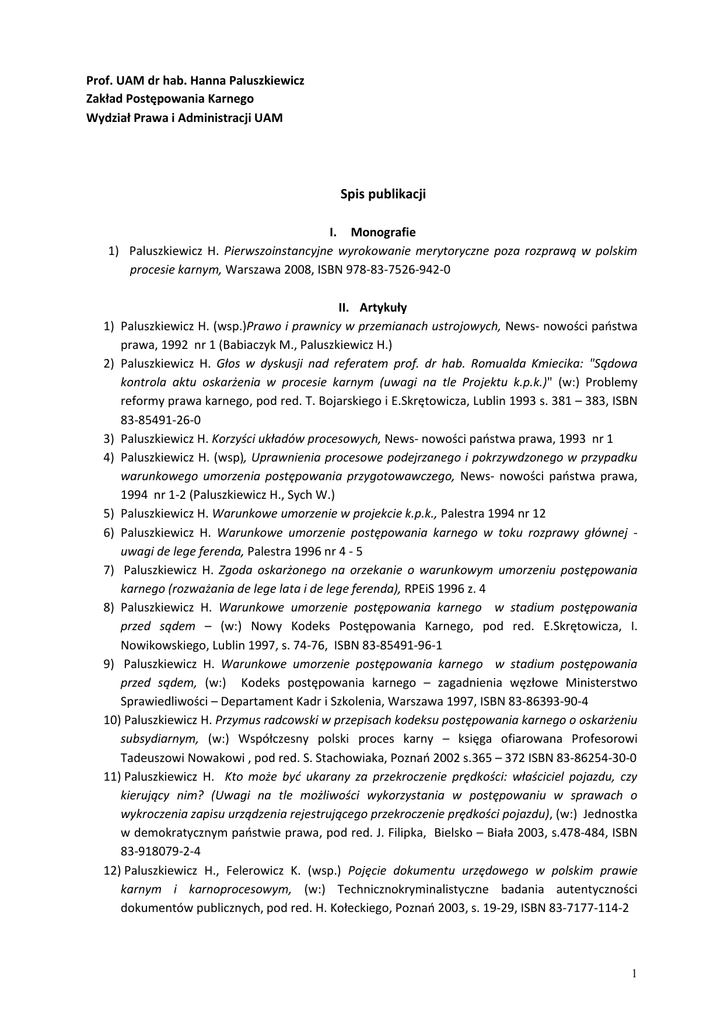 Prof. UAM dr hab. Hanna Paluszkiewicz Zakład Postępowania Karnego Wydział Prawa i Administracji UAM Spis publikacji I. Monografie 1) Paluszkiewicz H. Pierwszoinstancyjne wyrokowanie merytoryczne poza rozprawą w polskim procesie karnym, Warszawa 2008, ISBN 978-83-7526-942-0 II. Artykuły 1) Paluszkiewicz H. (wsp.)Prawo i prawnicy w przemianach ustrojowych, News- nowości państwa prawa, 1992 nr 1 (Babiaczyk M., Paluszkiewicz H.) 2) Paluszkiewicz H. Głos w dyskusji nad referatem prof. dr hab. Romualda Kmiecika: "Sądowa kontrola aktu oskarżenia w procesie karnym (uwagi na tle Projektu k.p.k.)" (w:) Problemy reformy prawa karnego, pod red. T. Bojarskiego i E.Skrętowicza, Lublin 1993 s. 381 – 383, ISBN 83-85491-26-0 3) Paluszkiewicz H. Korzyści układów procesowych, News- nowości państwa prawa, 1993 nr 1 4) Paluszkiewicz H. (wsp), Uprawnienia procesowe podejrzanego i pokrzywdzonego w przypadku warunkowego umorzenia postępowania przygotowawczego, News- nowości państwa prawa, 1994 nr 1-2 (Paluszkiewicz H., Sych W.) 5) Paluszkiewicz H. Warunkowe umorzenie w projekcie k.p.k., Palestra 1994 nr 12 6) Paluszkiewicz H. Warunkowe umorzenie postępowania karnego w toku rozprawy głównej uwagi de lege ferenda, Palestra 1996 nr 4 - 5 7) Paluszkiewicz H. Zgoda oskarżonego na orzekanie o warunkowym umorzeniu postępowania karnego (rozważania de lege lata i de lege ferenda), RPEiS 1996 z. 4 8) Paluszkiewicz H. Warunkowe umorzenie postępowania karnego w stadium postępowania przed sądem – (w:) Nowy Kodeks Postępowania Karnego, pod red. E.Skrętowicza, I. Nowikowskiego, Lublin 1997, s. 74-76, ISBN 83-85491-96-1 9) Paluszkiewicz H. Warunkowe umorzenie postępowania karnego w stadium postępowania przed sądem, (w:) Kodeks postępowania karnego – zagadnienia węzłowe Ministerstwo Sprawiedliwości – Departament Kadr i Szkolenia, Warszawa 1997, ISBN 83-86393-90-4 10) Paluszkiewicz H. Przymus radcowski w przepisach kodeksu postępowania karnego o oskarżeniu subsydiarnym, (w:) Współczesny polski proces karny – księga ofiarowana Profesorowi Tadeuszowi Nowakowi , pod red. S. Stachowiaka, Poznań 2002 s.365 – 372 ISBN 83-86254-30-0 11) Paluszkiewicz H. Kto może być ukarany za przekroczenie prędkości: właściciel pojazdu, czy kierujący nim? (Uwagi na tle możliwości wykorzystania w postępowaniu w sprawach o wykroczenia zapisu urządzenia rejestrującego przekroczenie prędkości pojazdu), (w:) Jednostka w demokratycznym państwie prawa, pod red. J. Filipka, Bielsko – Biała 2003, s.478-484, ISBN 83-918079-2-4 12) Paluszkiewicz H., Felerowicz K. (wsp.) Pojęcie dokumentu urzędowego w polskim prawie karnym i karnoprocesowym, (w:) Technicznokryminalistyczne badania autentyczności dokumentów publicznych, pod red. H. Kołeckiego, Poznań 2003, s. 19-29, ISBN 83-7177-114-2 1 13) Paluszkiewicz H. Wyrokowanie poza rozprawą w przepisach kodeksu postępowania karnego (w:) Prawo wobec wyzwań współczesności, pod red. B.Guzika, O. Krajniak, P.Wilińskiego Poznań 2004 s. 302-311, ISBN 83-86254-95-5 14) Paluszkiewicz H. Realizacja zasady jawności przy orzekaniu o warunkowym umorzeniu postępowania karnego w toku posiedzenia sądu, Prokuratura i Prawo z. 9 z 2004, s.90-99, ISSN 1233-2577 15) Paluszkiewicz H. Wyrokowanie poza rozprawą w świetle zasady kontradyktoryjności procesu karnego. Palestra z. 1-2 2004, s.74-83 16) Paluszkiewicz H.(wsp.), Instytucje służące skróceniu postępowania w sądzie pierwszej instancji po nowelizacji k.p.k., Problemy znowelizowanej procedury karnej, pod red. Z.Sobolewskiego, G.Artymiak, Cz.P. Kłaka, Zakamycze 2004, s. 29-49 ISBN 83-7333-442-4 (Paluszkiewicz H., Stachowiak S,. Trzcińska A.) 17) Paluszkiewicz H. Zasada bezpośredniości a wyrokowania poza rozprawą w świetle kodeksu postępowania karnego, (w:) Nauka wobec współczesnych zagadnień prawa karnego w Polsce, Księga pamiątkowa ofiarowana Profesorowi Aleksandrowi Tobisowi, pod red. B.Janiszewskiego, Poznań 2004 s. 175-187, ISBN 83-7177-212-2 18) Paluszkiewicz H. Prawo podmiotów nie będących stroną do wnoszenia środków odwoławczych od orzeczeń wydanych przez sąd karny pierwszej instancji, (w:) Prawo wobec wyzwań współczesności, pod red. P.Wilińskiego, Poznań 2005 s. 215-225, ISBN 83-86402-96-2 19) Paluszkiewicz H. Ochrona praw pokrzywdzonego w fazie przygotowania do rozprawy głównej, (w:) Europejskie standardy ochrony praw człowieka a ustawodawstwo polskie, pod red. E.Dynia, Cz.P.Kłak, Rzeszów 2005, s. 263-275 ISBN 83-89473-38-0 20) Paluszkiewicz H., (wsp.) Europejskie wątki ostatnich nowelizacji polskiego kodeksu postępowania karnego, (w:) Prawo wobec wyzwań współczesności, pod red. P.Wilińskiego, Poznań 2006 s.305-319, ISBN 83-921889-5-0 (Paluszkiewicz H., Janusz B.) 21) Paluszkiewicz H. Posiedzenia „wyrokowe” sądu karnego I instancji w świetle niektórych zasad procesu karnego, Prokuratura i Prawo 2006, z. 10 s. 5-18, ISSN 1233-2577 22) Paluszkiewicz H., (wsp.) Rozwiązania konsensualne wprowadzone do polskiego procesu karnego a wykrycie prawdy, (w:) Zasada prawdy materialnej, pod red. Z.Sobolewskiego, G.Artymiak, Zakamycze 2006, s. 91-111 ISBN 83-7444-305-7 (Paluszkiewicz H., Stachowiak S.) 23) Paluszkiewicz H. W sprawie jednolitego modelu procedowania na posiedzeniach sądów karnych pierwszej instancji, Czasopismo Prawa Karnego i Nauk Penalnych 2006, z. 2 s. 199-217, ISSN 1506-1817 24) Paluszkiewicz H. Kilka uwag o wyrokowaniu poza rozprawą, standardzie rzetelnego procesu i realizacji prawa do wysłuchania w toku posiedzenia wyrokowego sądu karnego pierwszej instancji, (w:) Kryminalistyka i nauki penalne wobec przestępczości. Księga Pamiątkowa dedykowana Profesorowi Mirosławowi Owocowi, pod red. H. Kołeckiego, Poznań 2008, s. 7387, ISBN 978-83-7177-523-9 25) Paluszkiewicz H. Refleksje na temat perspektyw rozwoju karnoprocesowej regulacji warunkowego umorzenia postępowania karnego (w:) Reforma prawa karnego. Propozycje i komenta