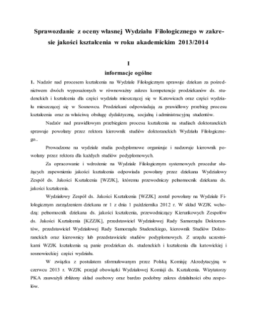 Sprawozdanie z oceny własnej Wydziału Filologicznego w zakresie jakości kształcenia w roku akademickim 2013/2014 I informacje ogólne 1. Nadzór nad procesem kształcenia na Wydziale Filologicznym sprawuje dziekan za pośrednictwem dwóch wyposażonych w równoważny zakres kompetencje prodziekanów ds. studenckich i kształcenia dla części wydziału mieszczącej się w Katowicach oraz części wydziału mieszczącej się w Sosnowcu. Prodziekani odpowiadają za prawidłowy przebieg procesu kształcenia oraz za właściwą obsługę dydaktyczną, socjalną i administracyjną studentów. Nadzór nad prawidłowym przebiegiem procesu kształcenia na studiach doktoranckich sprawuje powołany przez rektora kierownik studiów doktoranckich Wydziału Filologicznego.. Prowadzone na wydziale studia podyplomowe organizuje i nadzoruje kierownik powołany przez rektora dla każdych studiów podyplomowych. Za opracowanie i wdrożenie na Wydziale Filologicznym systemowych procedur służących zapewnieniu jakości kształcenia odpowiada powołany przez dziekana Wydziałowy Zespół ds. Jakości Kształcenia [WZJK], któremu przewodniczy pełnomocnik dziekana ds. jakości kształcenia. Wydziałowy Zespół ds. Jakości Kształcenia [WZJK] został powołany na Wydziale Filologicznym zarządzeniem dziekana nr 1 z dnia 1 października 2012 r. W skład WZJK wchodzą: pełnomocnik dziekana ds. jakości kształcenia, przewodniczący Kierunkowych Zespołów ds. Jakości Kształcenia [KZZJK], przedstawiciel Wydziałowej Rady Samorządu Doktorantów, przedstawiciel Wydziałowej Rady Samorządu Studenckiego, kierownik Studiów Doktoranckich oraz kierownicy lub przedstawiciele studiów podyplomowych. Z urzędu uczestnikami WZJK kształcenia są panie prodziekan ds. studenckich i kształcenia dla katowickiej i sosnowieckiej części wydziału. W związku z postulatem sformułowanym przez Polską Komisję Akredytacyjną w czerwcu 2013 r. WZJK przejął obowiązki Wydziałowej Komisji ds. Kształcenia. Wizytatorzy PKA zauważyli zbliżony skład osobowy oraz bardzo podobny zakres działalności obu zespołów. Posiedzenia WZJK mają charakter otwarty i może brać w nich udział każda osoba związana z wydziałem (bez prawa udziału w głosowaniach). Szczegółowe zasady określa uchwalony 11 grudnia 2012 r.: Regulamin obrad Wydziałowego Zespołu ds. Jakości Kształcenia na Wydziale Filologicznym Uniwersytetu Śląskiego. W roku akademickim 2013/2014 skład WZJK wyglądał następująco: dr hab. M. Tramer – pełnomocnik dziekana ds. jakości kształcenia; przewodniczący dr hab. Tomasz Sapota – kierownik Studiów Doktoranckich prof. UŚ dr hab. Krzysztof Uniłowski (INoLP) – przewodniczący KZZJK – kierunek filologia polska prof. UŚ dr hab. Aldona Skudrzyk – prodziekan ds. studenckich i kształcenia (część katowicka) / Kierownik Podyplomowych Studiów Kwalifikacyjnych Filologii Polskiej dr hab. Monika Bielińska — prodziekan ds. studenckich i kształcenia (część sosnowiecka) mgr Monika Wycykał – sekretarz WZJK prof. UŚ dr hab. Romuald Cudak — kierunek międzynarodowe studia polskie / kierownik KMSP dr Agnieszka Łakomy (IBiIN) – przewodnicząca KZZJK – kierunek bibliotekoznawstwo i informacja naukowa / kierownik Podyplomowych Studiów Bibliotekoznawstwo i Infor- macja Naukowa prof. UŚ dr hab. Andrzej Charciarek (IFW) – przewodniczący KZZJK – kierunek filologia / przedstawiciel Podyplomowych Studiów Obcy Język Biznesu dr Aneta Chmiel (IJRiT) – zastępca przewodniczącego KZZJK (IJRiT) – kierunek filologia dr Izabela Mroczek (IFS) – przewodnicząca KZZJK – kierunek filologia słowiańska, prof. dr hab. Maria Wysocka (IJA) – przewodnicząca KZZJK – kierunek filologia angielska / przedstawiciel Podyplomowych Studiów Tłumaczy Języka Angielskiego, dr hab. Małgorzata Nitka (IKiLA) — przewodnicząca KZZJK – kierunek filologia angielska dr hab. Anna Kucz (KFK) — przewodnicząca KZZJK – kierunek filologia klasyczna dr Aleksandra Dębska-Kossakowska (INoKSI) — Przewodnicząca KZZJK – kierunek kulturoznawstwo dr Anna Maj (INoKSI) — przewodnicząca KZZJK — kierunek kultury mediów dr Katarzyna Sujkowska-Sobisz (IJP) — przewodnicząca KZZJK – kierunek komunikacja promocyjna i kryzysowa dr Wacław Miodek (IFG) — przewodniczący KZZJK – kierunek filologia germańska prof. dr hab. Jadwiga Stawnicka – kierownik Podyplomowych Studiów Negocjacji Kryzysowych dr Halina Juszczyk – Kierownik Podyplomowych Studiów Retoryki i Kreowania Wizerunku dla Prawników dr Olga Przybyla – kierownik Podyplomowych Studiów Logopedii z Glottodydaktyką reprezentant Wydziałowej Rady Samorządu Studentów – lic. Małgorzata Więzik, reprezentant Wydziałowej Rady Samorządu Doktorantów – mgr Kamila Czaja. 2. Jednym z podstawowych zadań wewnętrznego systemu zapewniania jakości kształcenia oraz wydziałowego zespołu jest praca nad przejrzystością przyjętych dla poszczególnych działań i dostosowanych do specyfiki poszczególnych kierunków zasad, rozwiązań i procedur, to znaczy: wszelkie działanie mające na celu scalenie nadrzędnych i wewnętrznych przepisów w spójny i kompleksowy system. Za przygotowanie i dostosowanie Kierunkowego Systemu Jakości Kształcenia [KSJK] odpowiadają zespoły kierunkowe powołane przez dziekana spośród pracowników naukowo-dydaktycznych lub dydaktycznych oraz przedstawicieli doktorantów i studentów. 3. Do realizacji poszczególnych działań możliwe jest powołanie wyposażonych w odpowiednie uprawnienia i kompetencje zespołów pomocniczych (dotyczy to szczególnie przypadków zespołów oceniających lub zespołów, które w trakcie prac muszą skorzystać z materiałów zawierających dane osobowe lub dane wrażliwe). W roku akademickim 2013/2014 kierunkowe zespoły nie zgłosiły potrzeby powoływania zespołów pomocniczych. 4. Skład oraz struktura WZJK i KZZJK podlega stałej modyfikacji. Przyczyną j