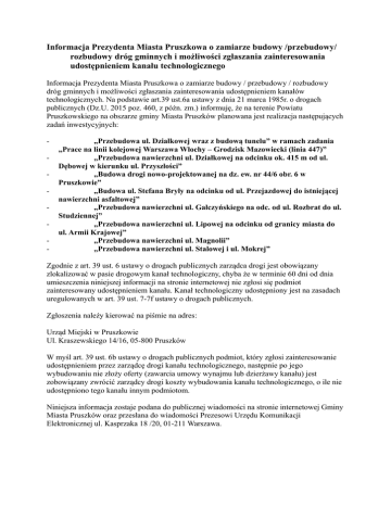 Informacja Prezydenta Miasta Pruszkowa o zamiarze budowy /przebudowy/ rozbudowy dróg gminnych i możliwości zgłaszania zainteresowania udostępnieniem kanału technologicznego Informacja Prezydenta Miasta Pruszkowa o zamiarze budowy / przebudowy / rozbudowy dróg gminnych i możliwości zgłaszania zainteresowania udostępnieniem kanałów technologicznych. Na podstawie art.39 ust.6a ustawy z dnia 21 marca 1985r. o drogach publicznych (Dz.U. 2015 poz. 460, z późn. zm.) informuję, że na terenie Powiatu Pruszkowskiego na obszarze gminy Miasta Pruszków planowana jest realizacja następujących zadań inwestycyjnych: - „Przebudowa ul. Działkowej wraz z budową tunelu” w ramach zadania „Prace na linii kolejowej Warszawa Włochy – Grodzisk Mazowiecki (linia 447)” „Przebudowa nawierzchni ul. Działkowej na odcinku ok. 415 m od ul. Dębowej w kierunku ul. Przyszłości” „Budowa drogi nowo-projektowanej na dz. ew. nr 44/6 obr. 6 w Pruszkowie” „Budowa ul. Stefana Bryły na odcinku od ul. Przejazdowej do istniejącej nawierzchni asfaltowej” „Przebudowa nawierzchni ul. Gałczyńskiego na odc. od ul. Rozbrat do ul. Studziennej” „Przebudowa nawierzchni ul. Lipowej na odcinku od granicy miasta do ul. Armii Krajowej” „Przebudowa nawierzchni ul. Magnolii” „Przebudowa nawierzchni ul. Stalowej i ul. Mokrej” Zgodnie z art. 39 ust. 6 ustawy o drogach publicznych zarządca drogi jest obowiązany zlokalizować w pasie drogowym kanał technologiczny, chyba że w terminie 60 dni od dnia umieszczenia niniejszej informacji na stronie internetowej nie zgłosi się podmiot zainteresowany udostępnieniem kanału. Kanał technologiczny udostępniony jest na zasadach uregulowanych w art. 39 ust. 7-7f ustawy o drogach publicznych. Zgłoszenia należy kierować na piśmie na adres: Urząd Miejski w Pruszkowie Ul. Kraszewskiego 14/16, 05-800 Pruszków W myśl art. 39 ust. 6b ustawy o drogach publicznych podmiot, który zgłosi zainteresowanie udostępnieniem przez zarządcę drogi kanału technologicznego, następnie po jego wybudowaniu nie złoży oferty (zawarcia umowy wynajmu lub dzierżawy kanału) jest zobowiązany zwrócić zarządcy drogi koszty wybudowania kanału technologicznego, o ile nie udostępniono tego kanału innym podmiotom. Niniejsza informacja zostaje podana do publicznej wiadomości na stronie internetowej Gminy Miasta Pruszków oraz przesłana do wiadomości Prezesowi Urzędu Komunikacji Elektronicznej ul. Kasprzaka 18 /20, 01-211 Warszawa.