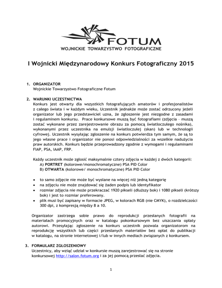 I Wojnicki Międzynarodowy Konkurs Fotograficzny 2015 1. ORGANIZATOR Wojnickie Towarzystwo Fotograficzne Fotum 2. WARUNKI UCZESTNICTWA Konkurs jest otwarty dla wszystkich fotografujących amatorów i profesjonalistów z całego świata i w każdym wieku, Uczestnik jednakże może zostać odrzucony jeżeli organizator lub jego przedstawiciel uzna, że zgłoszenie jest niezgodne z zasadami i regulaminem konkursu. Prace konkursowe muszą być fotografiami (zdjęcia – muszą zostać wykonane przez zarejestrowanie obrazu za pomocą światłoczułego nośnika), wykonanymi przez uczestnika na emulsji światłoczułej (skan) lub w technologii cyfrowej. Uczestnik wysyłając zgłoszenie na konkurs potwierdza tym samym, że są to jego własne prace i organizator nie ponosi odpowiedzialności za wszelkie nadużycia praw autorskich. Konkurs będzie przeprowadzony zgodnie z wymogami i regulaminami FIAP, PSA, IAAP, FRP. Każdy uczestnik może zgłosić maksymalnie cztery zdjęcia w każdej z dwóch kategorii: A) PORTRET (kolorowe/monochromatyczne) PSA PID Color B) OTWARTA (kolorowe/ monochromatyczne) PSA PID Color to samo zdjęcie nie może być wysłane na więcej niż jedną kategorię na zdjęciu nie może znajdować się żaden podpis lub identyfikator rozmiar zdjęcia nie może przekraczać 1920 pikseli (dłuższy bok) i 1080 pikseli (krótszy bok) i jest to rozmiar preferowany. plik musi być zapisany w formacie JPEG, w kolorach RGB (nie CMYK), o rozdzielczości 300 dpi, z kompresją między 8 a 10. Organizator zastrzega sobie prawo do reprodukcji przesłanych fotografii na materiałach promocyjnych oraz w katalogu pokonkursowym bez uiszczania opłaty autorowi. Przesyłając zgłoszenie na konkurs uczestnik pozwala organizatorom na reprodukcję wszystkich lub części przesłanych materiałów bez opłat do publikacji w katalogu, na stronie internetowej i/lub w innych mediach związanych z konkursem. 3. FORMULARZ ZGŁOSZENIOWY Uczestnicy, aby wziąć udział w konkursie muszą zarejestrować się na stronie konkursowej http://salon.fotum.org i za jej pomocą przesłać zdjęcia. 1 4. OPŁATA ZA UCZESTNICTWO Opłata jest obowiązkowa dla wszystkich uczestników i wynosi: Uczestnicy ze świata: 10€ lub 12$ za obie kategorie płatne jedynie za pomocą systemu PAYPAL Uczestnicy z Polski: 20 PLN za obie kategorie płatne za pomocą PAYPAL lub na konto bankowe PAYPAL: KONTO: [email protected] Wojnickie Towarzystwo Fotograficzne Fotum 32-830 Wojnicz, ul. Długa 29 PL 12 1050 1722 1000 0090 3046 4599 Tytułem: Opłata za konkurs – imię i nazwisko uczestnika Prace autorów, którzy nie uiszczą opłaty nie będą brały udziału w konkursie. 5. KATALOG, KARTY Z WYNIKAMI Do wszystkich zakwalifikowanych uczestników konkursu zostaną przesłane drukowane katalogi. Każdy z zakwalifikowanych uczestników otrzyma za pomocą poczty elektronicznej kartę z wynikiem punktowym przyznanym przez jury za każde przesłane na konkurs zdjęcie. Wyniki konkursu zostaną również opublikowane na stronie konkursowej: http://salon.fotum.org 6. JURY Dorota Kycia EFIAP, AFRP Dariusz Kobylański AFIAP Krzysztof Stós Wiceprezes Zarządu do Spraw Artystycznych WTF Fotum 7. NAGRODY FIAP: Złoty, Srebrny medal w każdej kategorii, Niebieska Odznaka dla najlepszego autora, osiem wstążek PSA: Złoty, Srebrny, Brązowy medal w każdej kategorii, trzy wstążki FRP: Złoty, Srebrny, Brązowy medal w każdej kategorii IAAP: Złoty, Srebrny, Brązowy medal w kategorii Otwartej, sześć wstążek WTF Fotum: nagrody dla trzech najlepszych autorów Jury rezerwuje sobie prawo przyznania nagrody specjalnej w wysokości co najmniej 300 € 8. KALENDARZ (DD.MM.RRRR) Data otwarcia: 01.05.2015 Data zamknięcia: 01.11.2015 Obrady Jury: 02.11.2015 - 16.11.2015 Ogłoszenie wyników: 30.11.2015 Termin dostarczenia katalogów i nagród: 01.02.2016 2 9. WYSTAWA Grudzień 2015 Wojnicz, Polska 10. OSOBA ODPOWIEDZIALNA ZA KONKURS Maciej Babiarz e-mail: [email protected] Procedura FIAP "Uczestnik konkursu przesyłając zdjęcia lub pliki na konkurs pod patronatem FIAP wyraża zgodę bez wyjątku i zastrzeżeń na możliwą weryfikację przez FIAP w celu ustalenia, czy fotografie spełniają przepisy i definicje FIAP nawet jeżeli uczestnik konkursu nie jest członkiem FIAP; organizacja FIAP zapewnia, że użyje wszelkich dostępnych jej środków w celu weryfikacji fotografii; każda odmowa współpracy z FIAP lub odmowa przedstawienia oryginalnych fotografii (plików) wykonanych aparatem lub braku wystarczających dowodów, będzie karane przez FIAP i w przypadku nałożenia sankcji za niezgodności z przepisami FIAP, nazwisko uczestnika będzie udostępnione w dowolnej formie przydatnej do informowania o naruszeniu przepisów. Zaleca się pozostawienie nienaruszonych danych EXIF w przesłanych fotografiach w celu ułatwienia ewentualnej weryfikacji. Definicje PSA Ogólna Oryginalne zdjęcie musi być wykonane przez uczestnika na emulsji fotograficznej lub utrwalone cyfrowo. Wszystkie zdjęcia muszą być oryginalne i nie mogą zawierać elementów wykonanych przez inną osobę. Oryginalne fotografie mogą być zmienione przez twórcę; grafika lub grafika komputerowa wykonana przez uczestnika może zostać dopuszczona, jeżeli przeważa w niej zawartość fotograficzna. Fotografie nie mogą być w całości wykonane w komputerze. Konieczne jest, aby rdzeń fotografii był identyfikowalny. Monochromatyczne Fotografie monochromatyczne są zdefiniowane jako obrazy mające różne odcienie, nie więcej niż jeden kolor (różne odcienie tego koloru od bardzo jasnej do bardzo ciemnej barwy), ale może to być dowolny jeden kolor. Wielotonowe fotografie (różne odcienie dwóch lub więcej kolorów) i fotografie w skali szarości z dodatkiem koloru są nie do przyjęcia w kategorii Monochromatycznej i muszą być umieszczone w kategorii zdjęć Kolorowych. PATRONATY: FIAP 2015/290 PSA 2015-196 FRP 125/2015 IAAP 2015/014 3