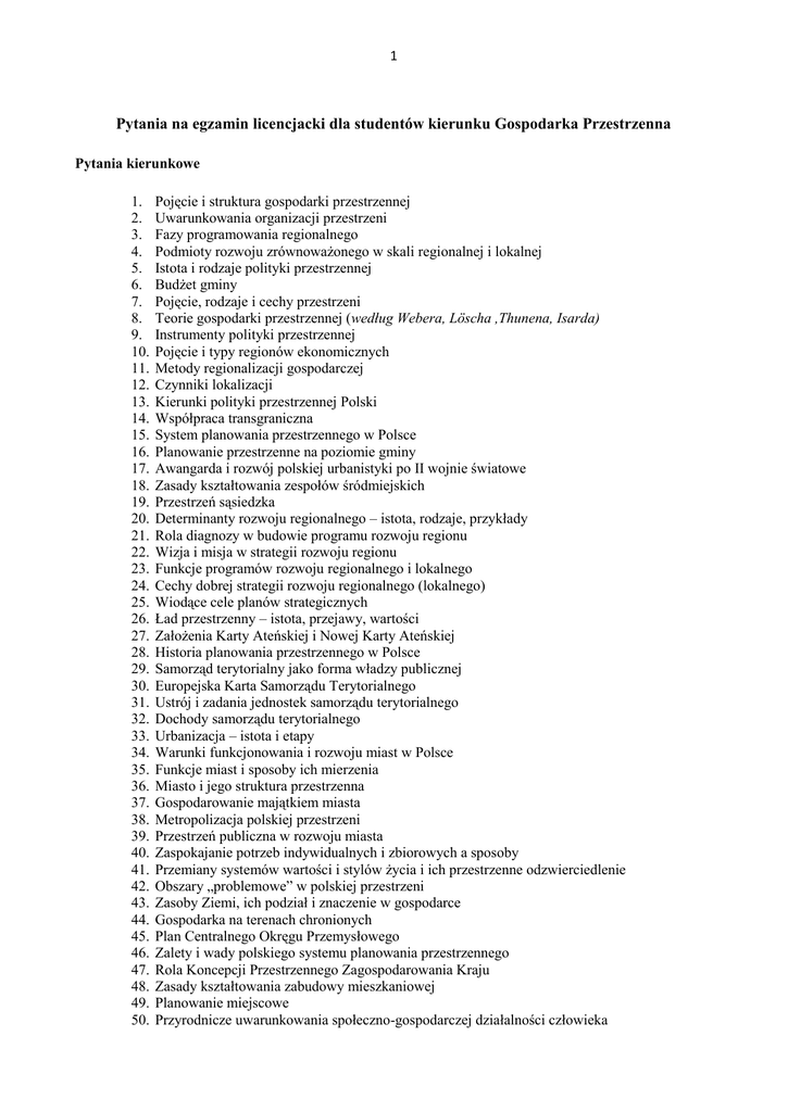 1 Pytania na egzamin licencjacki dla studentów kierunku Gospodarka Przestrzenna Pytania kierunkowe 1. 2. 3. 4. 5. 6. 7. 8. 9. 10. 11. 12. 13. 14. 15. 16. 17. 18. 19. 20. 21. 22. 23. 24. 25. 26. 27. 28. 29. 30. 31. 32. 33. 34. 35. 36. 37. 38. 39. 40. 41. 42. 43. 44. 45. 46. 47. 48. 49. 50. Pojęcie i struktura gospodarki przestrzennej Uwarunkowania organizacji przestrzeni Fazy programowania regionalnego Podmioty rozwoju zrównoważonego w skali regionalnej i lokalnej Istota i rodzaje polityki przestrzennej Budżet gminy Pojęcie, rodzaje i cechy przestrzeni Teorie gospodarki przestrzennej (według Webera, Löscha ,Thunena, Isarda) Instrumenty polityki przestrzennej Pojęcie i typy regionów ekonomicznych Metody regionalizacji gospodarczej Czynniki lokalizacji Kierunki polityki przestrzennej Polski Współpraca transgraniczna System planowania przestrzennego w Polsce Planowanie przestrzenne na poziomie gminy Awangarda i rozwój polskiej urbanistyki po II wojnie światowe Zasady kształtowania zespołów śródmiejskich Przestrzeń sąsiedzka Determinanty rozwoju regionalnego – istota, rodzaje, przykłady Rola diagnozy w budowie programu rozwoju regionu Wizja i misja w strategii rozwoju regionu Funkcje programów rozwoju regionalnego i lokalnego Cechy dobrej strategii rozwoju regionalnego (lokalnego) Wiodące cele planów strategicznych Ład przestrzenny – istota, przejawy, wartości Założenia Karty Ateńskiej i Nowej Karty Ateńskiej Historia planowania przestrzennego w Polsce Samorząd terytorialny jako forma władzy publicznej Europejska Karta Samorządu Terytorialnego Ustrój i zadania jednostek samorządu terytorialnego Dochody samorządu terytorialnego Urbanizacja – istota i etapy Warunki funkcjonowania i rozwoju miast w Polsce Funkcje miast i sposoby ich mierzenia Miasto i jego struktura przestrzenna Gospodarowanie majątkiem miasta Metropolizacja polskiej przestrzeni Przestrzeń publiczna w rozwoju miasta Zaspokajanie potrzeb indywidualnych i zbiorowych a sposoby Przemiany systemów wartości i stylów życia i ich przestrzenne odzwierciedlenie Obszary „problemowe” w polskiej przestrzeni Zasoby Ziemi, ich podział i znaczenie w gospodarce Gospodarka na terenach chronionych Plan Centralnego Okręgu Przemysłowego Zalety i wady polskiego systemu planowania przestrzennego Rola Koncepcji Przestrzennego Zagospodarowania Kraju Zasady kształtowania zabudowy mieszkaniowej Planowanie miejscowe Przyrodnicze uwarunkowania społeczno-gospodarczej działalności człowieka 2 Literatura zalecana: 1. Domański R., Gospodarka przestrzenna. Podstawy teoretyczne, wyd. nauk. PWN, Warszawa 2006. 2. Gaczek W.M., Zarządzanie w gospodarce przestrzennej, Wydawnictwo Branta, BydgoszczPoznań 2003. 3. Gospodarka regionalna i lokalna, pod red. Strzelecki Z., wyd. nauk. PWN, Warszawa 2008. 4. Harańczyk A., Samorząd terytorialny, Organizacja i gospodarka, Wydawnictwo UEK, Kraków 2010. 5. Karwińska A., Gospodarka przestrzenna. Uwarunkowania społeczno-kulturowe, PWN, Warszawa 2008. 6. Kudłacz T., Programowanie rozwoju regionalnego, PWN, Warszawa 1999. 7. Luchter B., Przyrodnicze podstawy gospodarowania, Wydawnictwo Uniwersytetu Ekonomicznego w Krakowie, Kraków 2009. 8. Potoczek A., Polityka regionalna i gospodarka przestrzenna, Agencja TNOiK, Toruń 2003. 9. Szymla Z., Determinanty rozwoju regionalnego, Ossolineum, Wrocław-Warszawa-Kraków 2000. 3 Pytania na egzamin licencjacki dla studentów kierunku Gospodarka Przestrzenna Pytania specjalnościowe: Strategie rozwoju regionalnego 1. Istota rozwoju zrównoważonego i cele jego wdrażania 2. Zasady rozwoju zrównoważonego 3. Skutki powiązań gospodarki ze środowiskiem naturalnym jako przesłanki wdrażania koncepcji rozwoju zrównoważonego 4. Narzędzia wdrażania założeń idei ekorozwoju 5. Czynniki kształtujące konsumpcję gospodarstw domowych 6. Wzrost gospodarczy a przemiany konsumpcji – wzajemne związki 7. Ekonomiczne i społeczno-kulturowe funkcje konsumpcji 8. Prawidłowości rozwoju konsumpcji 9. Nowe zjawiska i tendencje w konsumpcji społeczeństw wysoko rozwiniętych 10. Sprzężenia przestrzenne w turystyce 11. Efekty rozwoju turystyki na obszarach recepcji turystycznej 12. Mierniki rozwoju regionalnego 13. Efekty mnożnikowe w turystyce 14. Trendy współczesnej turystyki 15. Funkcja ekonomiczna turystyki i jej płaszczyzny 16. Polityka zatrudnienia – jej istota, cele i podmioty 17. Rynek pracy i jego segmentacja 18. Popyt na pracę i podaż świadczeń pracy – istota i czynniki 19. Europejska Strategia Zatrudnienia – geneza i cele 20. Instytucje i instrumenty rynku pracy 21. Istota polityki demograficznej i przykłady jej stosowania we współczesnym świecie 22. Mniejszości narodowościowe i etniczne w Polsce 23. Istota i cechy przedsiębiorstw publicznych 24. Istota metody GIS i możliwości jej wykorzystania 25. Pojęcie budżetu i jego podstawowe funkcje 26. Niewidzialny eksport w turystyce i jego zalety 27. Metody liczenia zagranicznego ruchu turystycznego 28. Regiony turystyczne świata i ich udział w ruchu turystycznym 29. Charakterystyka podatków i innych danin publicznych 30. Metody kartograficzne - konieczna pozycja literatury Literatura zalecana: 1. Fiedor B., Czaja S., Graczyk A., Podstawy ekonomii środowiska i zasobów naturalnych, Wyd. C.H. BECK, Warszawa 2002. 2. Gospodarka regionalna i lokalna, pod red. Z. Strzelecki, wyd. nauk. PWN, Warszawa 2008 3. Kabaj M., Strategie i programy przeciwdziałania bezrobociu w UE i w Polsce, Wyd. SCHOLAR, Warszawa 2004. 4. Owsiak S., Finanse publiczne. Teoria i praktyka, PWN, 2009. 5. Piontek B., Koncepcja rozwoju zrównoważonego i trwałego Polski, Wyd. PWN, Warszawa 2002. 6. System finansowania ochrony środowiska w Polsce, pod red. J. Famielec, Wyd. AE, Kraków 2005. 7. T. Kudłacz, Programowanie rozwoju regionalnego, PWN, Warszawa 1999. 8. Turystyka, red. Wł. Kurek, PWN, Warszawa 2007. 9. Wrona J., Geografia ludności świata i Polski, Wydawnictwo UEK