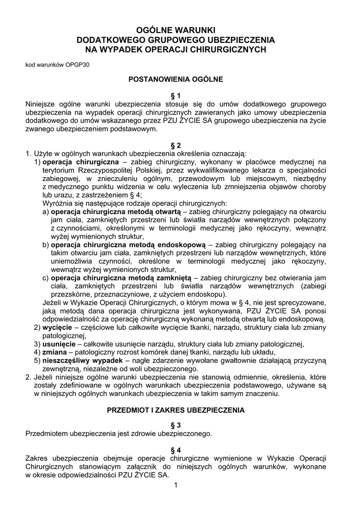 OGÓLNE WARUNKI DODATKOWEGO GRUPOWEGO UBEZPIECZENIA NA WYPADEK OPERACJI CHIRURGICZNYCH kod warunków OPGP30 POSTANOWIENIA OGÓLNE §1 Niniejsze ogólne warunki ubezpieczenia stosuje się do umów dodatkowego grupowego ubezpieczenia na wypadek operacji chirurgicznych zawieranych jako umowy ubezpieczenia dodatkowego do umów wskazanego przez PZU ŻYCIE SA grupowego ubezpieczenia na życie zwanego ubezpieczeniem podstawowym. §2 1. Użyte w ogólnych warunkach ubezpieczenia określenia oznaczają: 1) operacja chirurgiczna – zabieg chirurgiczny, wykonany w placówce medycznej na terytorium Rzeczypospolitej Polskiej, przez wykwalifikowanego lekarza o specjalności zabiegowej, w znieczuleniu ogólnym, przewodowym lub miejscowym, niezbędny z medycznego punktu widzenia w celu wyleczenia lub zmniejszenia objawów choroby lub urazu, z zastrzeżeniem § 4; Wyróżnia się następujące rodzaje operacji chirurgicznych: a) operacja chirurgiczna metodą otwartą – zabieg chirurgiczny polegający na otwarciu jam ciała, zamkniętych przestrzeni lub światła narządów wewnętrznych połączony z czynnościami, określonymi w terminologii medycznej jako rękoczyny, wewnątrz wyżej wymienionych struktur, b) operacja chirurgiczna metodą endoskopową – zabieg chirurgiczny polegający na takim otwarciu jam ciała, zamkniętych przestrzeni lub narządów wewnętrznych, które uniemożliwia czynności, określone w terminologii medycznej jako rękoczyny, wewnątrz wyżej wymienionych struktur, c) operacja chirurgiczna metodą zamkniętą – zabieg chirurgiczny bez otwierania jam ciała, zamkniętych przestrzeni lub światła narządów wewnętrznych (zabiegi przezskórne, przeznaczyniowe, z użyciem endoskopu). Jeżeli w Wykazie Operacji Chirurgicznych, o którym mowa w § 4, nie jest sprecyzowane, jaką metodą dana operacja chirurgiczna jest wykonywana, PZU ŻYCIE SA ponosi odpowiedzialność za operację chirurgiczną wykonaną metodą otwartą lub endoskopową. 2) wycięcie – częściowe lub całkowite wycięcie tkanki, narządu, struktury ciała lub zmiany patologicznej, 3) usunięcie – całkowite usunięcie narządu, struktury ciała lub zmiany patologicznej, 4) zmiana – patologiczny rozrost komórek danej tkanki, narządu lub układu, 5) nieszczęśliwy wypadek – nagłe zdarzenie wywołane gwałtownie działającą przyczyną zewnętrzną, niezależne od woli ubezpieczonego. 2. Jeżeli niniejsze ogólne warunki ubezpieczenia nie stanowią odmiennie, określenia, które zostały zdefiniowane w ogólnych warunkach ubezpieczenia podstawowego, używane są w niniejszych ogólnych warunkach ubezpieczenia w takim samym znaczeniu. PRZEDMIOT I ZAKRES UBEZPIECZENIA §3 Przedmiotem ubezpieczenia jest zdrowie ubezpieczonego. §4 Zakres ubezpieczenia obejmuje operacje chirurgiczne wymienione w Wykazie Operacji Chirurgicznych stanowiącym załącznik do niniejszych ogólnych warunków, wykonane w okresie odpowiedzialności PZU ŻYCIE SA. 1 §5 1. PZU ŻYCIE SA wypłaca świadczenie, po wykonaniu operacji chirurgicznej, zgodnie z klasyfikacją zawartą w Wykazie Operacji Chirurgicznych, w wysokości: 1) 50% sumy ubezpieczenia – w przypadku operacji chirurgicznej I klasy, 2) 30% sumy ubezpieczenia – w przypadku operacji chirurgicznej II klasy, 3) 10% sumy ubezpieczenia – w przypadku operacji chirurgicznej III klasy. 2. Wysokość należnego świadczenia ustalana jest na podstawie wysokości sumy ubezpieczenia aktualnej w dniu wykonania operacji chirurgicznej. ZAWARCIE UMOWY I PRZYSTĘPOWANIE DO UBEZPIECZENIA §6 Umowa ubezpieczenia dodatkowego może zostać zawarta wraz z zawarciem umowy ubezpieczenia podstawowego albo w dowolnym momencie jej trwania. §7 1. Do ubezpieczenia mogą przystąpić ubezpieczeni objęci ubezpieczeniem podstawowym, którzy w dniu złożenia deklaracji przystąpienia nie ukończyli 64. roku życia i którzy nie otrzymali wcześniej świadczeń z tytułu operacji chirurgicznych w przypadkach i w wysokości określonej w § 16 ust. 2 albo ust. 3. 2. Osoby spełniające wymogi określone w ust. 1 stanowią grupę. 3. Umowa może zostać zawarta, jeżeli w grupie liczącej: 1) od 3 do 15 osób – deklaracje przystąpienia złoży 100% grupy, 2) od 16 do 100 osób – deklaracje przystąpienia złoży co najmniej 75% grupy, 3) powyżej 100 osób – deklaracje przystąpienia złoży co najmniej 60% grupy. §8 W przypadku przedłużenia umowy ubezpieczenia dodatkowego na kolejny okres, nie jest wymagane ponowne złożenie deklaracji przystąpienia. CZAS TRWANIA UMOWY §9 1. Umowa ubezpieczenia dodatkowego zawierana jest na 1 rok, z tym że jeżeli jest zawierana pomiędzy rocznicami polisy, zostaje zawarta na okres do najbliższej rocznicy polisy. 2. Umowa ubezpieczenia dodatkowego zostaje przedłużona na kolejne okresy roczne, o ile obowiązuje umowa ubezpieczenia podstawowego i żadna ze stron nie postanowi inaczej, z tym że oświadczenie wyrażające wolę nieprzedłużenia umowy ubezpieczenia dodatkowego na kolejny okres powinno być złożone do wiadomości drugiej strony na piśmie na 30 dni przed upływem okresu, na jaki umowa ubezpieczenia dodatkowego została zawarta. WYPOWIEDZENIE UMOWY § 10 1. Zasady wypowiedzenia umowy ubezpieczenia dodatkowego są zgodne z zasadami przyjętymi w ubezpieczeniu podstawowym. 2. Wypowiedzenie umowy ubezpieczenia podstawowego skutkuje wypowiedzeniem umowy ubezpieczenia dodatkowego. 3. Wypowiedzenie umowy ubezpieczenia dodatkowego nie skutkuje wypowiedzeniem umowy ubezpieczenia podstawowego. 2 SUMA UBEZPIECZENIA § 11 Wysokość sumy ubezpieczenia określona jest we wniosku o zawarcie umowy w poniższych granicach i potwierdzona polisą: 1) suma minimalna – 2-krotna wysokość przeciętnego miesięcznego wynagrodzenia, 2) suma maksymalna – 10-krotna wysokość przeciętnego miesięcznego wynagrodzenia, z tym że nie wyższa niż suma ubezpieczenia w ubezpieczeniu podstawowym. SKŁADKA § 12 1. Wysokość składki określa PZ