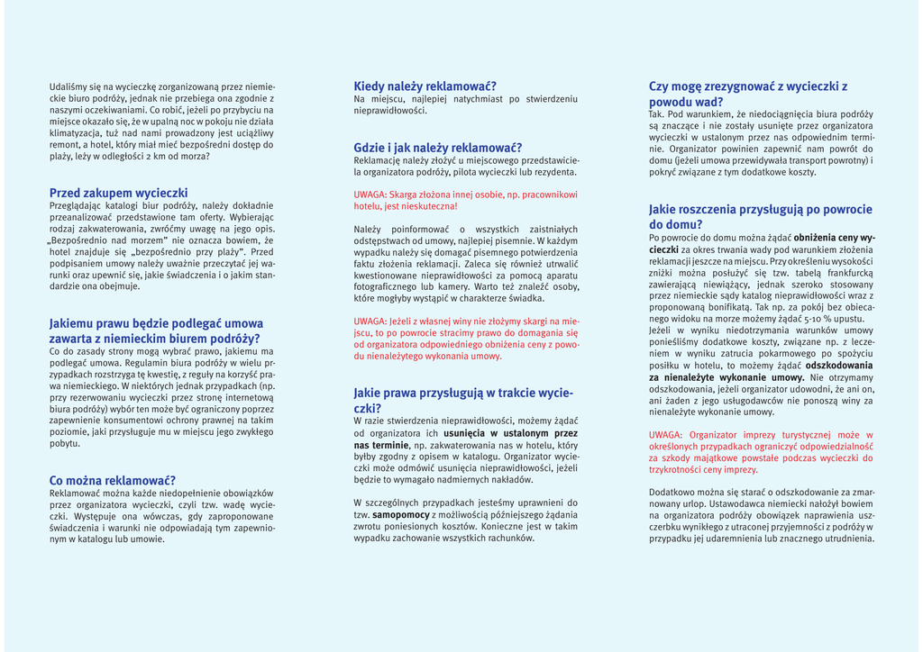 Udaliśmy się na wycieczkę zorganizowaną przez niemieckie biuro podróży, jednak nie przebiega ona zgodnie z naszymi oczekiwaniami. Co robić, jeżeli po przybyciu na miejsce okazało się, że w upalną noc w pokoju nie działa klimatyzacja, tuż nad nami prowadzony jest uciążliwy remont, a hotel, który miał mieć bezpośredni dostęp do plaży, leży w odległości 2 km od morza? Przed zakupem wycieczki Przeglądając katalogi biur podróży, należy dokładnie przeanalizować przedstawione tam oferty. Wybierając rodzaj zakwaterowania, zwróćmy uwagę na jego opis. „Bezpośrednio nad morzem” nie oznacza bowiem, że hotel znajduje się „bezpośrednio przy plaży”. Przed podpisaniem umowy należy uważnie przeczytać jej warunki oraz upewnić się, jakie świadczenia i o jakim standardzie ona obejmuje. Jakiemu prawu bêdzie podlegaæ umowa zawarta z niemieckim biurem podró¿y? Co do zasady strony mogą wybrać prawo, jakiemu ma podlegać umowa. Regulamin biura podróży w wielu przypadkach rozstrzyga tę kwestię, z reguły na korzyść prawa niemieckiego. W niektórych jednak przypadkach (np. przy rezerwowaniu wycieczki przez stronę internetową biura podróży) wybór ten może być ograniczony poprzez zapewnienie konsumentowi ochrony prawnej na takim poziomie, jaki przysługuje mu w miejscu jego zwykłego pobytu. Kiedy nale¿y reklamowaæ? Na miejscu, najlepiej natychmiast po stwierdzeniu nieprawidłowości. Gdzie i jak nale¿y reklamowaæ? Reklamację należy złożyć u miejscowego przedstawiciela organizatora podróży, pilota wycieczki lub rezydenta. UWAGA: Skarga złożona innej osobie, np. pracownikowi hotelu, jest nieskuteczna! Należy poinformować o wszystkich zaistniałych odstępstwach od umowy, najlepiej pisemnie. W każdym wypadku należy się domagać pisemnego potwierdzenia faktu złożenia reklamacji. Zaleca się również utrwalić kwestionowane nieprawidłowości za pomocą aparatu fotograficznego lub kamery. Warto też znaleźć osoby, które mogłyby wystąpić w charakterze świadka. UWAGA: Jeżeli z własnej winy nie złożymy skargi na miejscu, to po powrocie stracimy prawo do domagania się od organizatora odpowiedniego obniżenia ceny z powodu nienależytego wykonania umowy. Jakie prawa przys³uguj¹ w trakcie wycieczki? Co mo¿na reklamowaæ? W razie stwierdzenia nieprawidłowości, możemy żądać od organizatora ich usuniêcia w ustalonym przez nas terminie, np. zakwaterowania nas w hotelu, który byłby zgodny z opisem w katalogu. Organizator wycieczki może odmówić usunięcia nieprawidłowości, jeżeli będzie to wymagało nadmiernych nakładów. Reklamować można każde niedopełnienie obowiązków przez organizatora wycieczki, czyli tzw. wadę wycieczki. Występuje ona wówczas, gdy zaproponowane świadczenia i warunki nie odpowiadają tym zapewnionym w katalogu lub umowie. W szczególnych przypadkach jesteśmy uprawnieni do tzw. samopomocy z możliwością późniejszego żądania zwrotu poniesionych kosztów. Konieczne jest w takim wypadku zachowanie wszystkich rachunków. Czy mogê zrezygnowaæ z wycieczki z powodu wad? Tak. Pod warunkiem, że niedociągnięcia biura podróży są znaczące i nie zostały usunięte przez organizatora wycieczki w ustalonym przez nas odpowiednim terminie. Organizator powinien zapewnić nam powrót do domu (jeżeli umowa przewidywała transport powrotny) i pokryć związane z tym dodatkowe koszty. Jakie roszczenia przys³uguj¹ po powrocie do domu? Po powrocie do domu można żądać obni¿enia ceny wycieczki za okres trwania wady pod warunkiem złożenia reklamacji jeszcze na miejscu. Przy określeniu wysokości zniżki można posłużyć się tzw. tabelą frankfurcką zawierającą niewiążący, jednak szeroko stosowany przez niemieckie sądy katalog nieprawidłowości wraz z proponowaną bonifikatą. Tak np. za pokój bez obiecanego widoku na morze możemy żądać 5-10 % upustu. Jeżeli w wyniku niedotrzymania warunków umowy ponieśliśmy dodatkowe koszty, związane np. z leczeniem w wyniku zatrucia pokarmowego po spożyciu posiłku w hotelu, to możemy żądać odszkodowania za nienale¿yte wykonanie umowy. Nie otrzymamy odszkodowania, jeżeli organizator udowodni, że ani on, ani żaden z jego usługodawców nie ponoszą winy za nienależyte wykonanie umowy. UWAGA: Organizator imprezy turystycznej może w określonych przypadkach ograniczyć odpowiedzialność za szkody majątkowe powstałe podczas wycieczki do trzykrotności ceny imprezy. Dodatkowo można się starać o odszkodowanie za zmarnowany urlop. Ustawodawca niemiecki nałożył bowiem na organizatora podróży obowiązek naprawienia uszczerbku wynikłego z utraconej przyjemności z podróży w przypadku jej udaremnienia lub znacznego utrudnienia. UDZIELAMY PORAD KOMPETENTNIE. BEZP£ATNIE. NIEZALE¯NIE Czy wi¹¿¹ mnie jakieœ terminy? Roszczenie o obniżenie ceny, o zwrot nakładów, jak również roszczenia odszkodowawcze należy zgłosić u organizatora wycieczki w ciągu jednego miesiąca od planowanego powrotu z wycieczki. Późniejsze zgłoszenia nie będą rozpatrywane. UWAGA: Roszczenia należy kierować wyłącznie do organizatora wycieczki. Jeżeli biuro podróży, w którym wykupiliśmy wycieczkę, było jedynie pośrednikiem lub agentem, to nie będzie ono adresatem naszych żądań. Frankfurt nad Odr¹ Do kogo mogê zwróciæ siê o pomoc? W przypadku dalszych pytań lub problemów związanych z nieudaną wycieczką zorganizowaną przez niemieckie biuro podróży należy się zgłosić do Polsko-Niemieckiego Centrum Informacji Konsumenckiej. Każdy, kto do nas przyjdzie, zadzwoni lub napisze, może liczyć na bezpłatną poradę nie tylko w tej kwestii, lecz również w zakresie każdej transgranicznej sprawy konsumenckiej. Nasi prawnicy pomogą w pozasądowym dochodzeniu praw polskich konsumentów na niemieckim rynku. W razie potrzeby wystąpią w imieniu konsumenta do niemieckiego przedsiębiorcy z konkretnymi ż