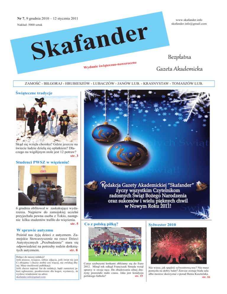 Nr 7, 9 grudnia 2010 – 12 stycznia 2011 r e d n a f a k S Nakład: 5000 sztuk oworoczne iąteczno-n Wydanie św www.skafander.info [email protected] Bezpłatna Gazeta Akademicka ZAMOŚĆ - BIŁGORAJ - HRUBIESZÓW - LUBACZÓW - JANÓW LUB. - KRASNYSTAW - TOMASZÓW LUB. Świąteczne tradycje Skąd się wzięła choinka? Gdzie jeszcze na świecie ludzie dzielą się opłatkiem? Dlaczego na wigilijnym stole jest 12 potraw? str. 3 Studenci PWSZ w więzieniu! 6 grudnia obfitował w zaskakujące wydarzenia. Najpierw do zamojskiej uczelni przyjechała pewna osoba z Tokio, następnie kilku studentów trafiło do więzienia. str. 5 Co z polską piłką? Sylwester 2010 Coraz szybszymi krokami zbliżamy się do Euro 2012. Minął rok odkąd Franciszek Smuda wziął sprawy w swoje ręce. Do zbudowania silnej drużyny pozostało mało czasu. Jaka jest kondycja polskiego futbolu? str. 15 Nie wiesz, jak spędzić sylwestrową noc? Nie masz pomysłu na dobry balet? Zawsze zostaje biała sala albo możesz skorzystać z porad Henia Kusztelaka. str. 16 W sprawie autyzmu Pośród nas żyją dzieci z autyzmem. Zamojskie Stowarzyszenie na rzecz Dzieci Autystycznych „Przebudzenie” stara się odpowiedzieć na potrzeby rodzin dotkniętych autyzmem. str. 8 Dołącz do naszej redakcji! Jeśli piszesz, rysujesz, robisz zdjęcia, jeśli świat nie jest Ci obojętny i chcesz zrobić coś więcej, nie zwlekaj dłużej. Masz możliwość publikacji. Jeśli chcesz napisać list do redakcji, bądź zamieścić jakieś ogłoszenie, pozdrowienie dla kogoś, wystarczy, że wyślesz wiadomość na adres: [email protected] 2 www.skafander.info Listy do redakcji *** Witam, Czytając Waszą gazetę, która jest promowana na szeroką skalę, mam wielką prośbę. Skierujmy taki apel do ludzi: „Serce ma ten, kto ma je dla innych”. „Oddając własną krew, dobrowolnie i bezinteresownie, to gest o wysokiej wartości moralnej i obywatelskiej. To DAR ŻYCIA… Niech dawcy krwi, którym należy się wdzięczność wszystkich, będą coraz liczniejsi we wszystkich częściach świata” – Jan Paweł II, Światowy Dzień Krwiodawców ‘2004 Kto może oddać krew? • osoby od 18 do 65 roku życia, które ważą, co najmniej 50 kilogramów; • osoby, u których w ciągu ostatnich 6 miesięcy nie wykonano tatuażu, przekłucia uszu lub innych części ciała; • osoby, które w ciągu ostatnich 6 miesięcy nie miały wykonanych diagnostycznych badań i zabiegów endoskopowych (gastroskopii, panendoskopii, artroskopii, laparoskopii); • osoby, które w ciągu ostatnich 6 miesięcy nie były leczone krwią lub jej składnikami. Opublikujmy to w gazecie, niech będzie to przykładem na to, że znajdują się ludzie, którym ludzkie życie nie jest obojętne. melanina *** Witam Drogich Naczelnych gazety, dzięki której spędzam miło czas podczas przerw w szkole! Muszę przyznać, że inicjatywa zrobienia gazety akademickiej to strzał w dziesiątkę. Żeby Wam nie słodzić od początku, to najpierw minusy. W numerze 6 Skafandra (który dostałem w sklepie! – rozwija się nie tylko w szkołach) jest poświęcone prawie dwie strony dla artykułu „Zamość podczas powstania listopadowego”. Nie twierdzę, że jest on nudny, lecz prosiłbym autora o przedstawienie tych informacji jakoś bardziej dla nas, w formie ciekawostek i troszkę krótszej długości. Wróćmy do plusów, podobają mi się felietony, gdyż można poczytać o tym jak ktoś inny myśli na temat kilku spraw:) Odnośnie felietonu Quo’r Shaq’a: kwestie tak wielkiej kuli ja sam nie rozumiem, lecz autor sam nie chce zobaczyć plusów renowacji miasta! Ratusz jest teraz piękny, Rynek Solny nareszcie nie jest parkingiem a Nadszaniec wygląda dostojnie! Nasze miasto musi się rozwijać a wpadki każdemu się zdarzają, ale widzieć tylko minusy jest dużo łatwiej. Odnośnie listu "Iks" to odpowiedz jest prosta: nic nie może się udać, jeśli marketing nie istnieje! Boli mnie, że plakaty zostały rozwieszone w ten sam dzień! Ponadto były prawie niewidoczne! Dodatkowo w Internecie była dezinformacja, gdyż wszędzie pisano, że ten festiwal został przeniesiony do innego miasta. U nas w Zamościu jest wielkie zainteresowanie muzyką alternatywną, lecz bez informacji nikt o takim koncercie nie będzie wiedział. Nie chcę też oceniać poziomu zespołów, które grały w tym roku, lecz na pewno nie nazwałbym tych marek mianem czołówki alternatywnego grania. Sądzę, że gdyby zagrał u nas np. Hunter czy Riverside bądź zespół „progów” TSA, to zainteresowanie byłoby większe, a dodać do tego dobrą promocję i mamy wielki udany festiwal! Tomasz z II LO Dla Weronisi Ile liści na drzewie, ile chmurek na niebie, ile w wierszu jest rymów, ilu ojciec ma synów, ile na choince igieł, ile helikopter ma śmigieł, Tyle życzę Ci miłości, ciepła, zdrowia, pomyślności By cudowne były święta i byś zawsze była uśmiechnięta. A te życzenia śle Ci Twój Misio:* S.C. Nie samym chlebem żyje człowiek... „Nie bójcie się! Oto zwiastuję wam radość wielką, która będzie udziałem całego narodu; dziś w mieście Dawida narodził się wam Zbawiciel, którym jest Mesjasz Pan. A to będzie znakiem dla was: Znajdziecie Niemowlę, owinięte w pieluszki i leżące w żłobie”. W nieustannym hałasie, jaki zewsząd nas otacza, jakby nie słychać dziś głosu anioła. A my jacyś tacy zalęknieni, zabiegani. A my jacyś tacy smutni. A przecież Sam Boży Syn przyszedł na ziemię. To niebywałe wydarzenie. To po prostu trudno pojąć. Tego się nie da zrozumieć. W to trzeba uwierzyć. A nie jest łatwo uwierzyć. Naprawdę uwierzyć. Pewien młody człowiek napisał maila, którego rozesłał do znajomych. Gdy w tych dniach wszyscy życzą sobie wszystkie dobrego, wesołych świąt itd., on wystukał na klawiaturze komputera dramatyczne słowa: Podobno Bóg się stał człowiekiem. No i co z tego? Mój ojciec nadal nie ma pracy. Moja